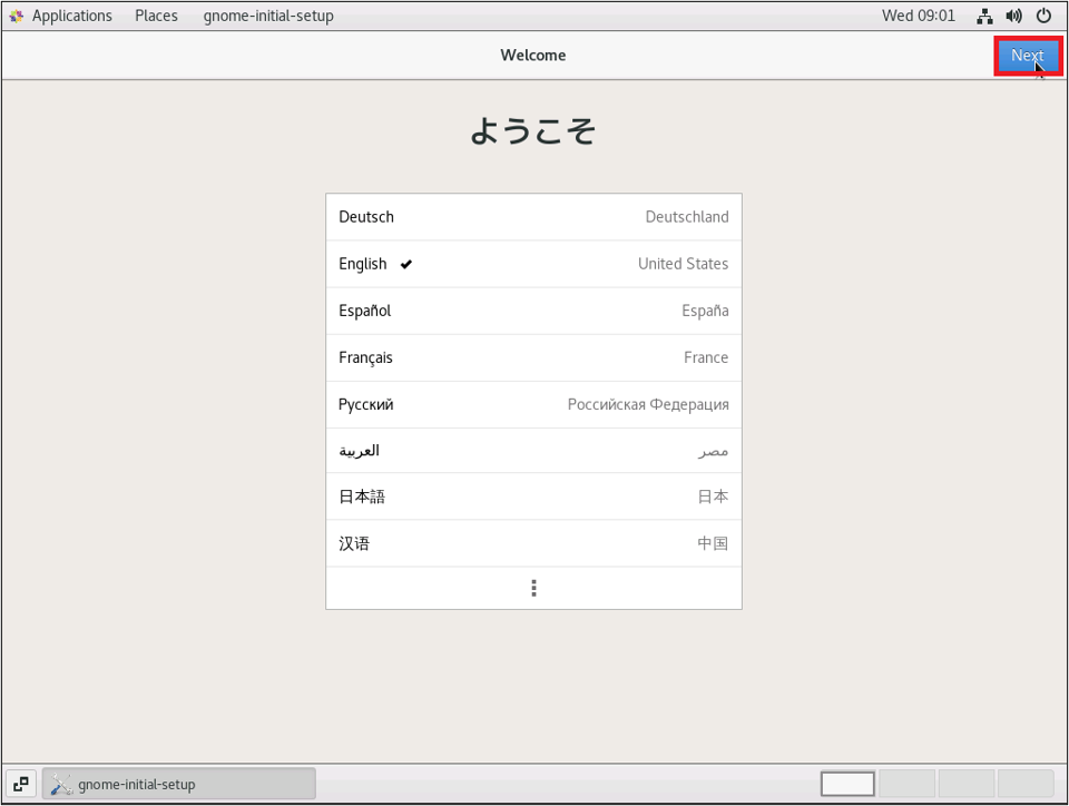 以下のようなデスクトップ画面が起動します。システム言語「English(United States)」にチェックが入っていることを確認し、「Next」をクリックします。