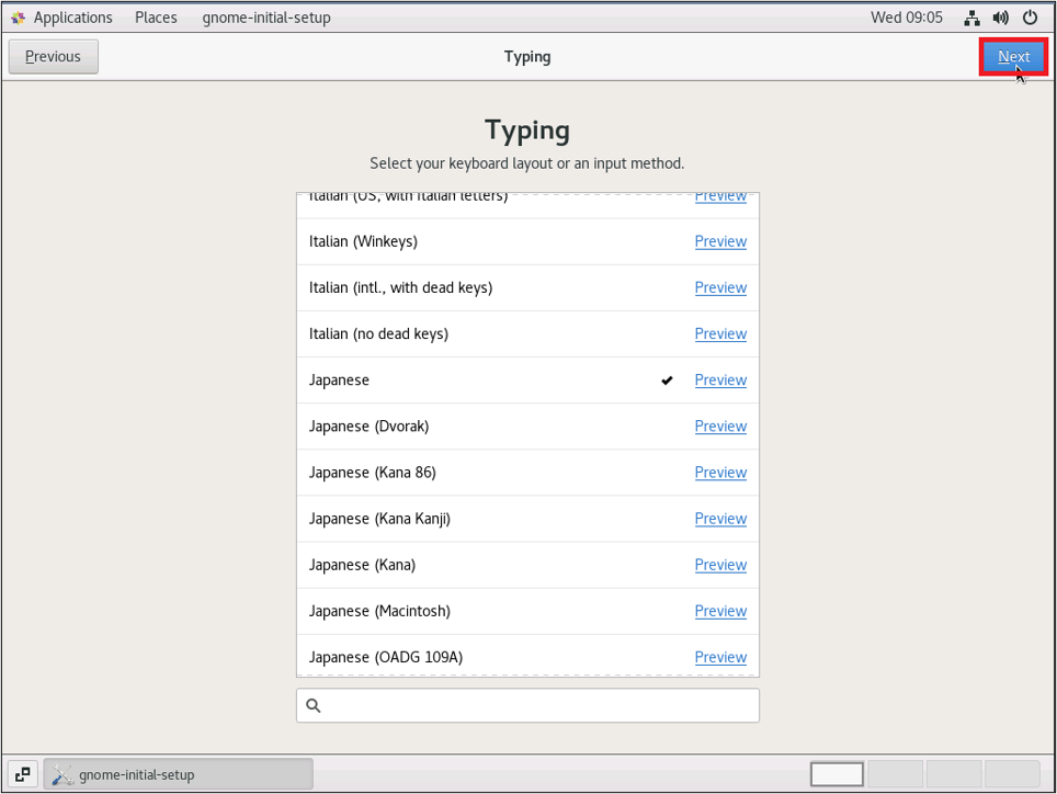 次に使用キーボードを選択します。下にスクロールさせ「Japanese」にチェックを入れ、「Next」をクリックします。