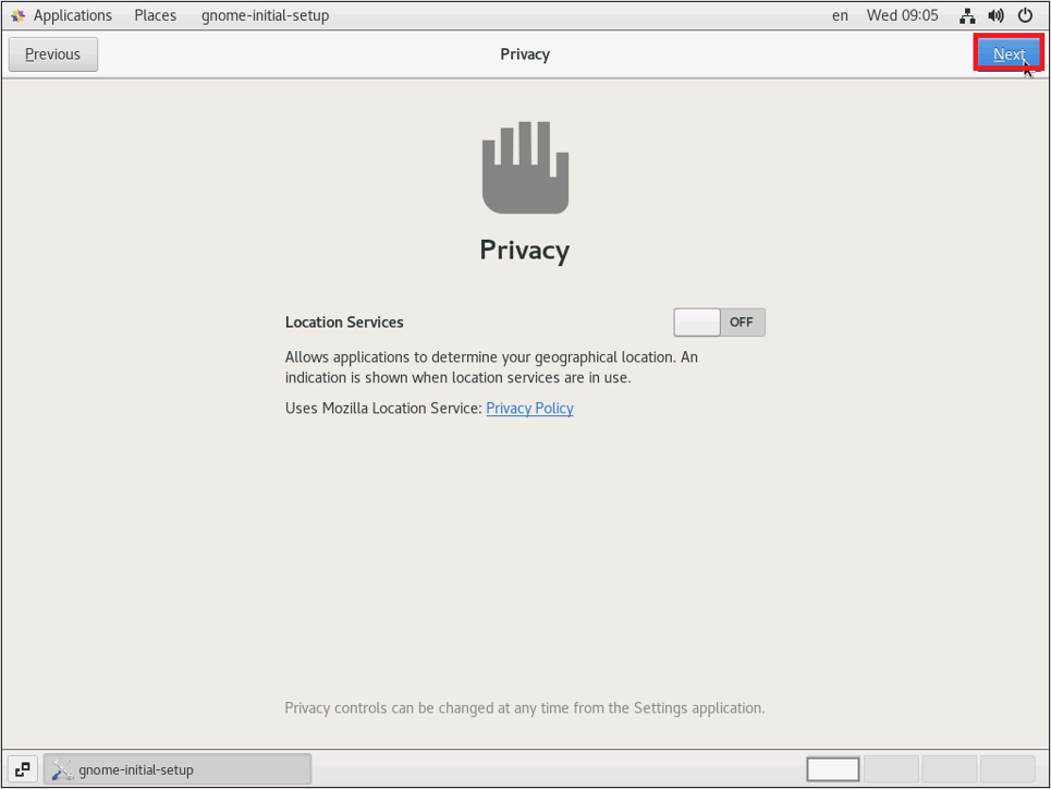 次にLocation ServiceのON/OFFを選択します。Location Serviceを「OFF」に切り替え、「Next」をクリックします。