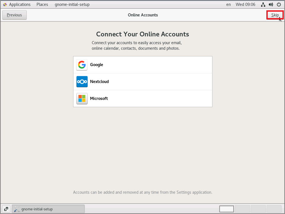 次にオンラインアカウントの選択をします。ここではオンラインアカウントは追加しませんので、「Skip」をクリックします。