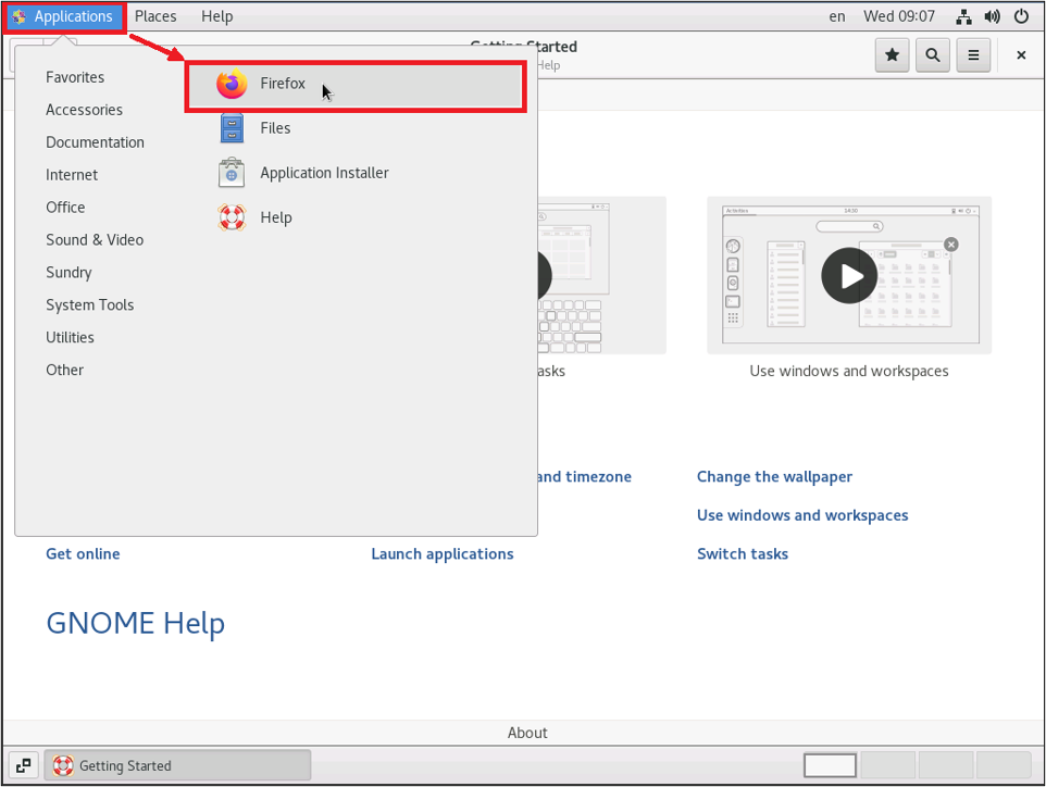 次にブラウザを起動させます。画面左上の「Applications」から「Firefox Web Browser」を選択します。