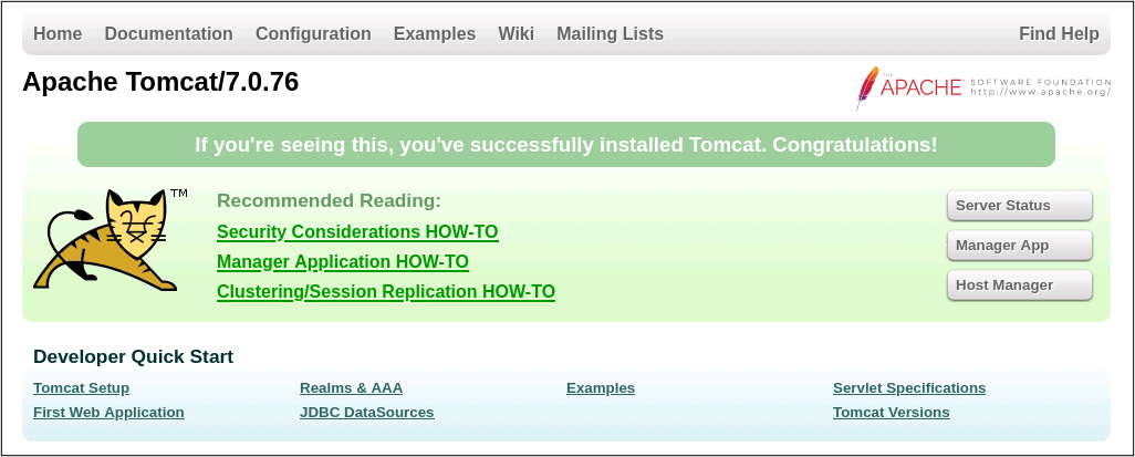 ブラウザのアドレス入力箇所に「localhost:8080」と入力します。下記の画面が表示されたらtomcatが正常に動作しています。