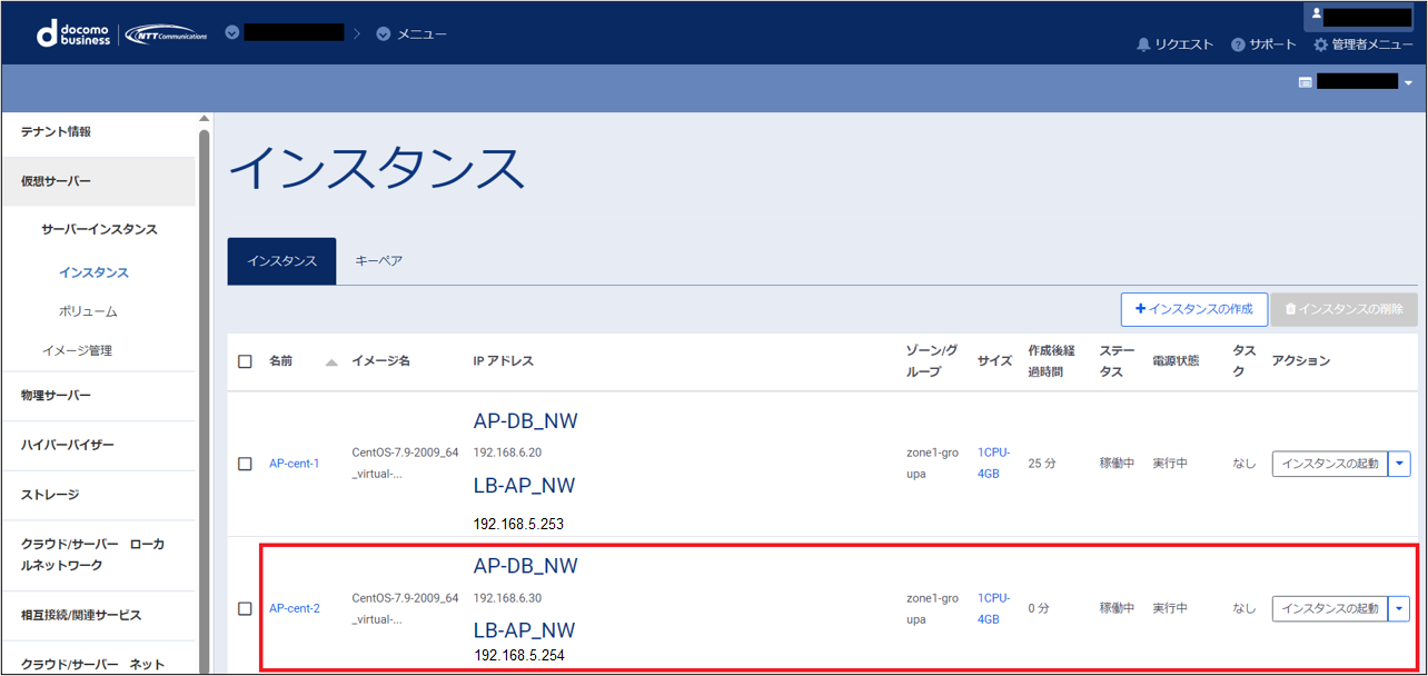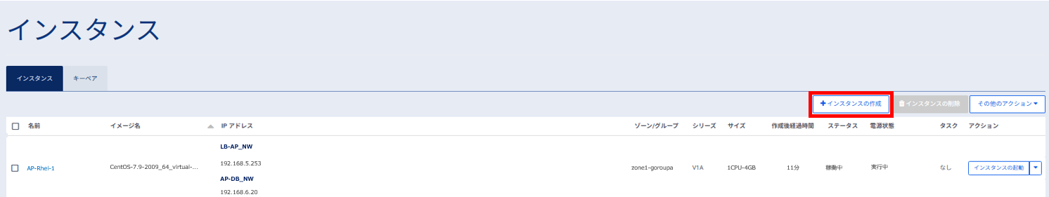 インスタンスの作成が完了すると、一覧画面に作成されたインスタンスがリストに追加されて表示されます。