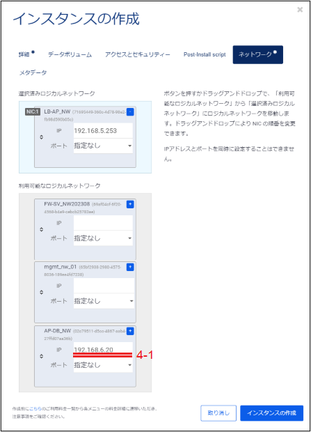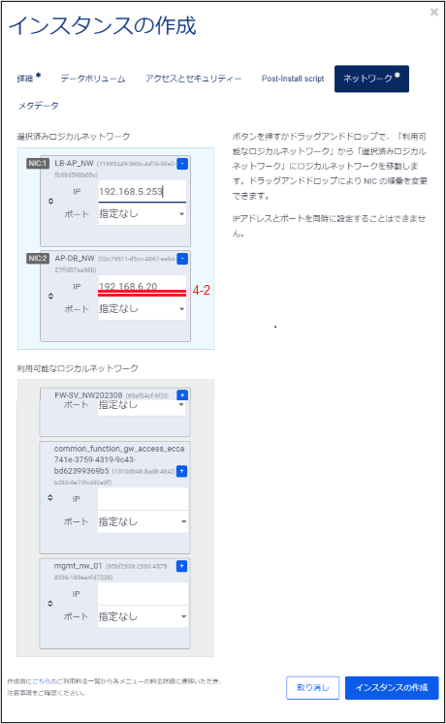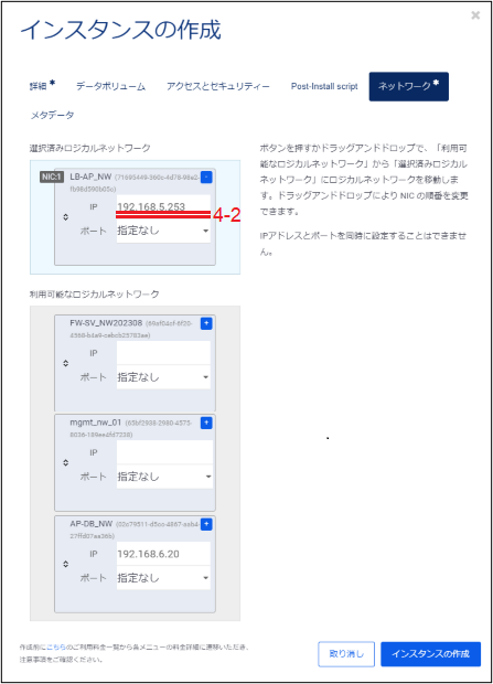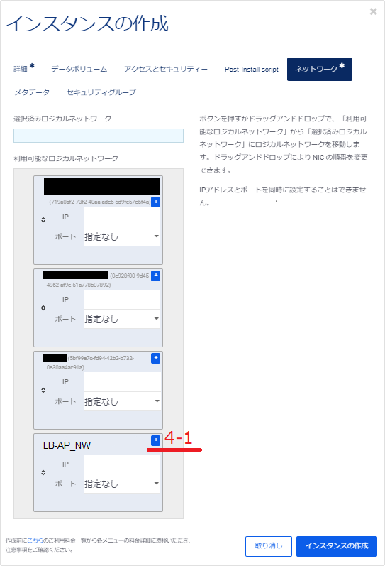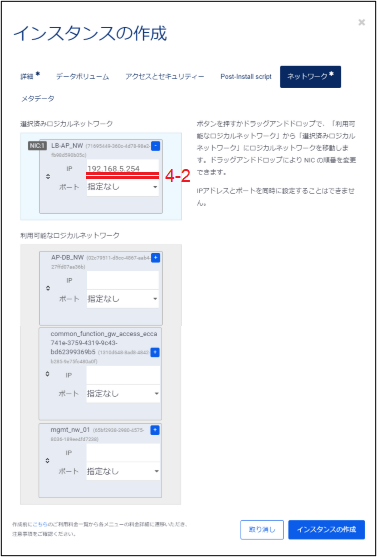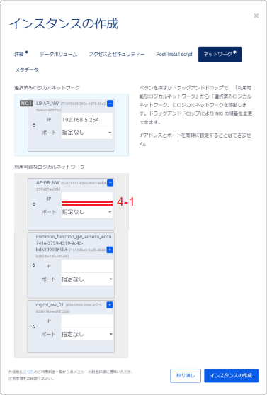 「利用可能なロジカルネットワーク」に表示されているロジカルネットワークの中からこのインスタンスが接続するものを選択し、ドラックアンドドロップで「選択済みロジカルネットワーク」に移動させます。