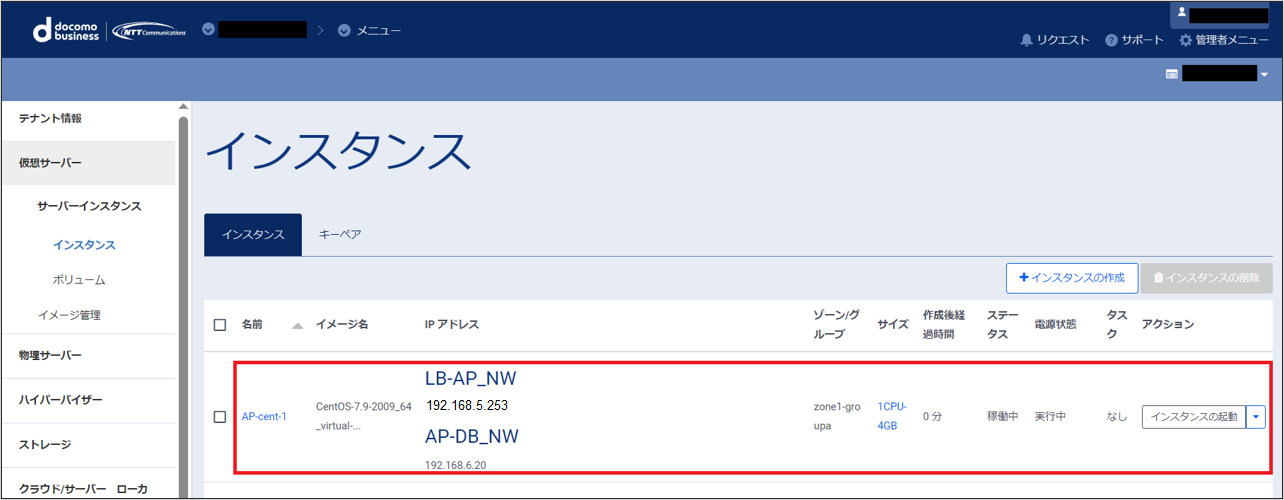 左ペインのメニューから「サーバーインスタンス」→「インスタンス」→「インスタンスの作成」を選択します。