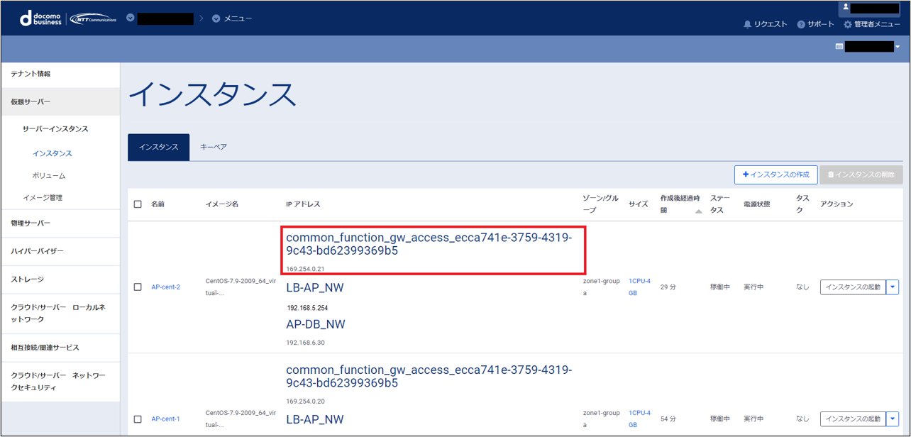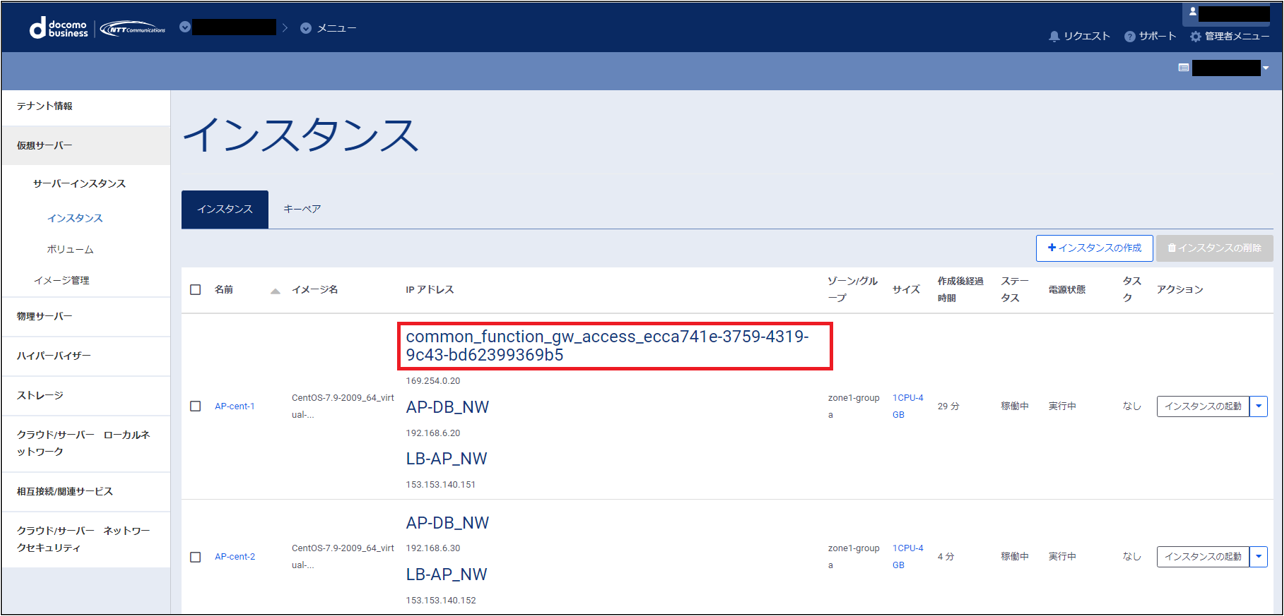 共通機能ゲートウェイで作成した共通機能ゲートウェイにインスタンスの接続を実施します。