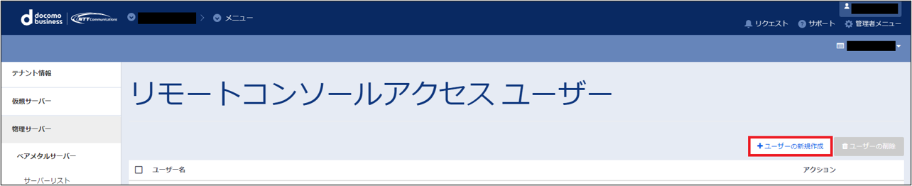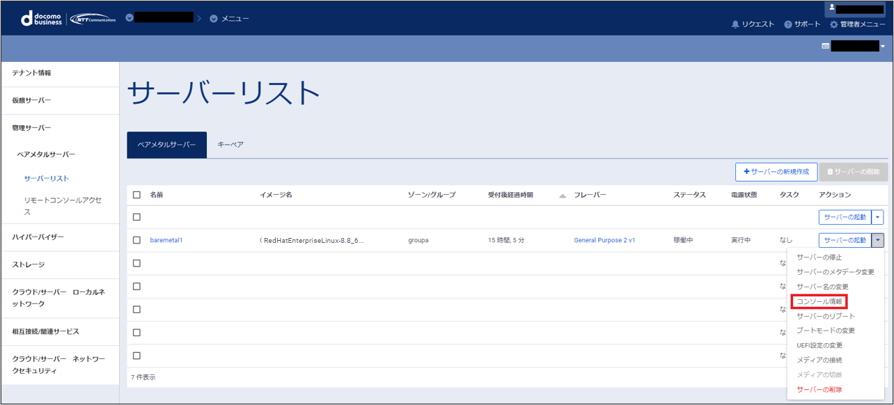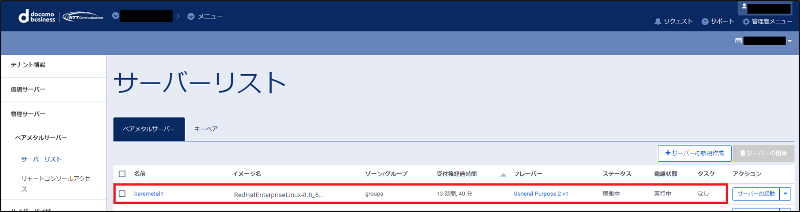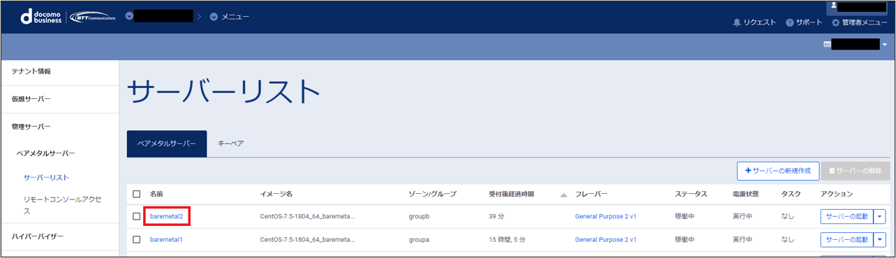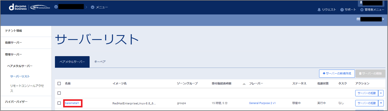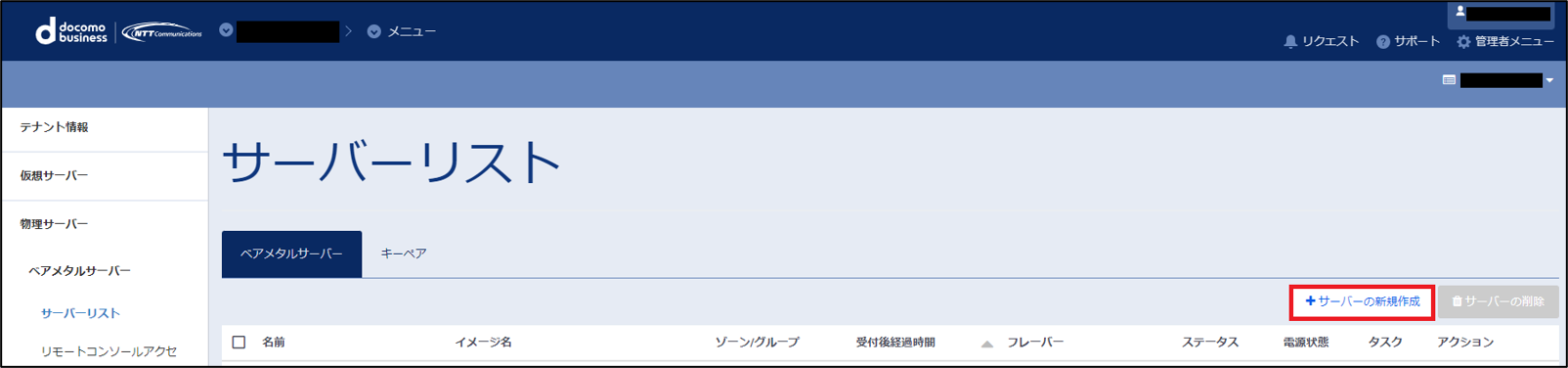 左ペインのメニューから「ベアメタルサーバー」→「サーバーリスト」→「サーバーの新規作成」を選択します。