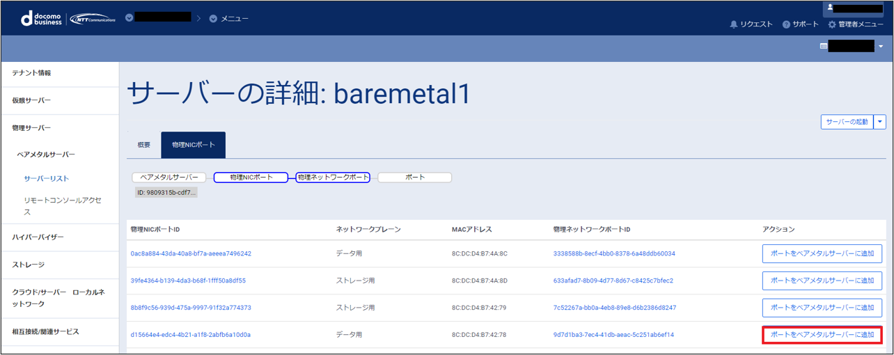 「ネットワーク」クリックし、ベアメタルサーバーと接続するネットワークを設定します。