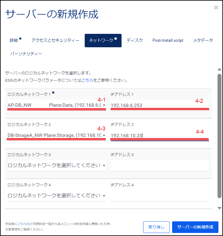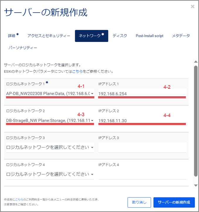 サーバーが属するネットワーク、およびIPアドレスの設定。事前にロジカルネットワークを作成しておく必要があります。 |