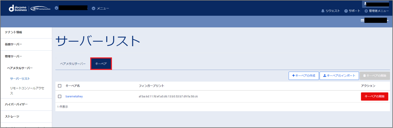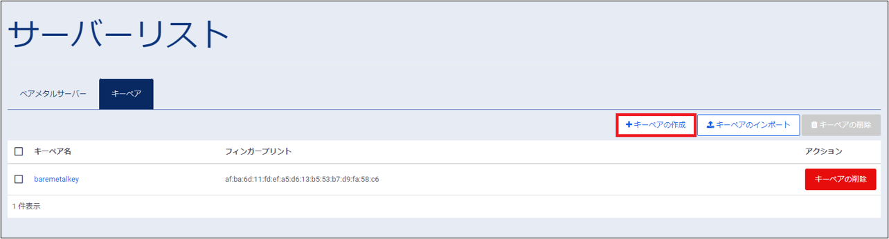 左ペインのメニューから「サーバーインスタンス」→「インスタンス」→「キーペア」を選択します。