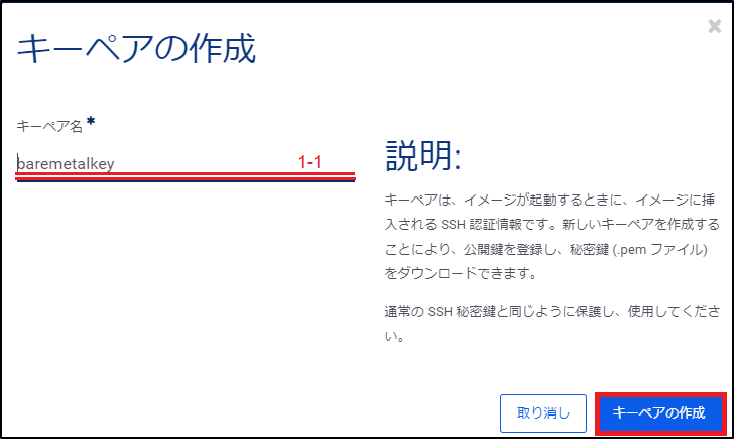 入力が完了したら、右下の「キーペアの作成」をクリックし、キーペアの作成を実行します。