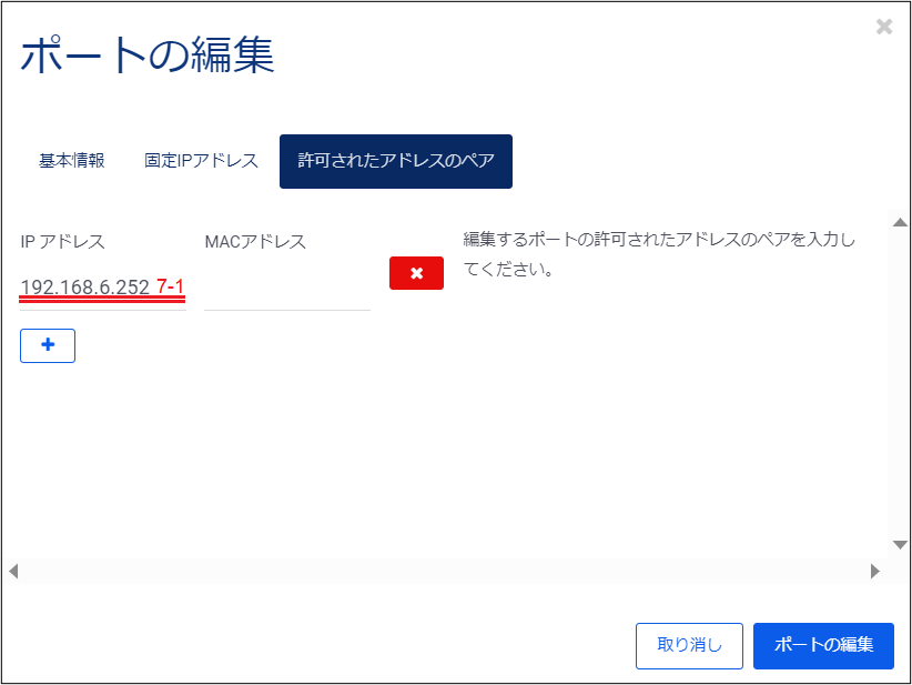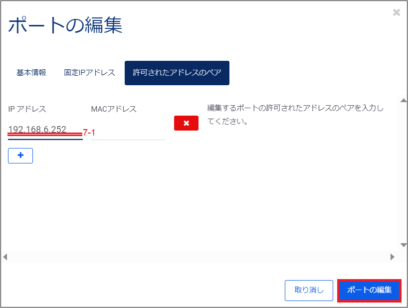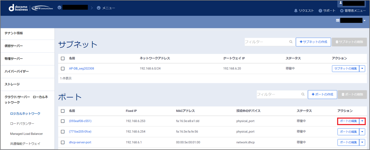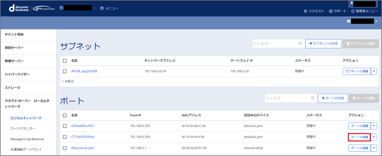 表示された画面のポート一覧に記載されている「Fixed IP 192.168.6.253」の「ポートの編集」をクリックします。