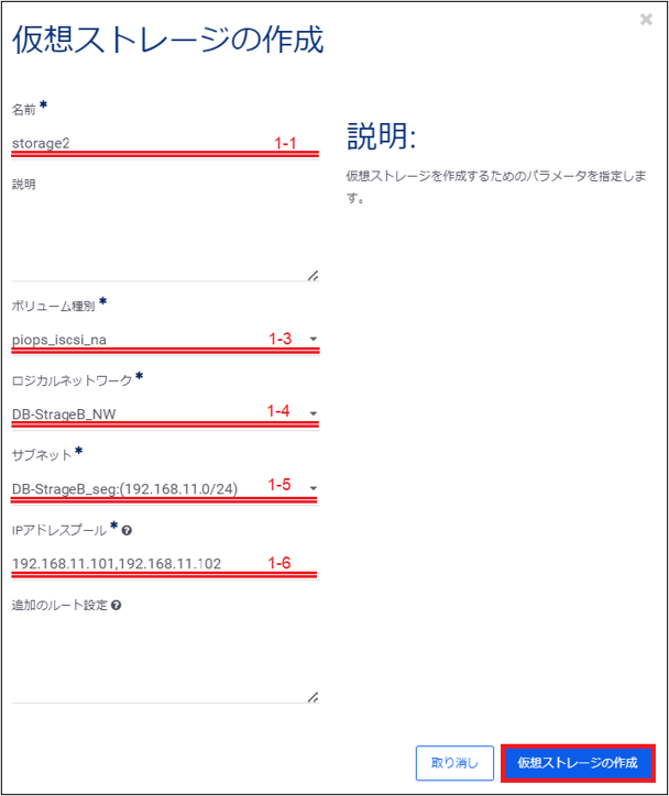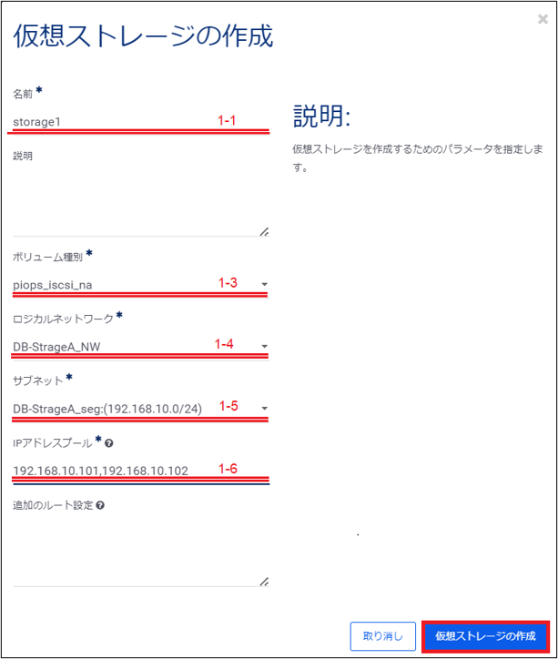これらの入力が完了したら、右下の「仮想ストレージの作成」をクリックし、仮想ストレージの作成を実行します。