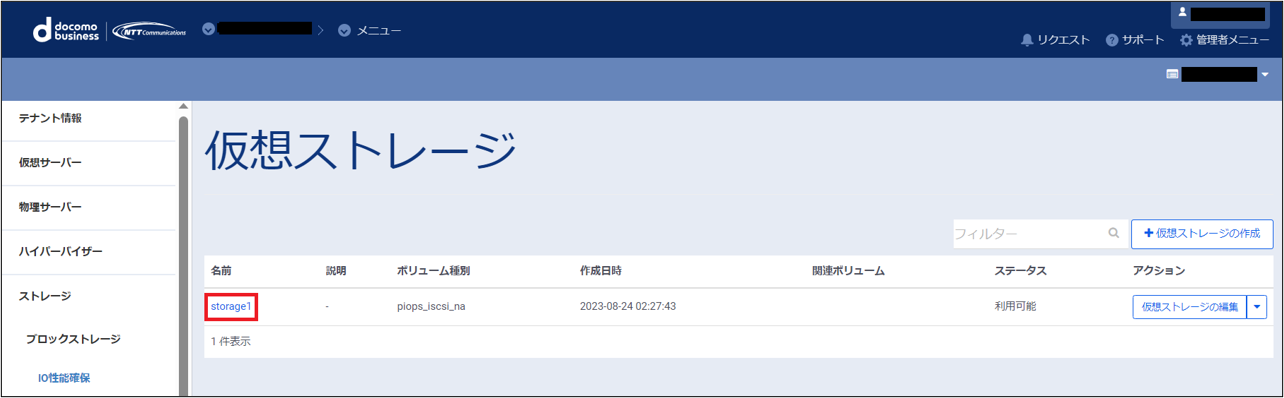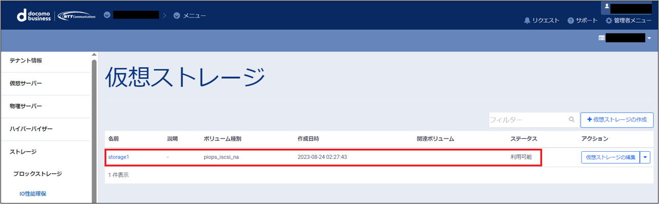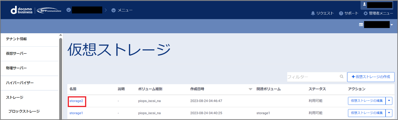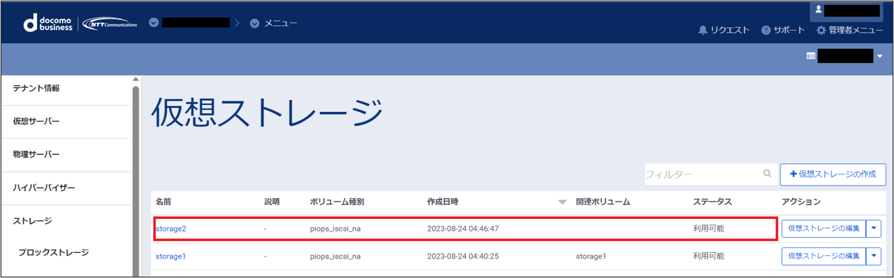仮想ストレージの作成が完了すると、一覧画面に作成された仮想ストレージがリストに追加されて表示されます。