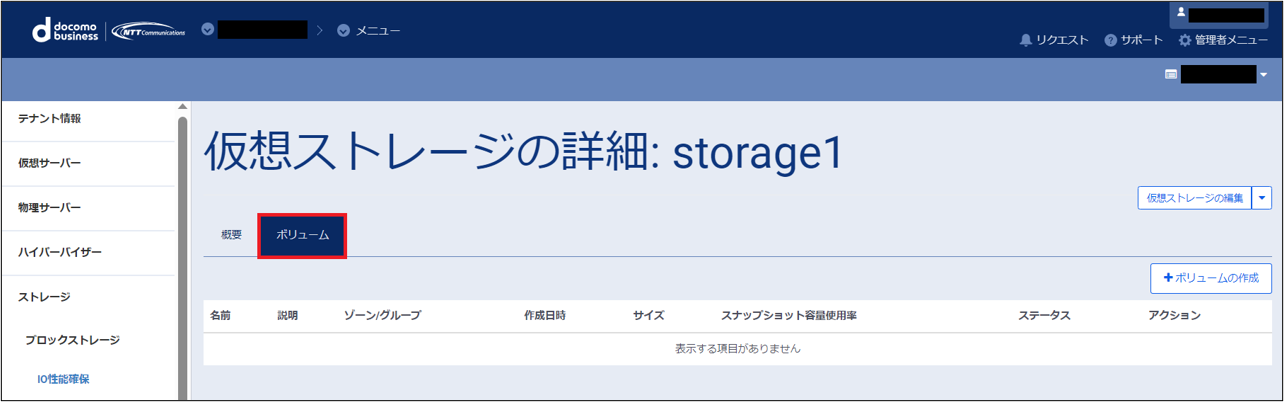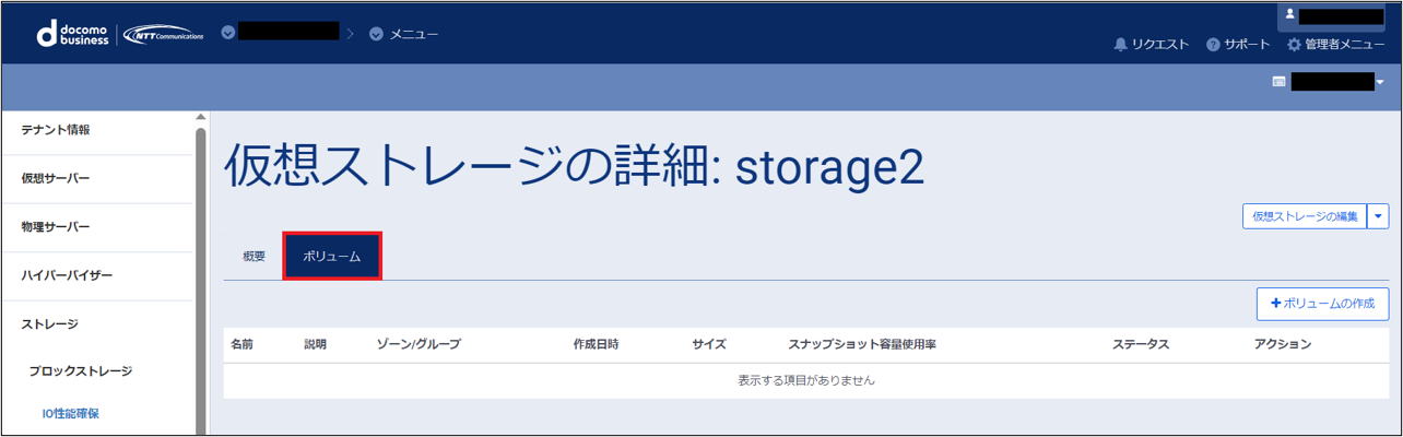 仮想ストレージの詳細画面から「ボリューム」を選択し、「ボリュームの作成」をクリックします。