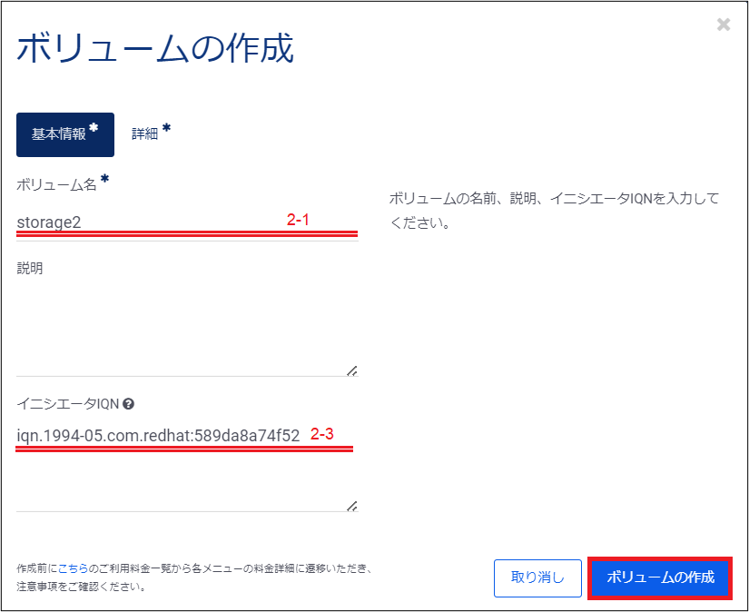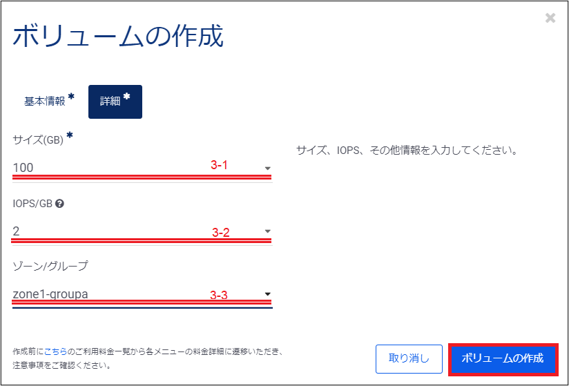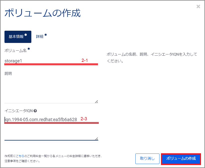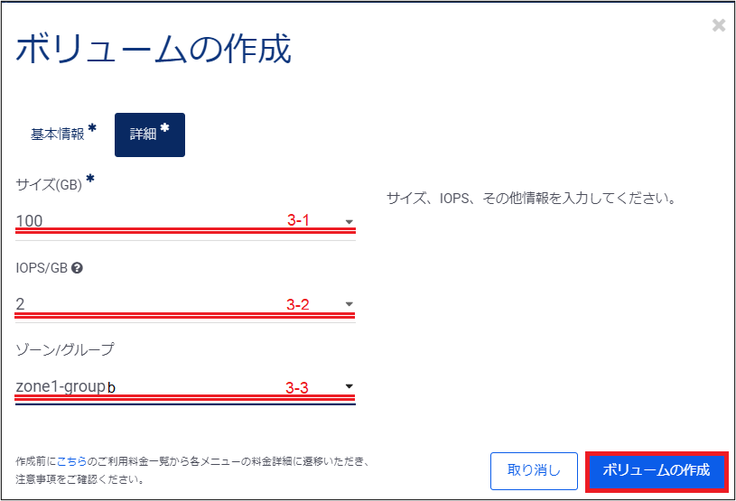 これらの入力が完了したら、右下の「ボリュームの作成」をクリックし、ボリュームの作成を実行します。