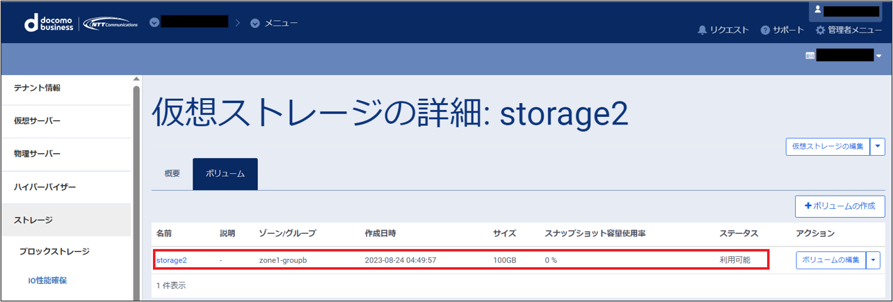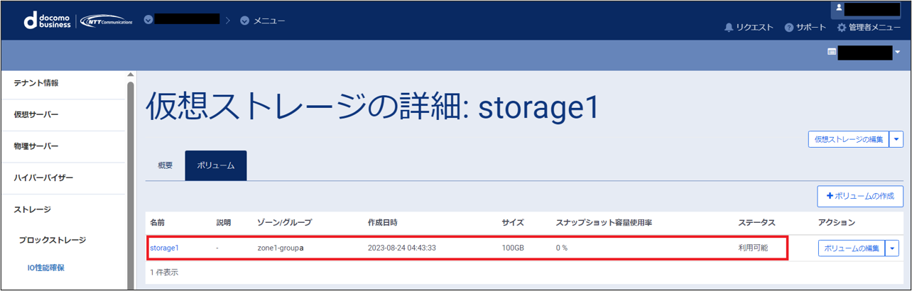 ボリュームの作成が完了すると、一覧画面に作成されたボリュームがリストに追加されて表示されます。