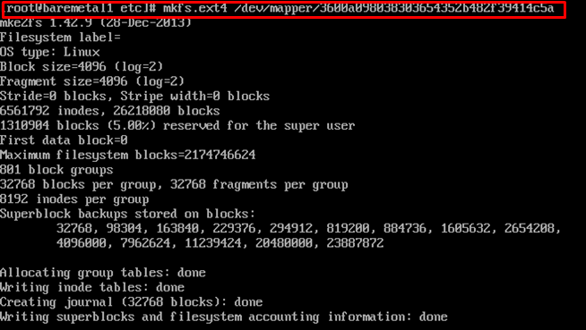 mkfs.ext4 /dev/mapper/3600a098038303766463f4b5975664448