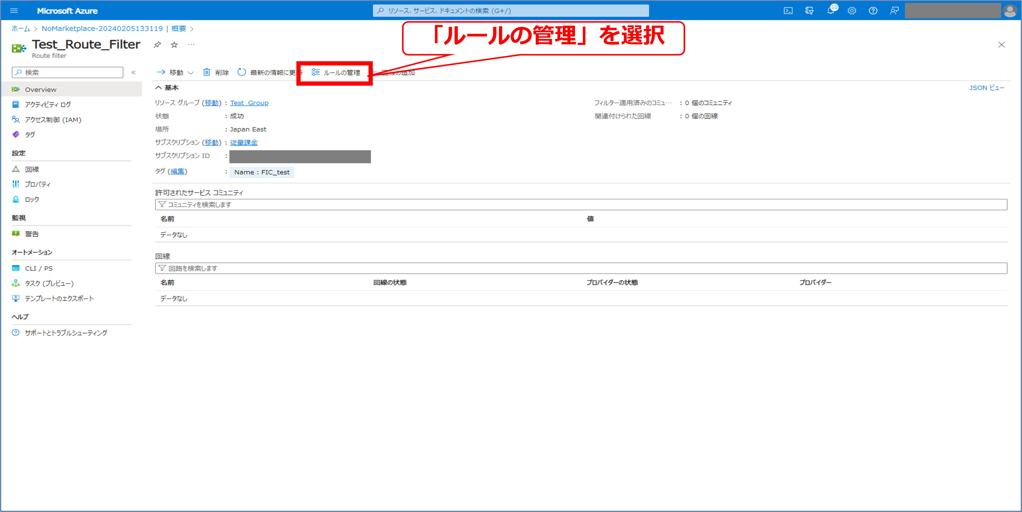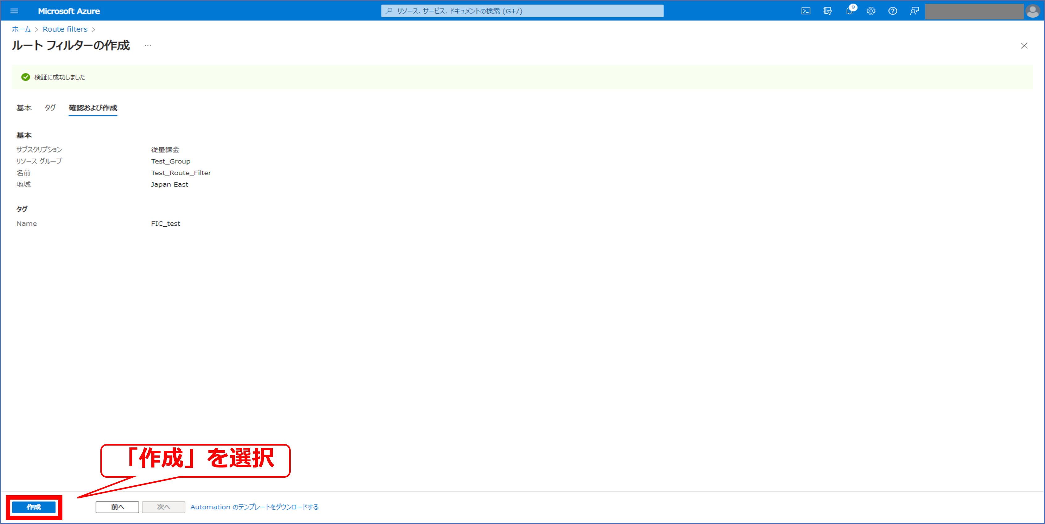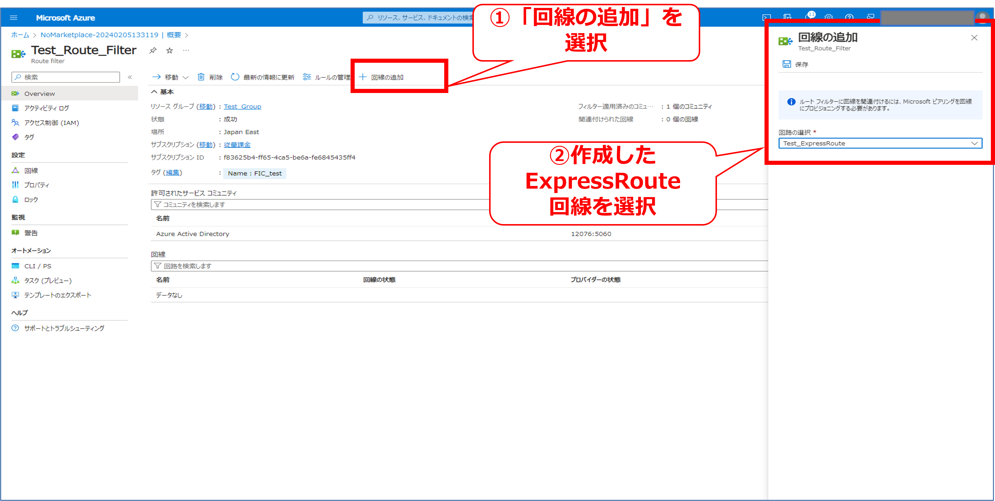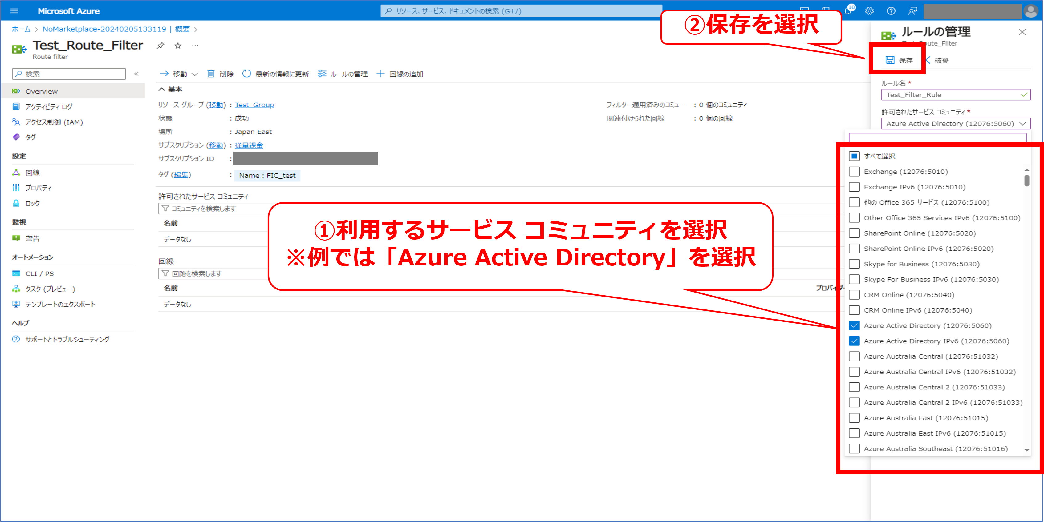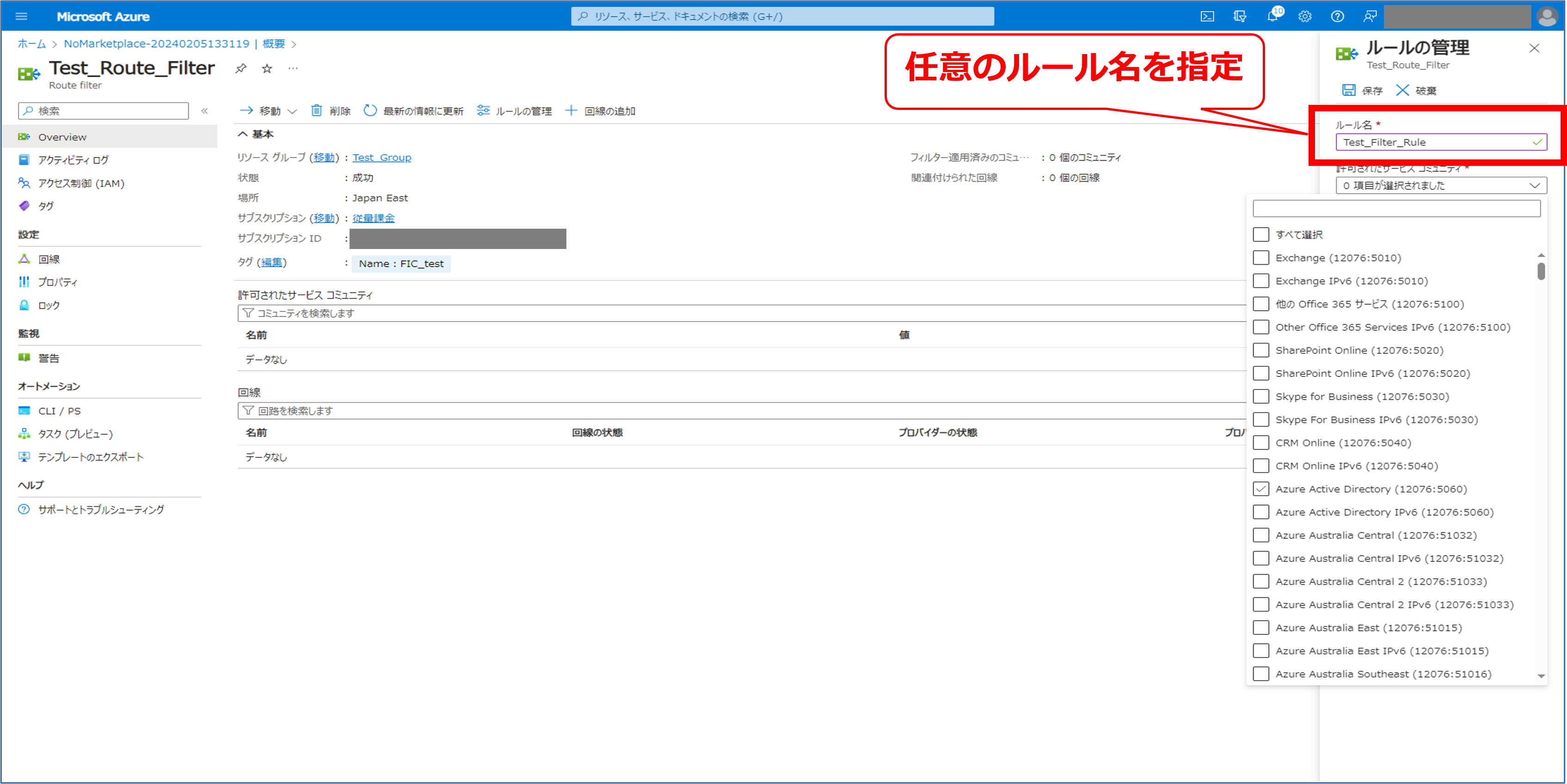 Azureコンソール上でルートフィルター及びフィルタールールの作成 |