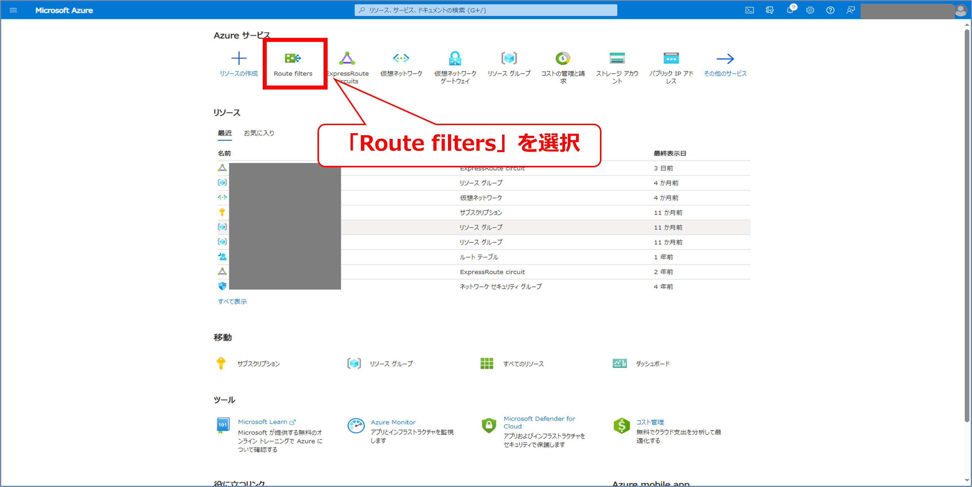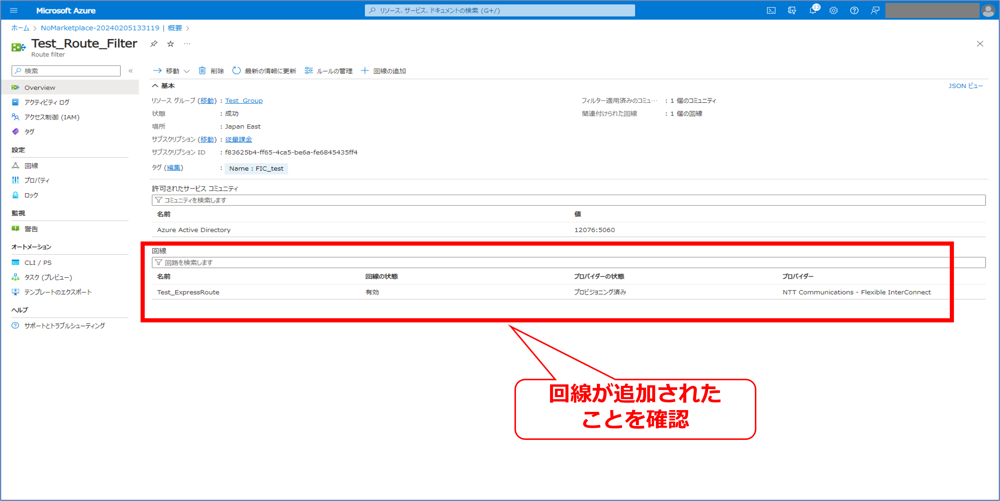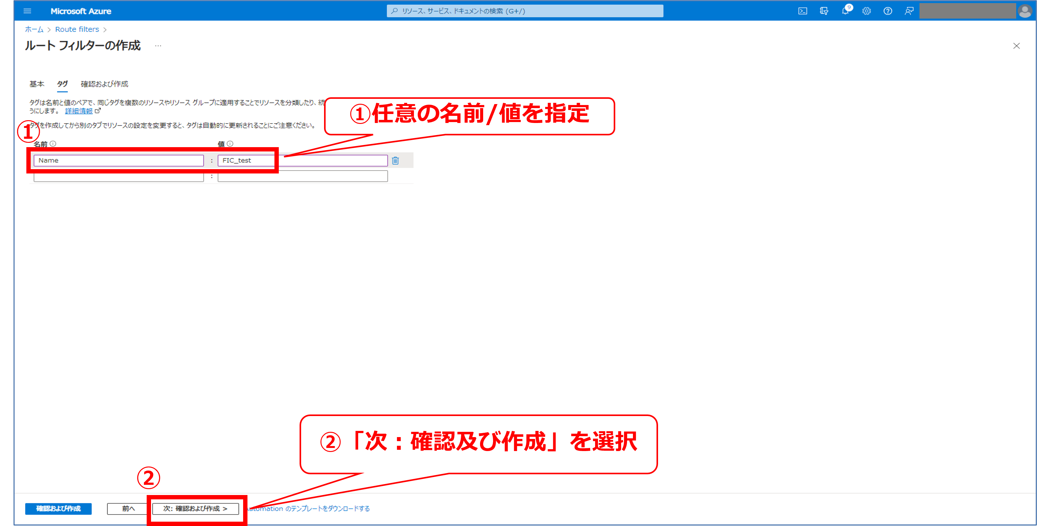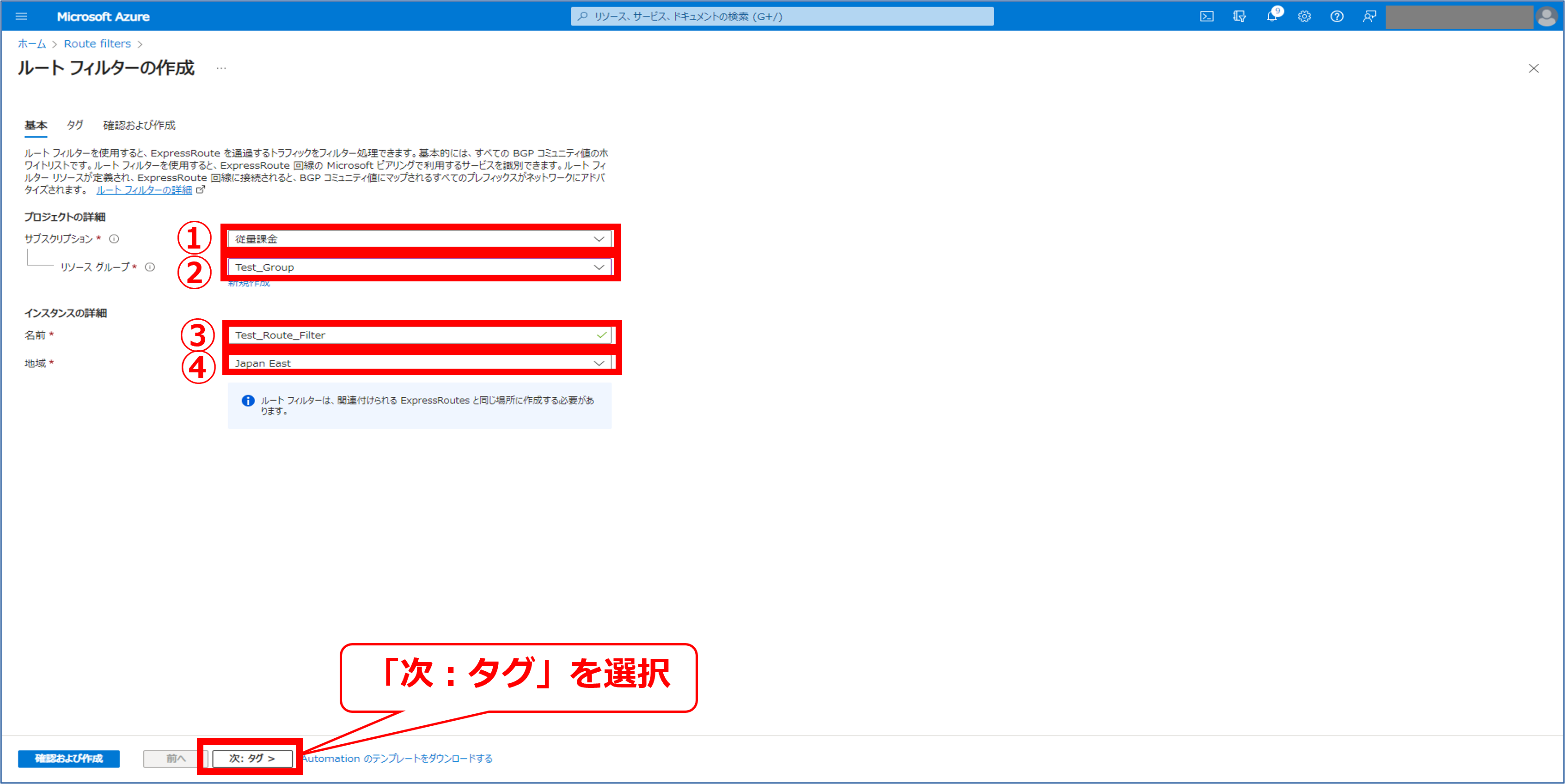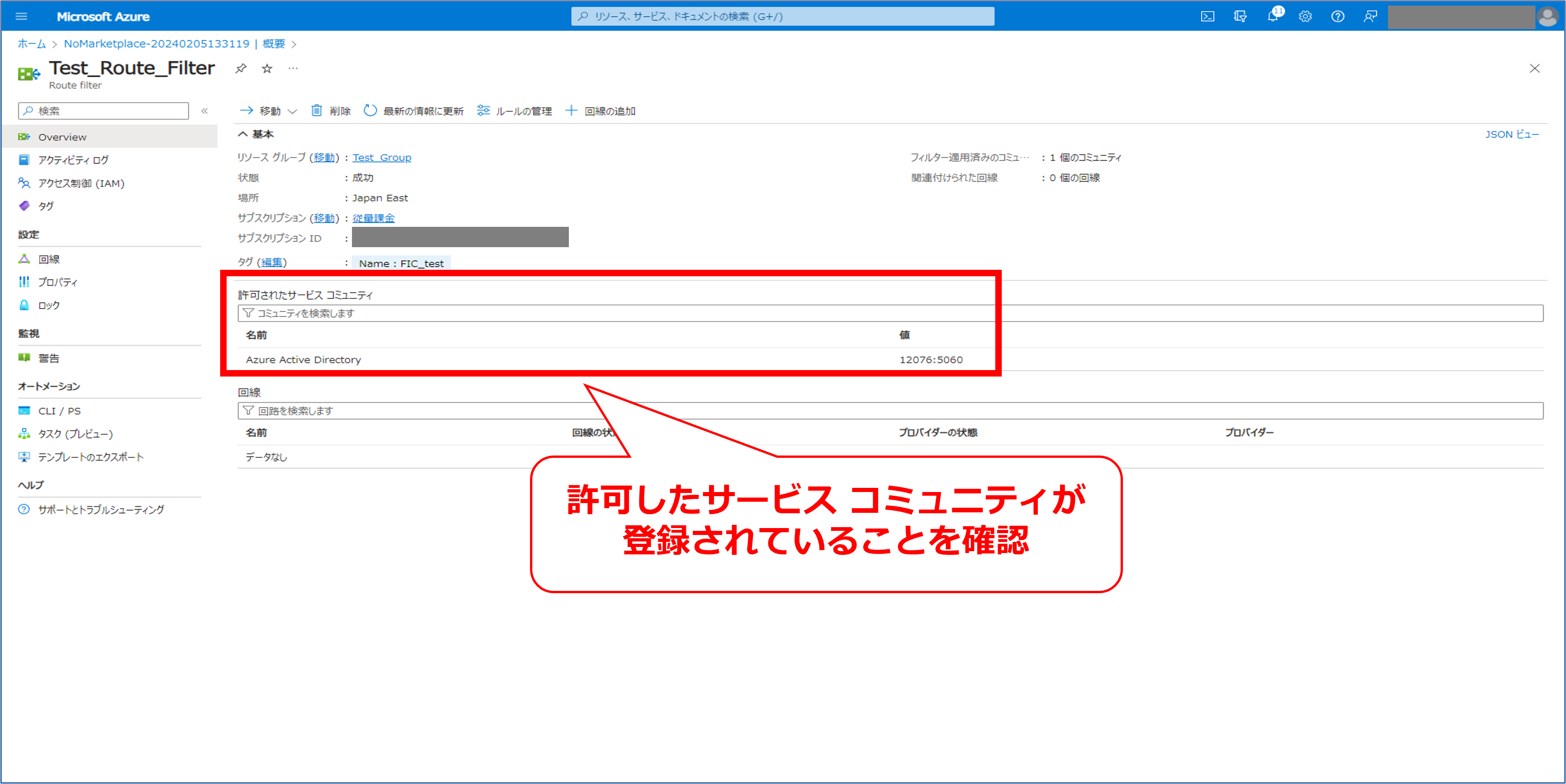 Azureコンソール上でルートフィルター及びフィルタールールの作成 |