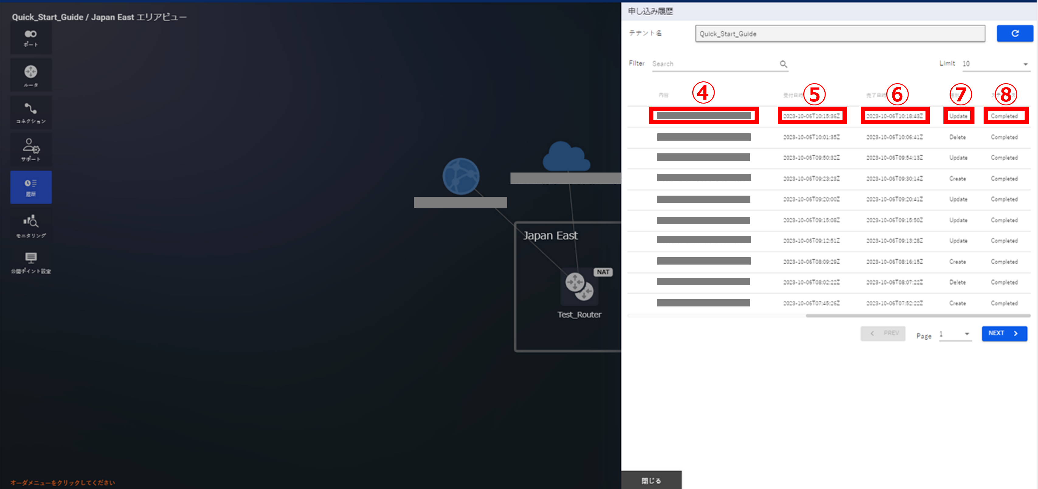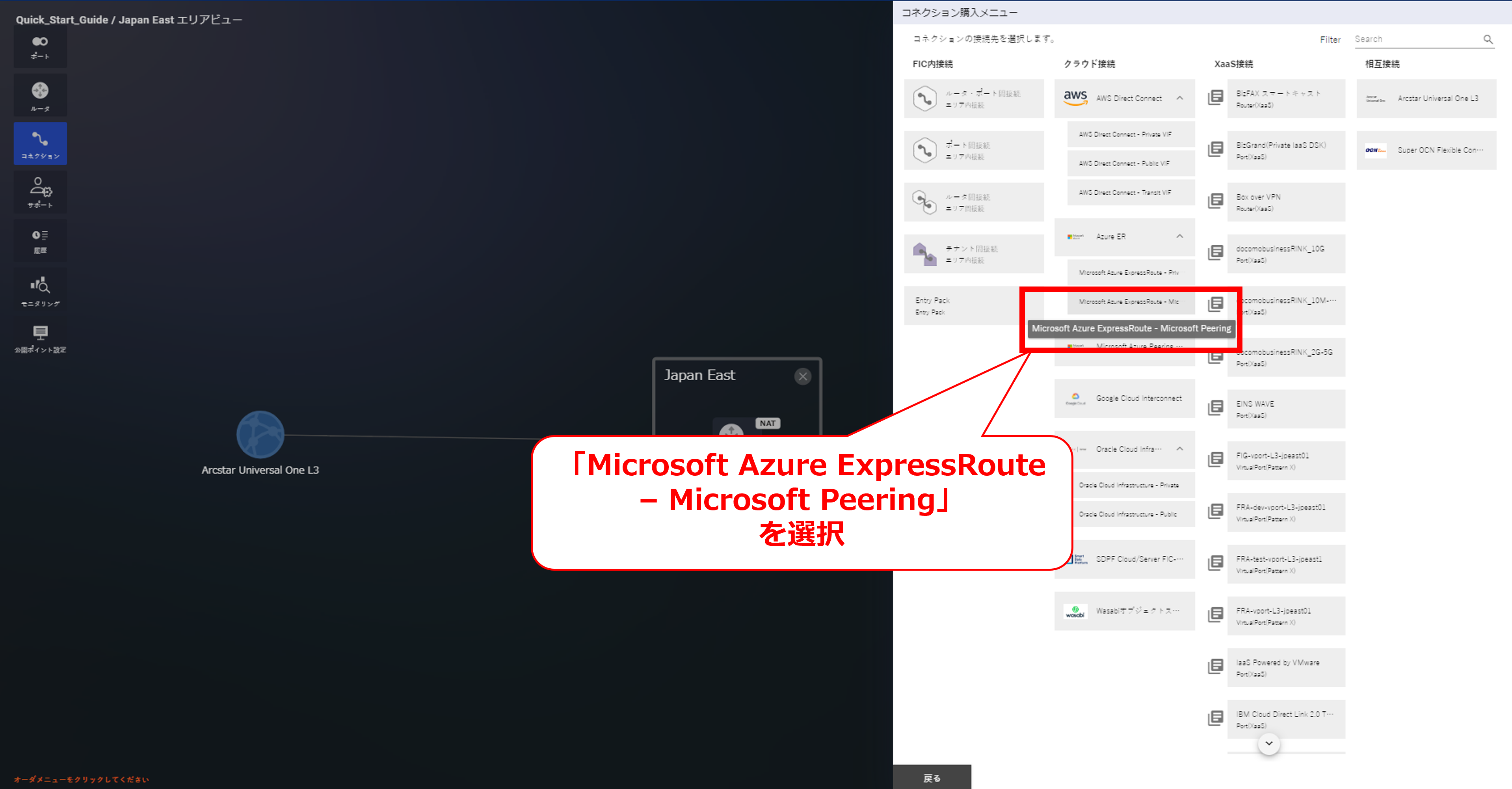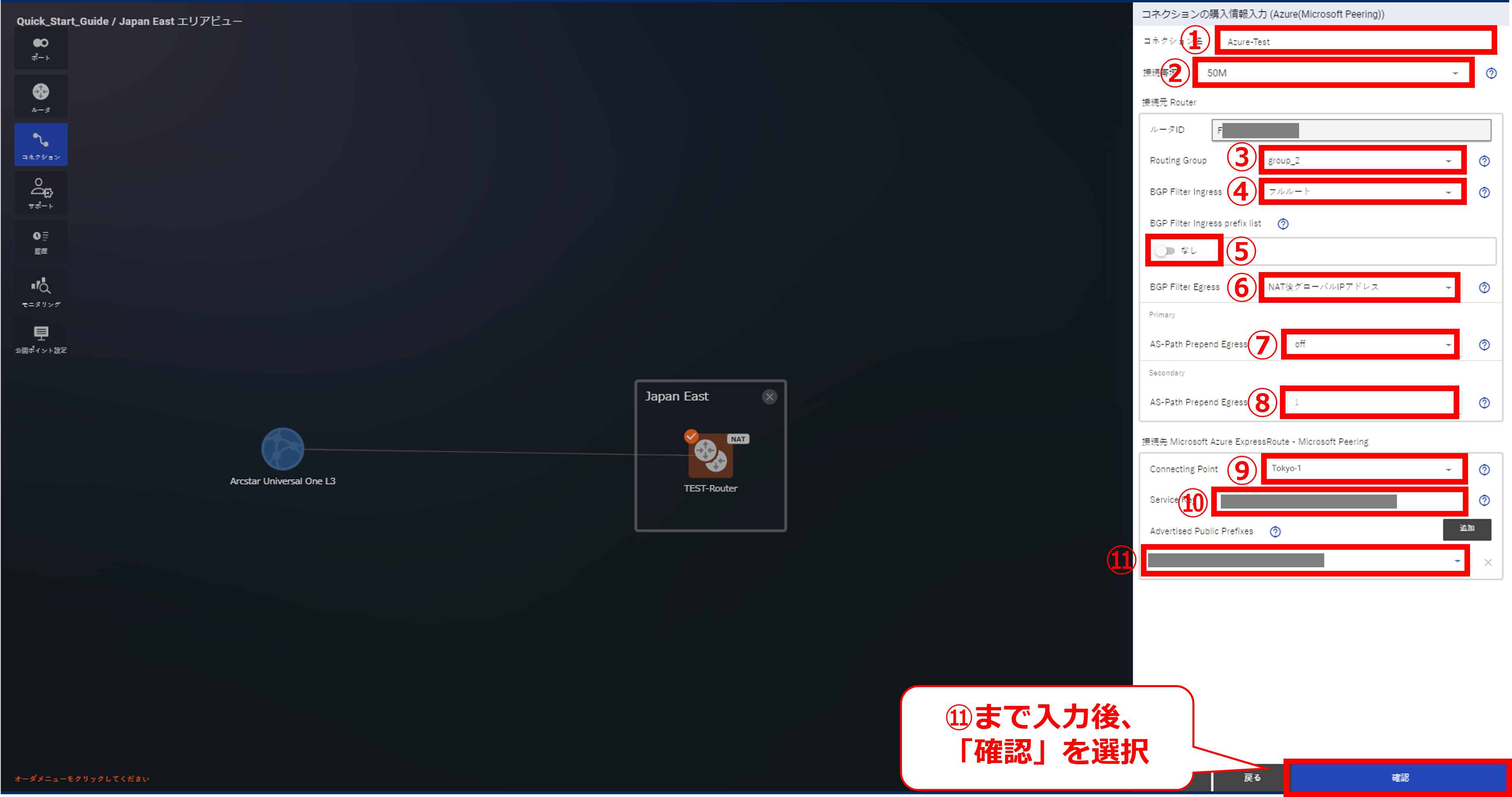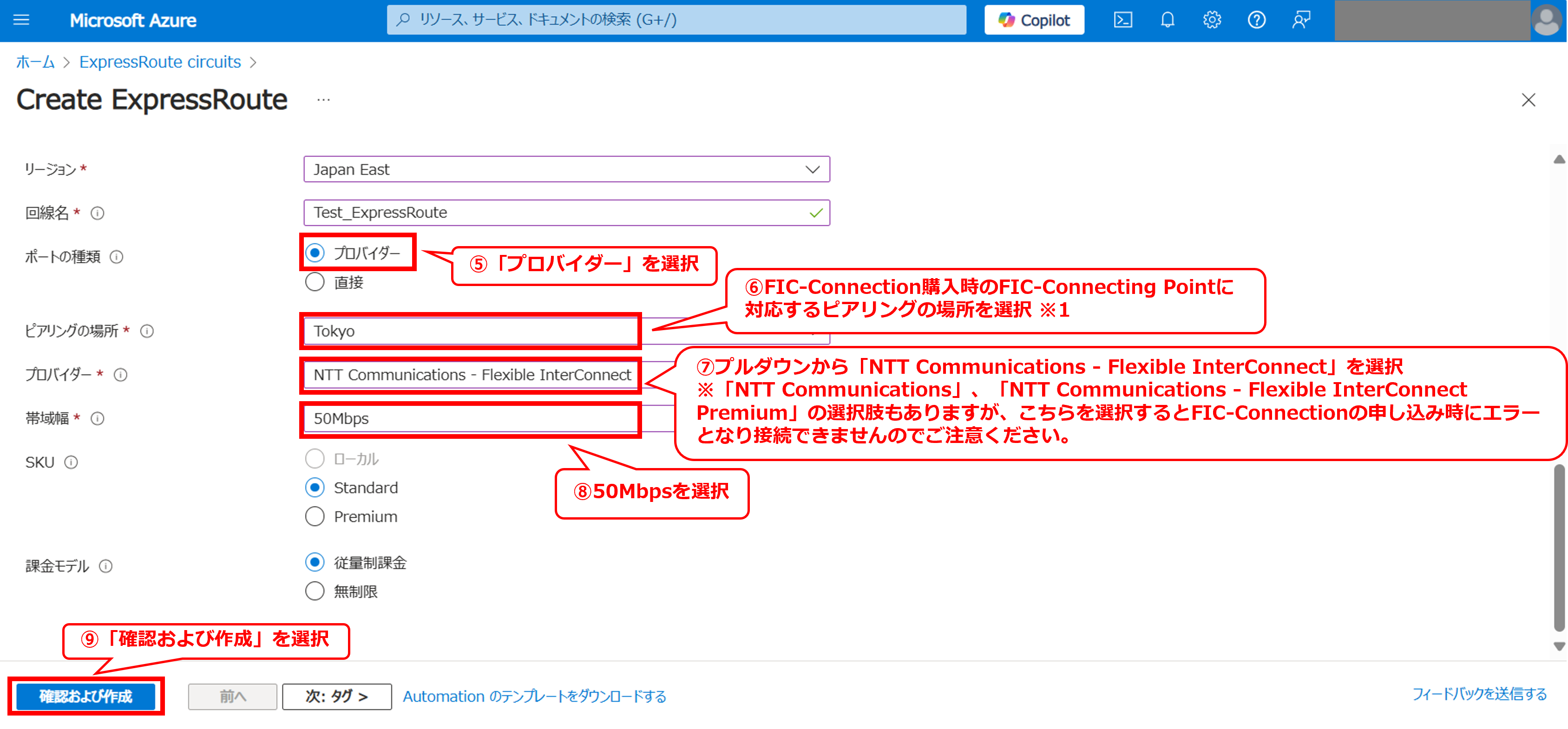 - ※1 ⑥ピアリングの場所を選択する際は、詳細情報の 9.1. FIC-Connection Azure(Microsoft Peering/Private Peering) を参照の上、FIC-Connection Azure(Private Peering)の〇が付いたConnecting PointをMicrosoft側でも選択ください。〇の付いていないConnecting Pointを選択した場合、FIC-Connection Azure(Private Peering)購入時にエラーが発生します。