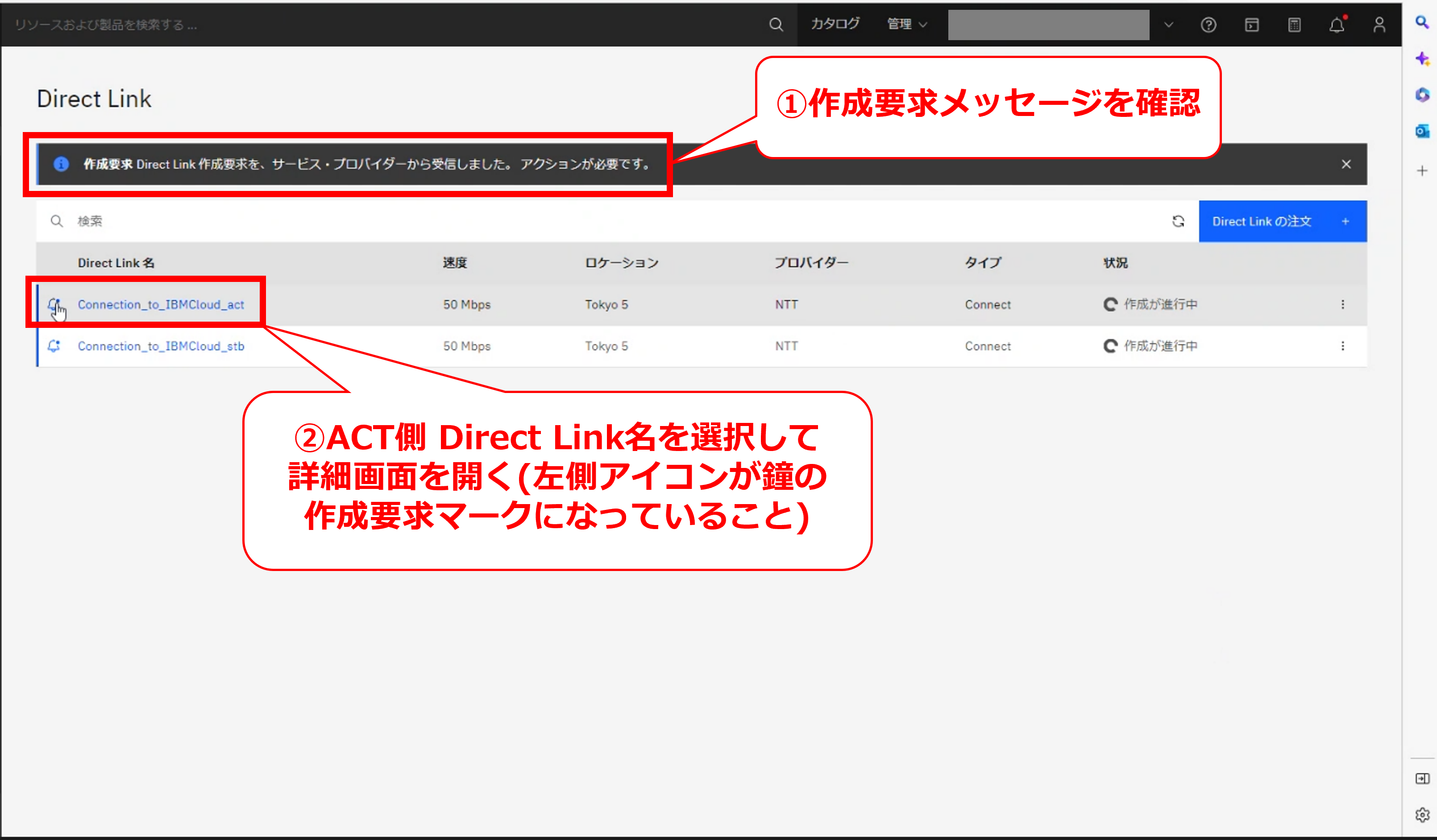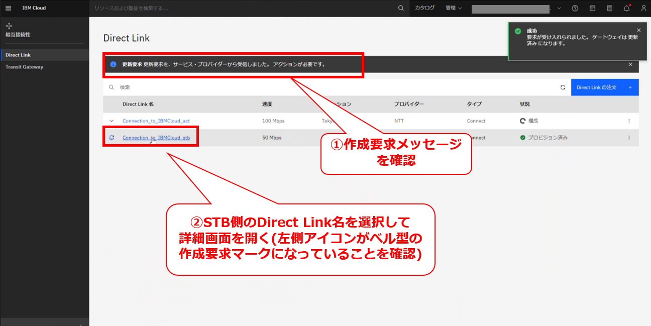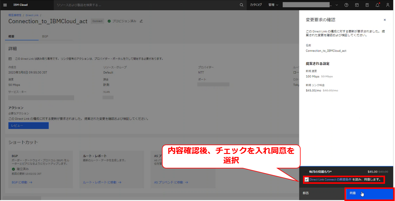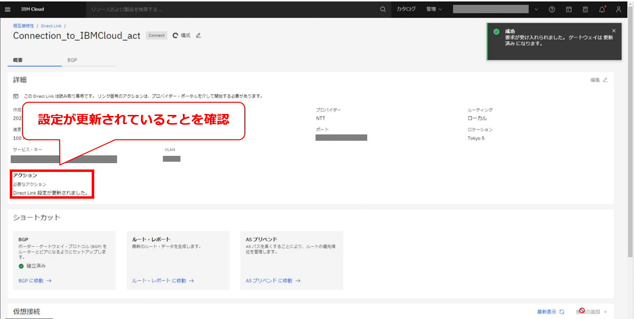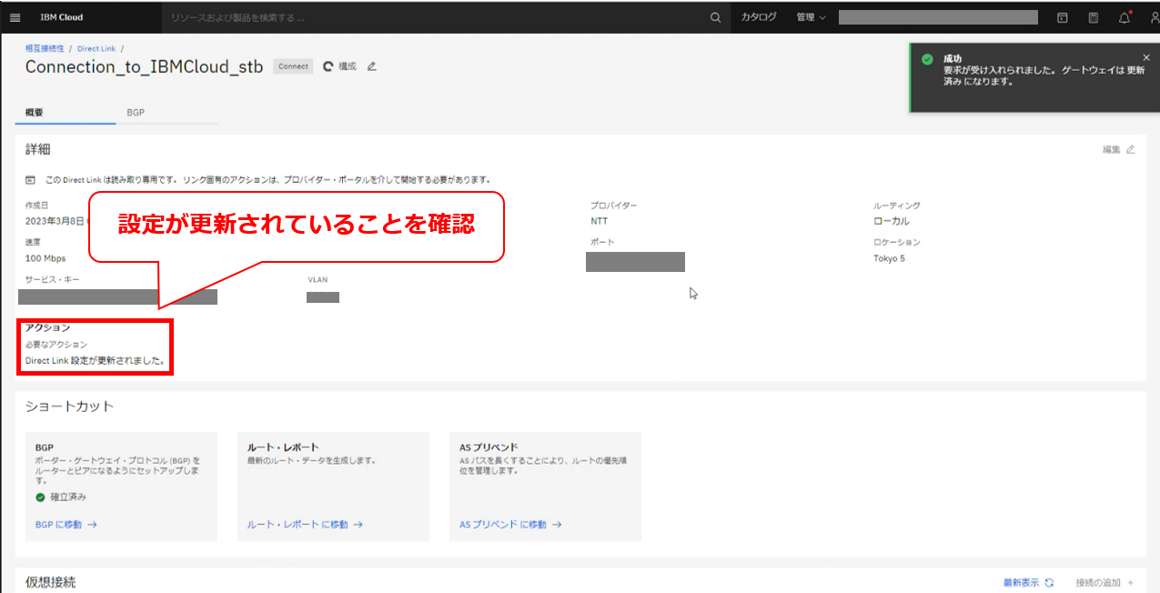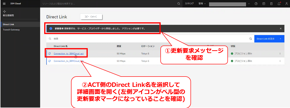 • お客様のIBM Cloud コンソールにてDirect Linkの帯域変更の要求メッセージが確認出来た後に、次項以降の作業を実施してください。