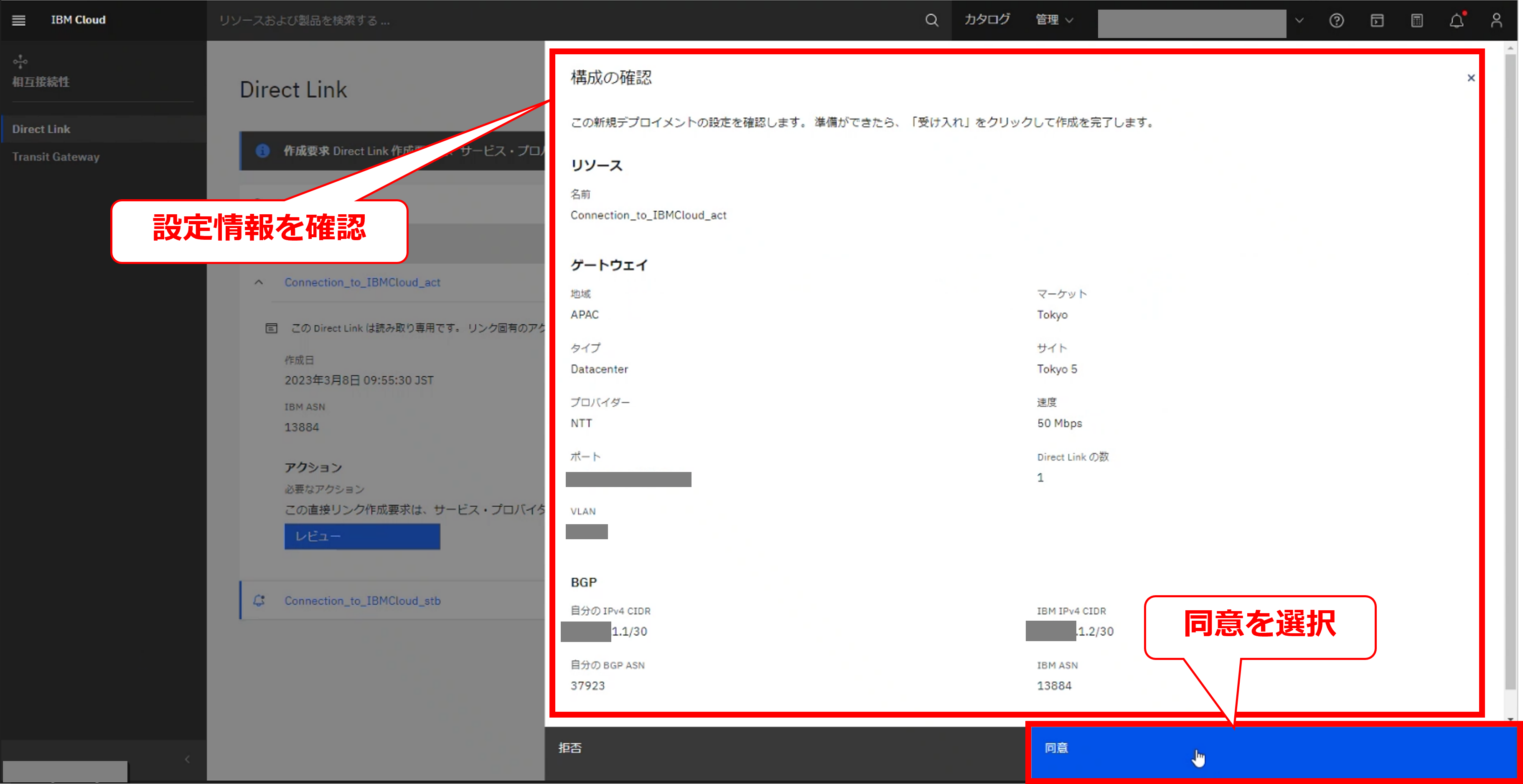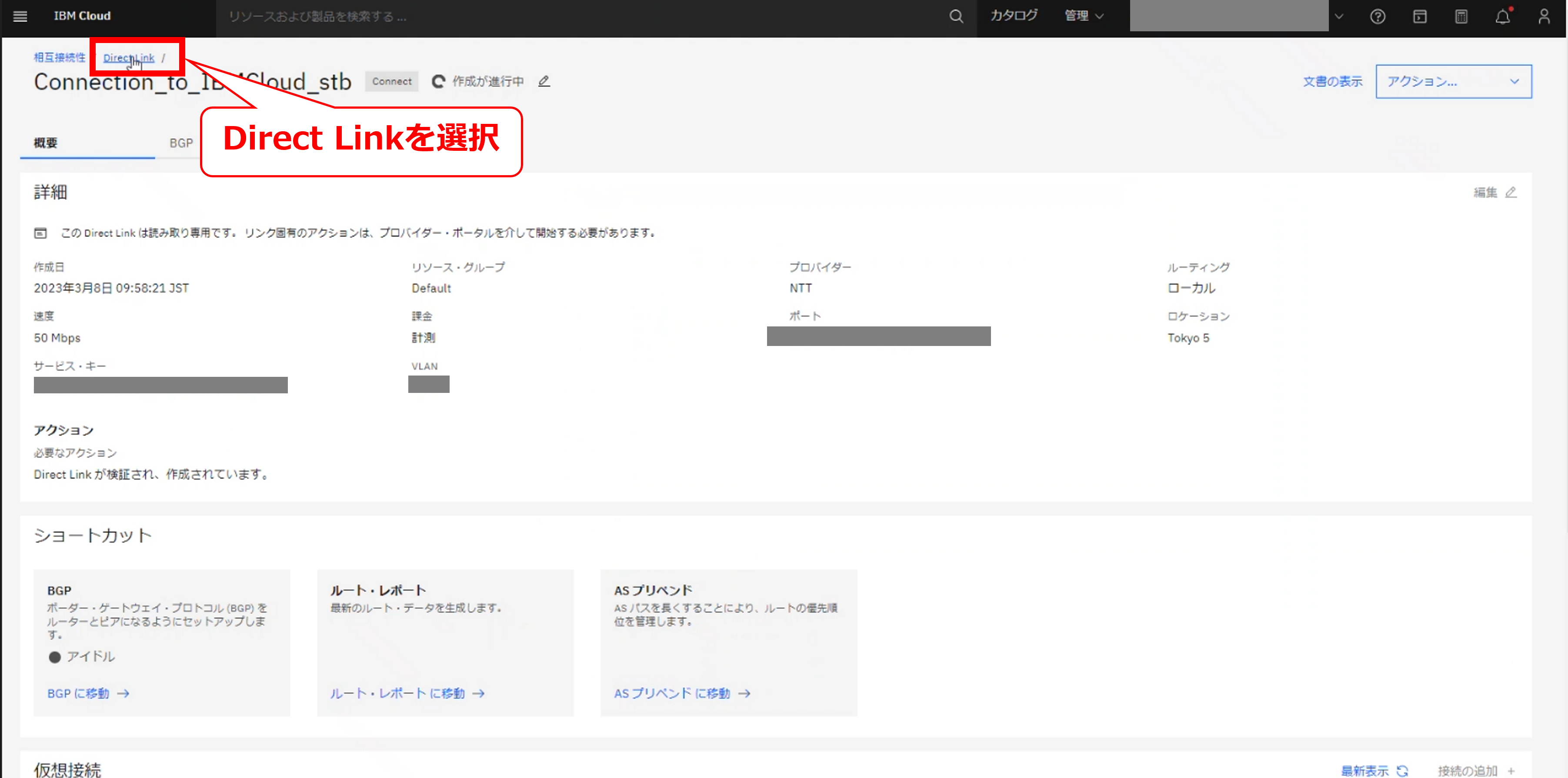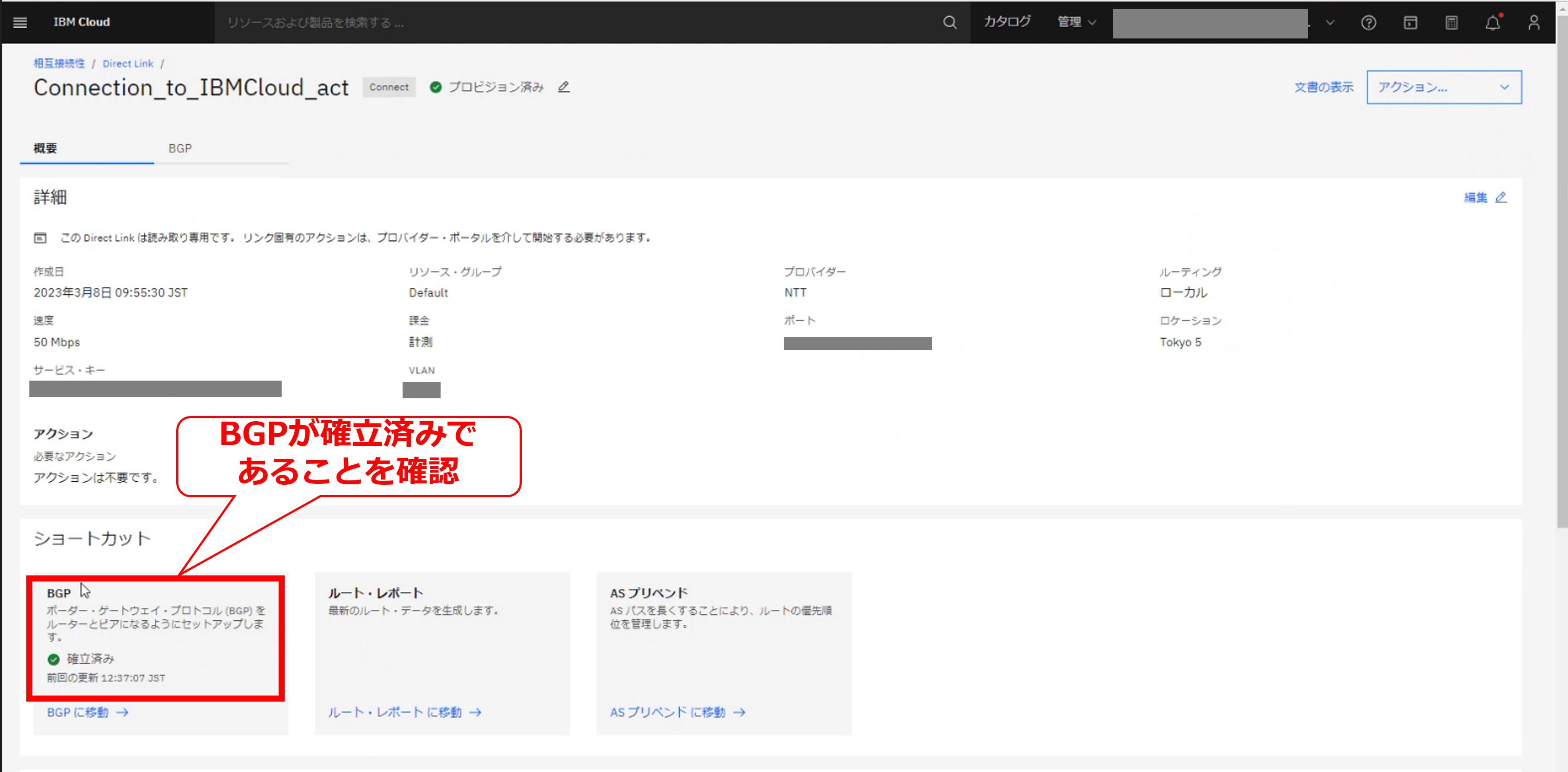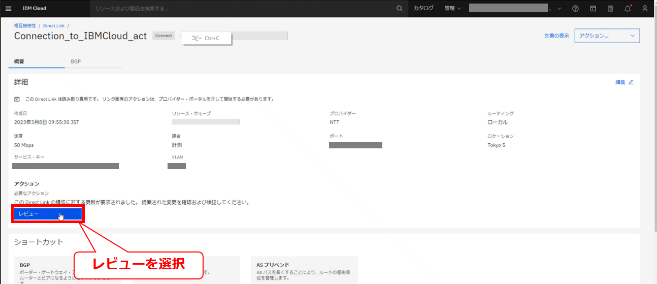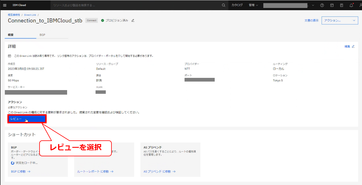• お客様のIBM Cloud コンソールにてDirect Linkの帯域変更の要求メッセージが確認出来た後に、次項以降の作業を実施してください。