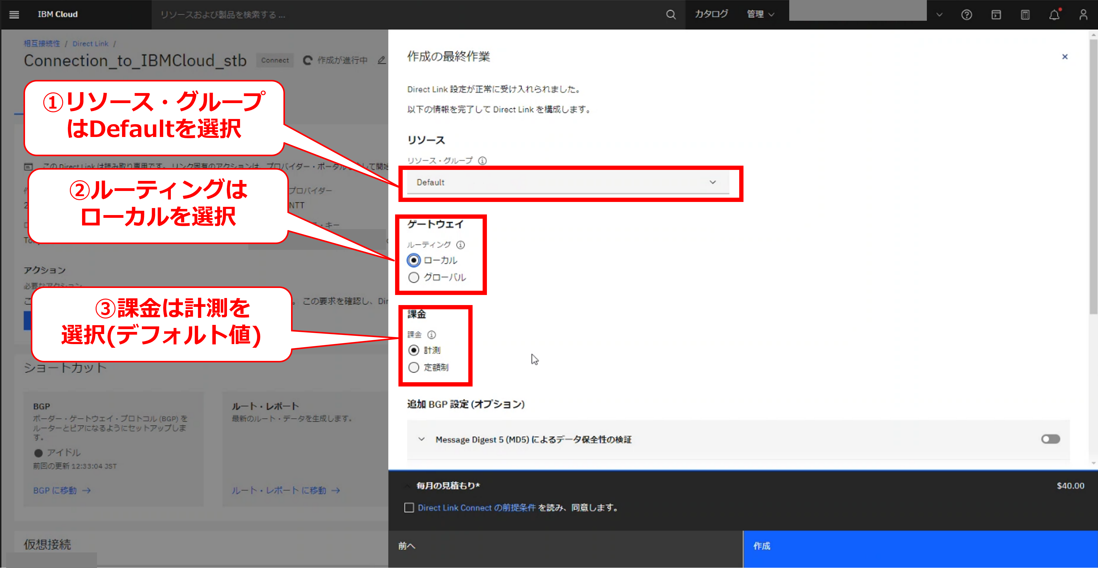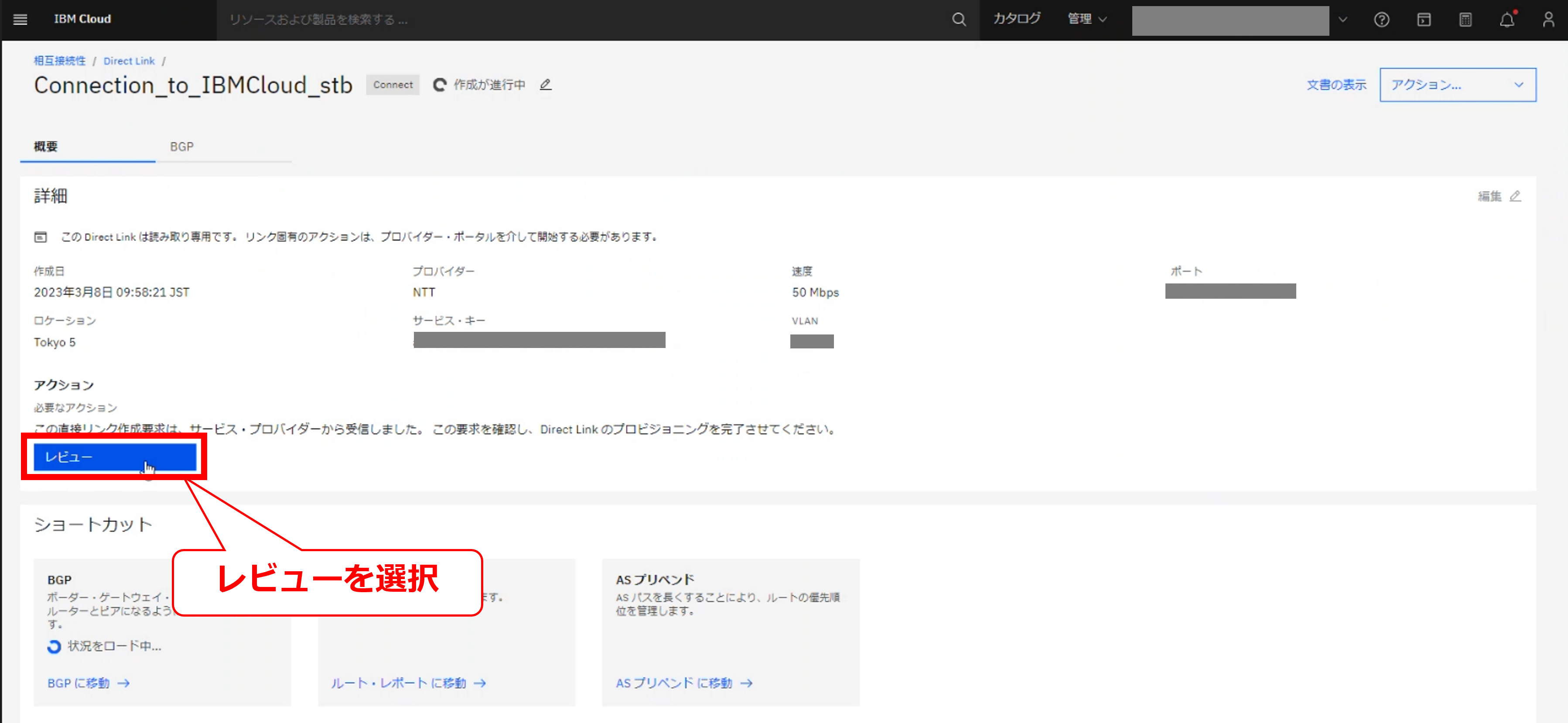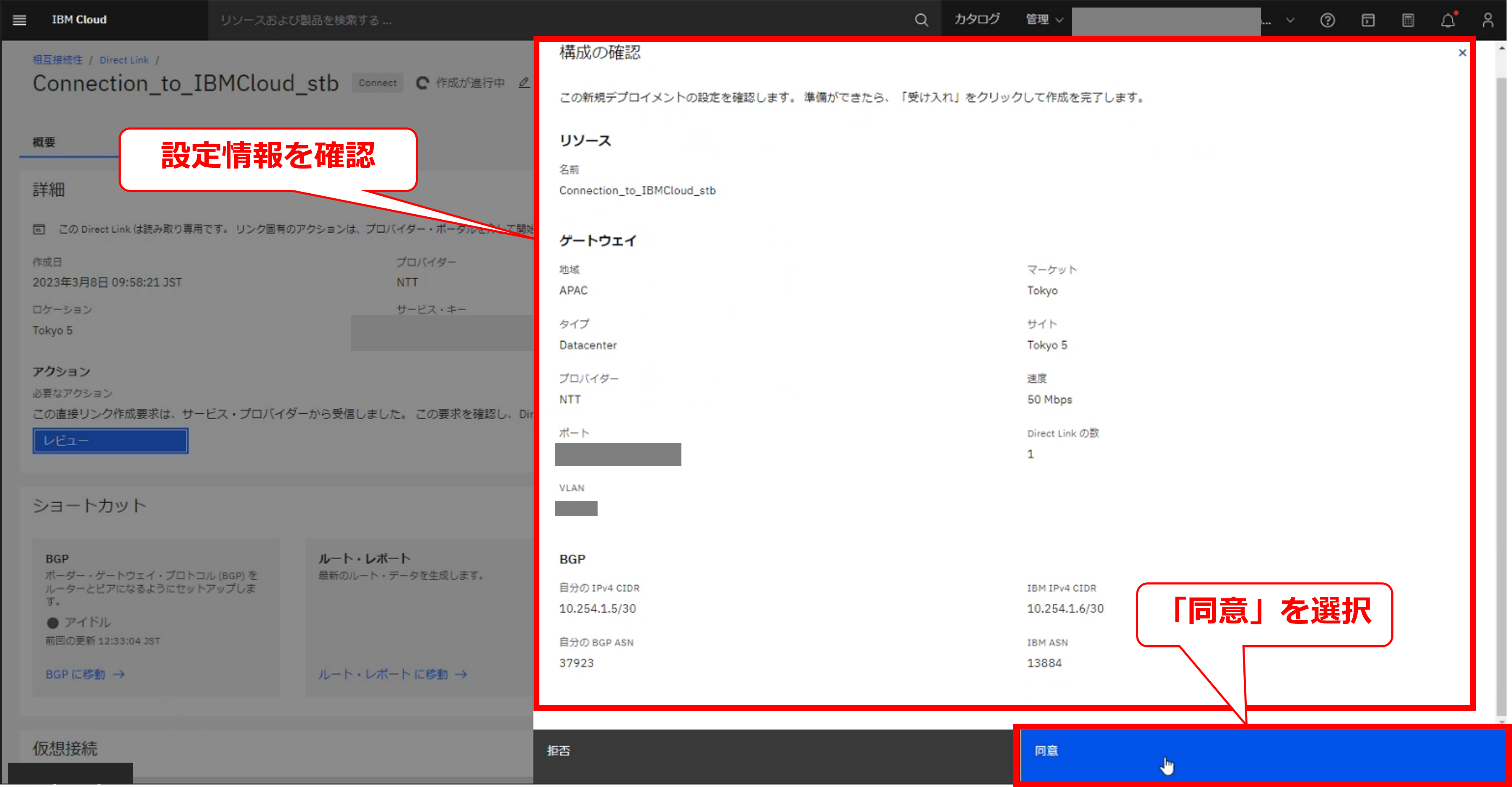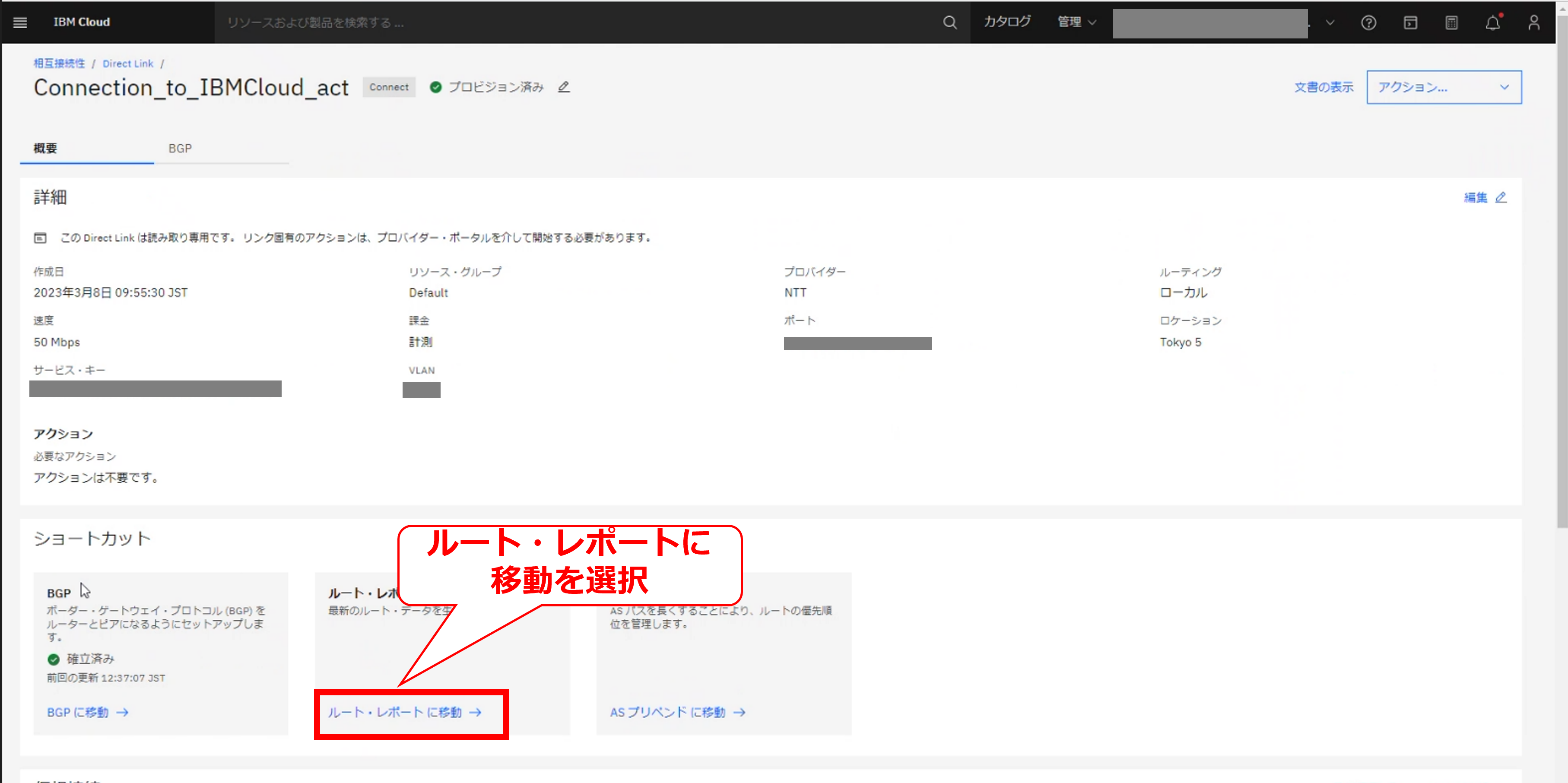 • お客様のIBM Cloud コンソールにてDirect Linkの帯域変更の要求メッセージが確認出来た後に、次項以降の作業を実施してください。
