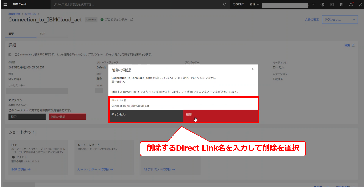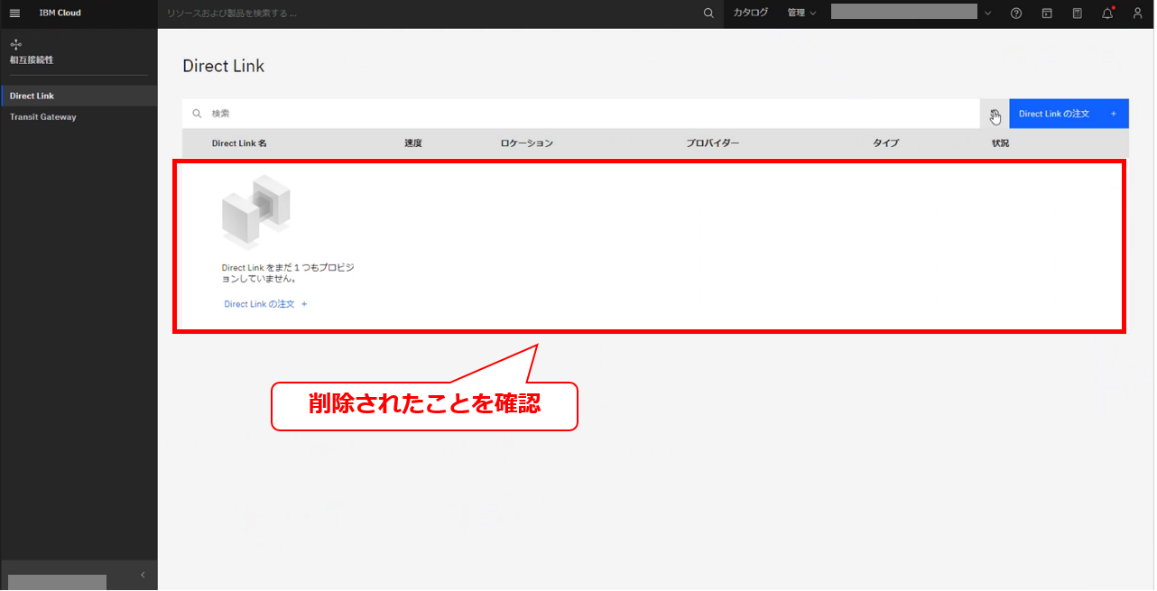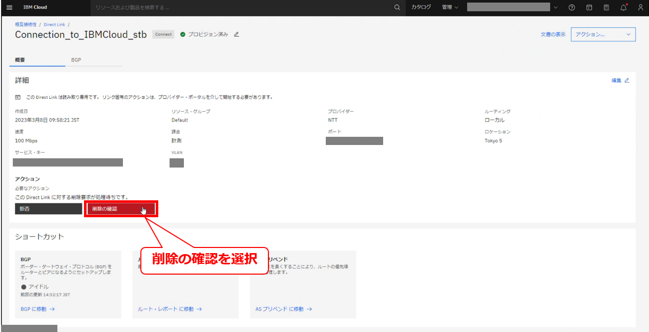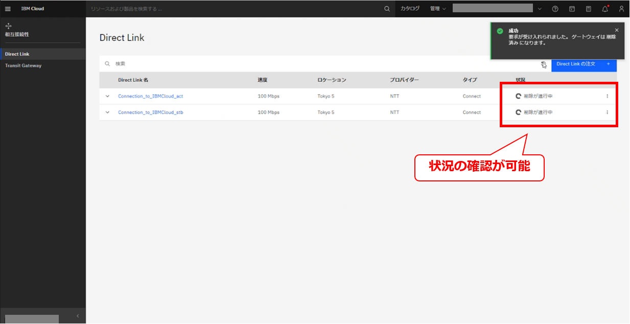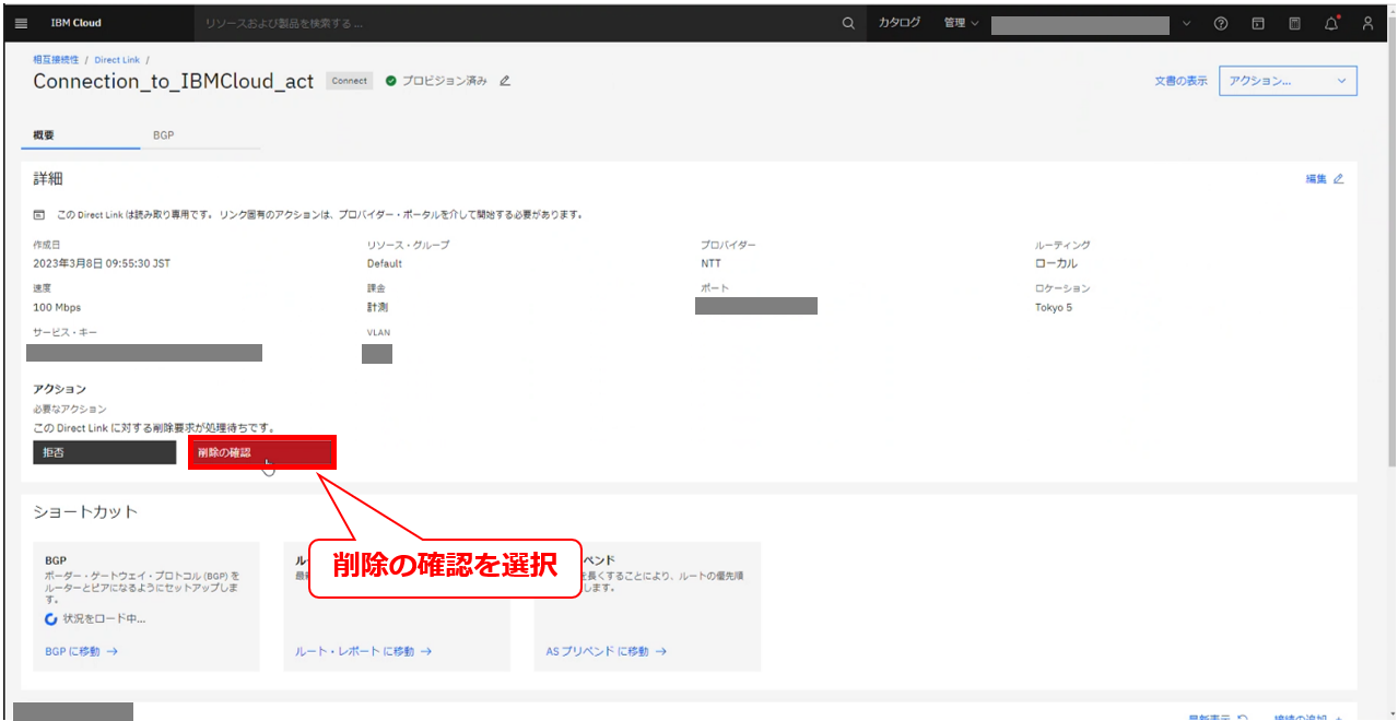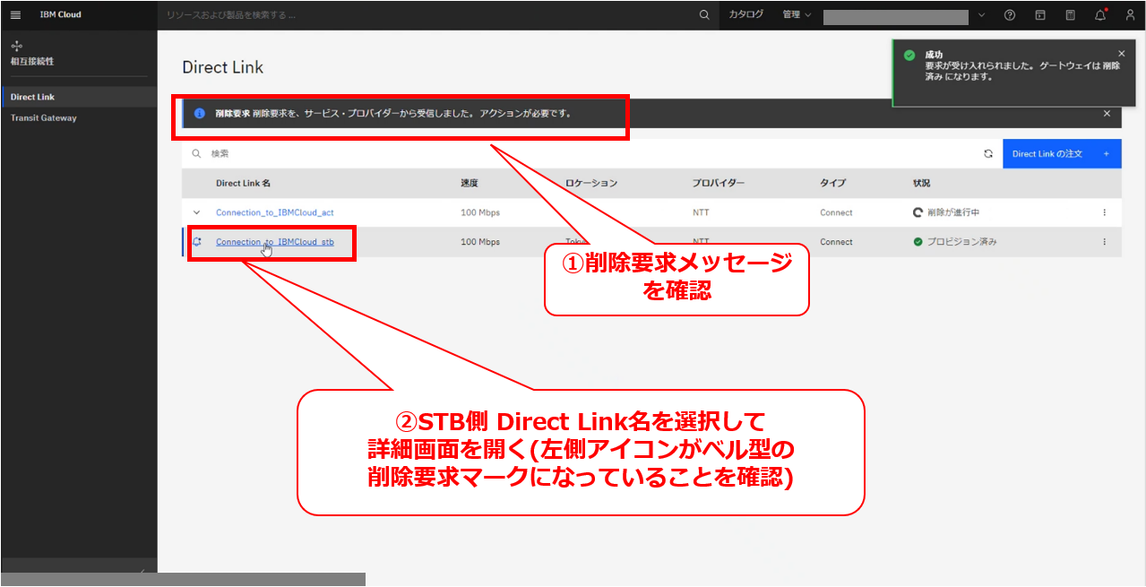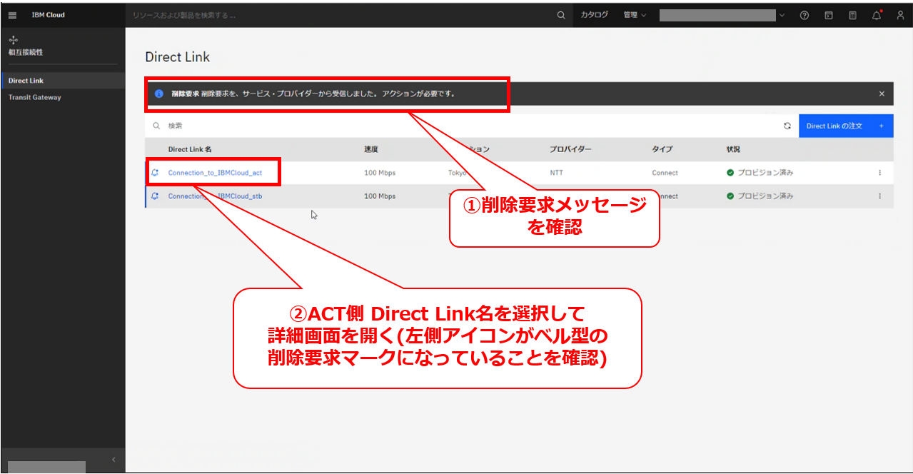 • お客様のIBM Cloud コンソールにてDirect Linkの削除要求メッセージが確認出来た後に、次項以降の作業を実施してください。