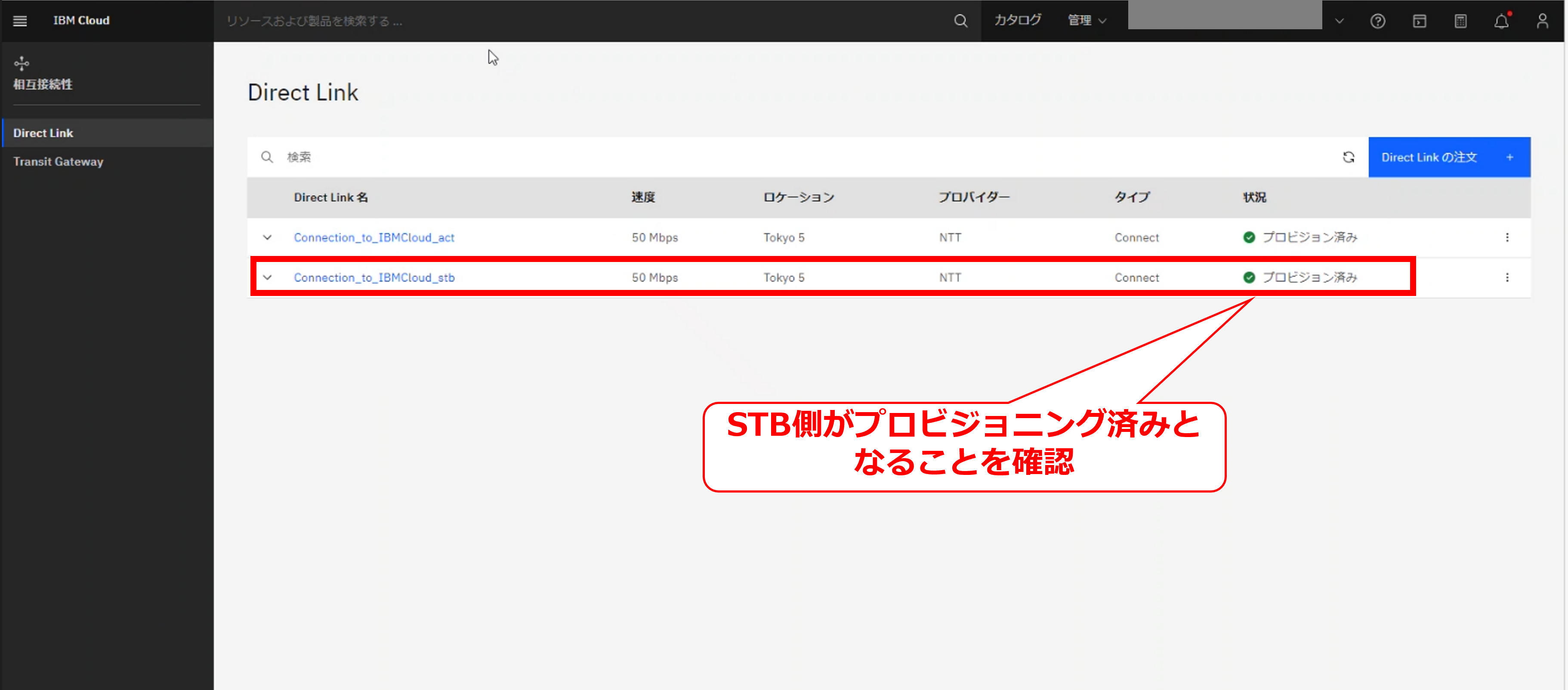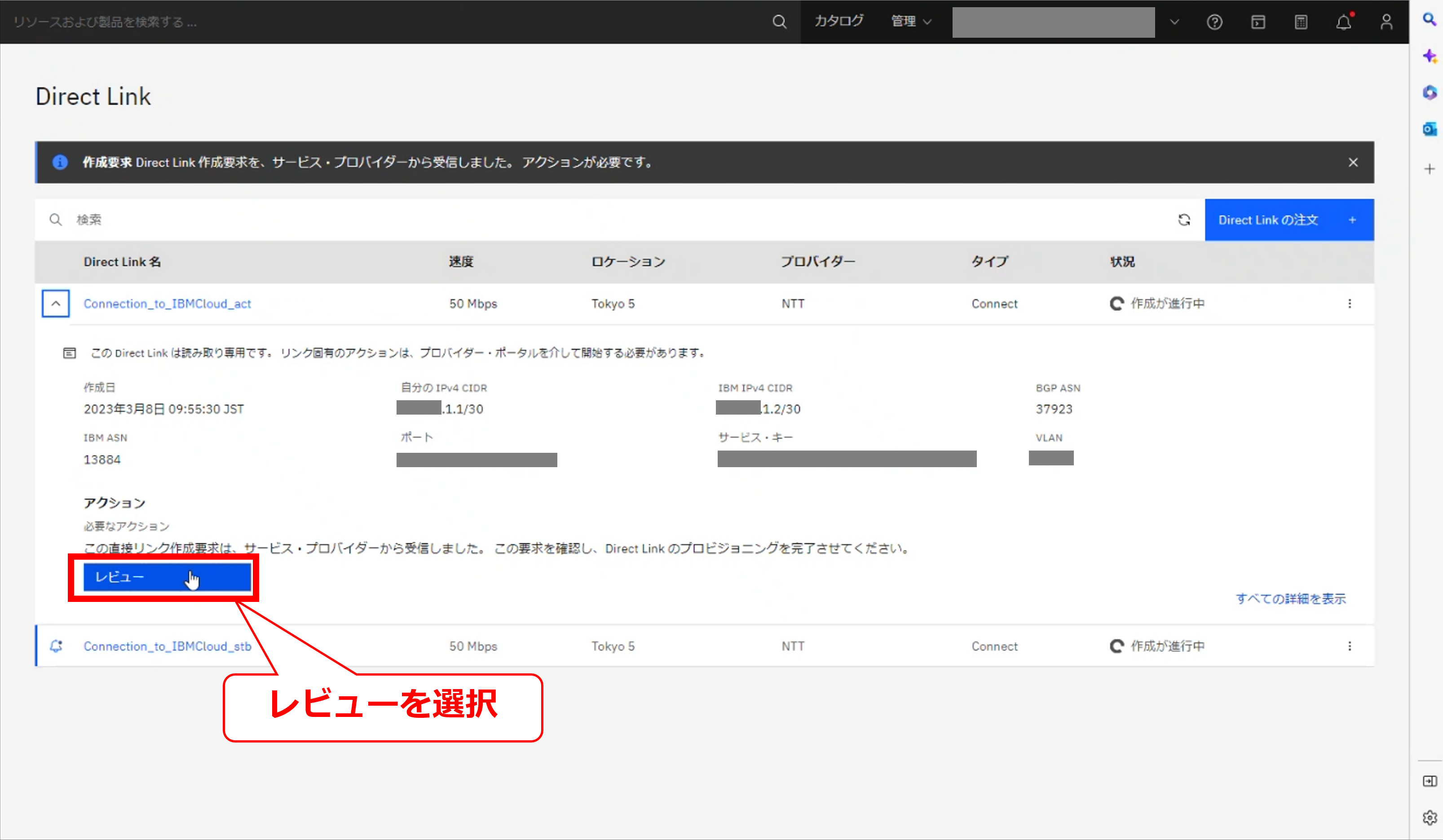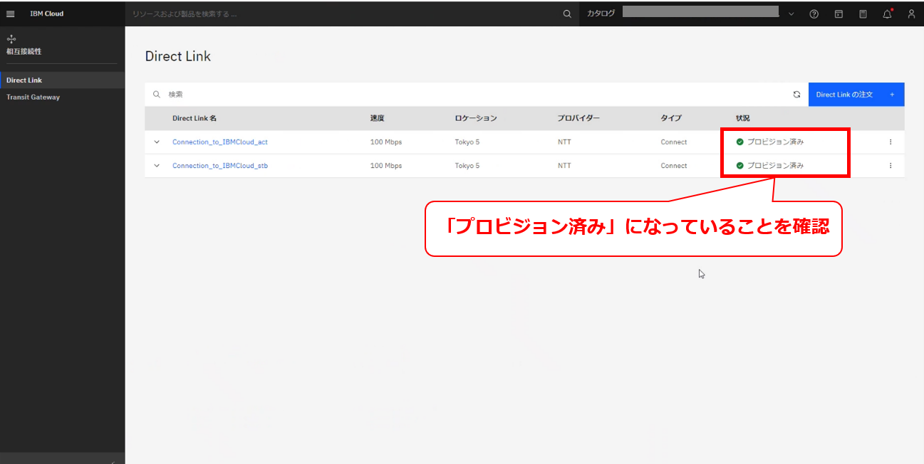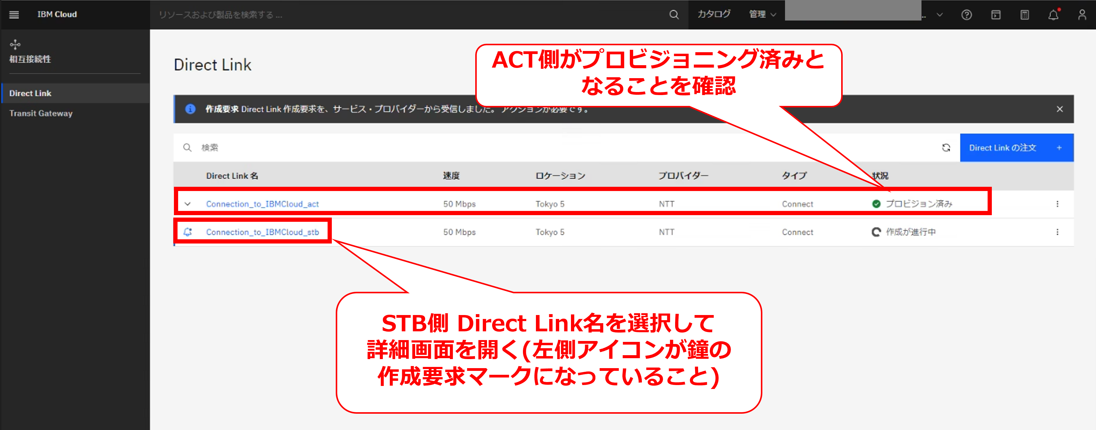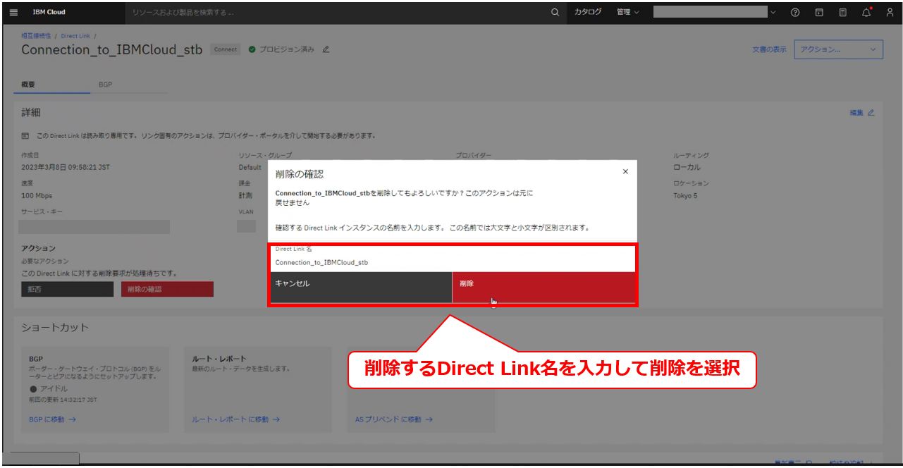 • お客様のIBM Cloud コンソールにてDirect Linkの削除要求メッセージが確認出来た後に、次項以降の作業を実施してください。