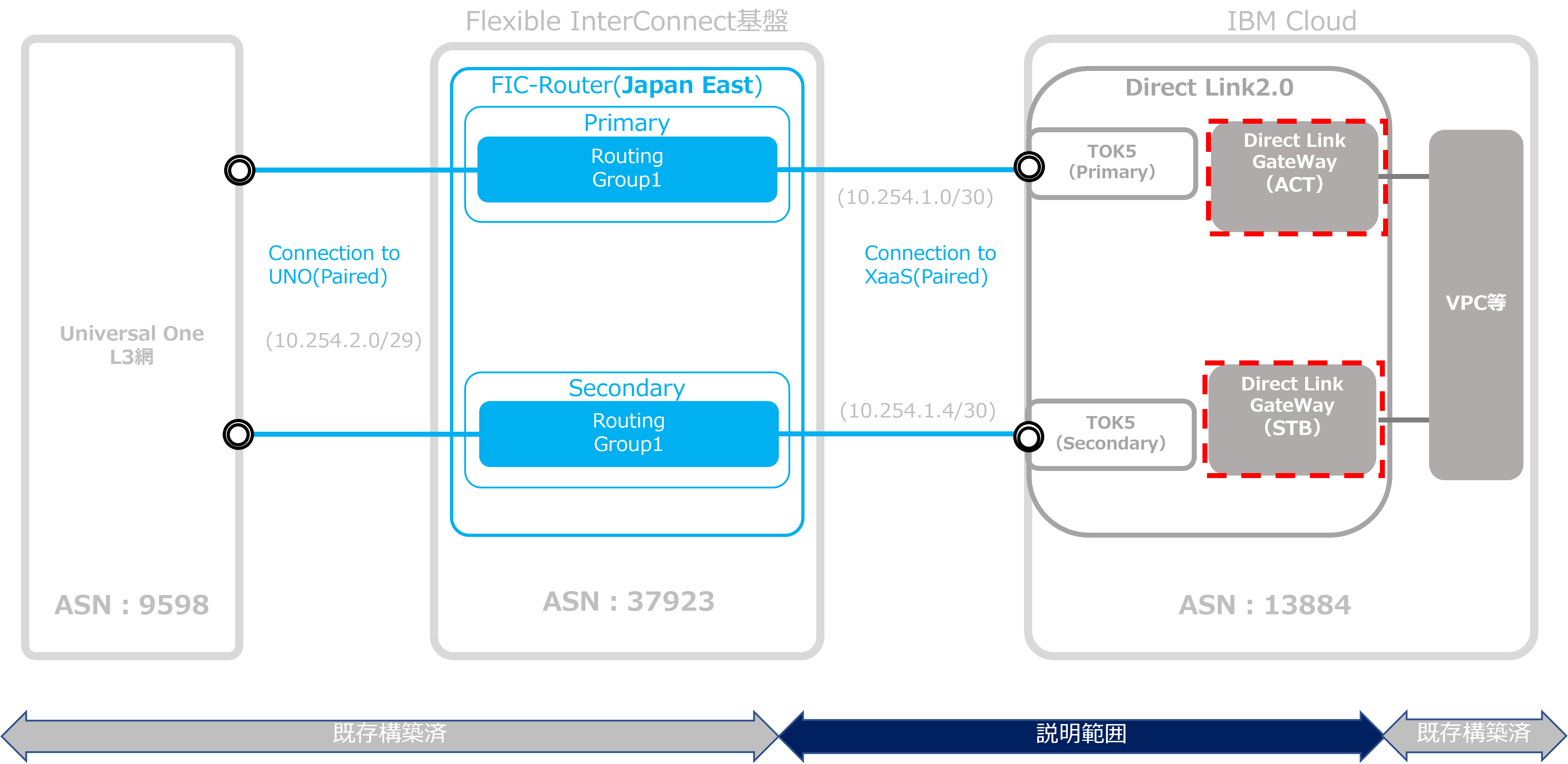 本基本構築ガイドは、日本国内のIBM Cloud拠点に対し、IBM Cloud Direct Link 2.0(TOK05)を経由しFlexible InterConnect(以下FIC)にて接続する際の代表的なモデルの構築手順を提示することにより、FICのご利用が初めての方でもスムーズにご利用開始出来ることを目的としています。