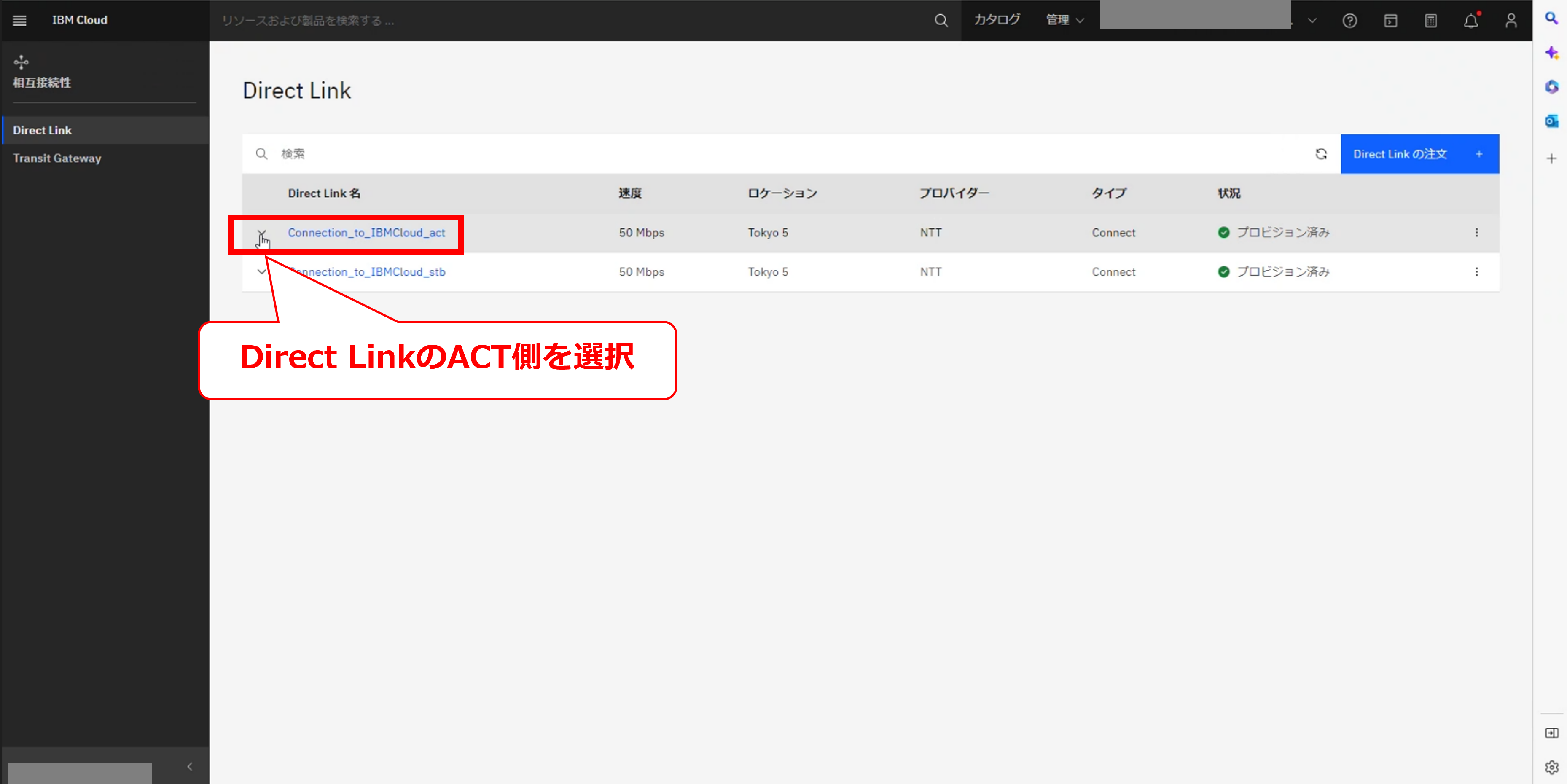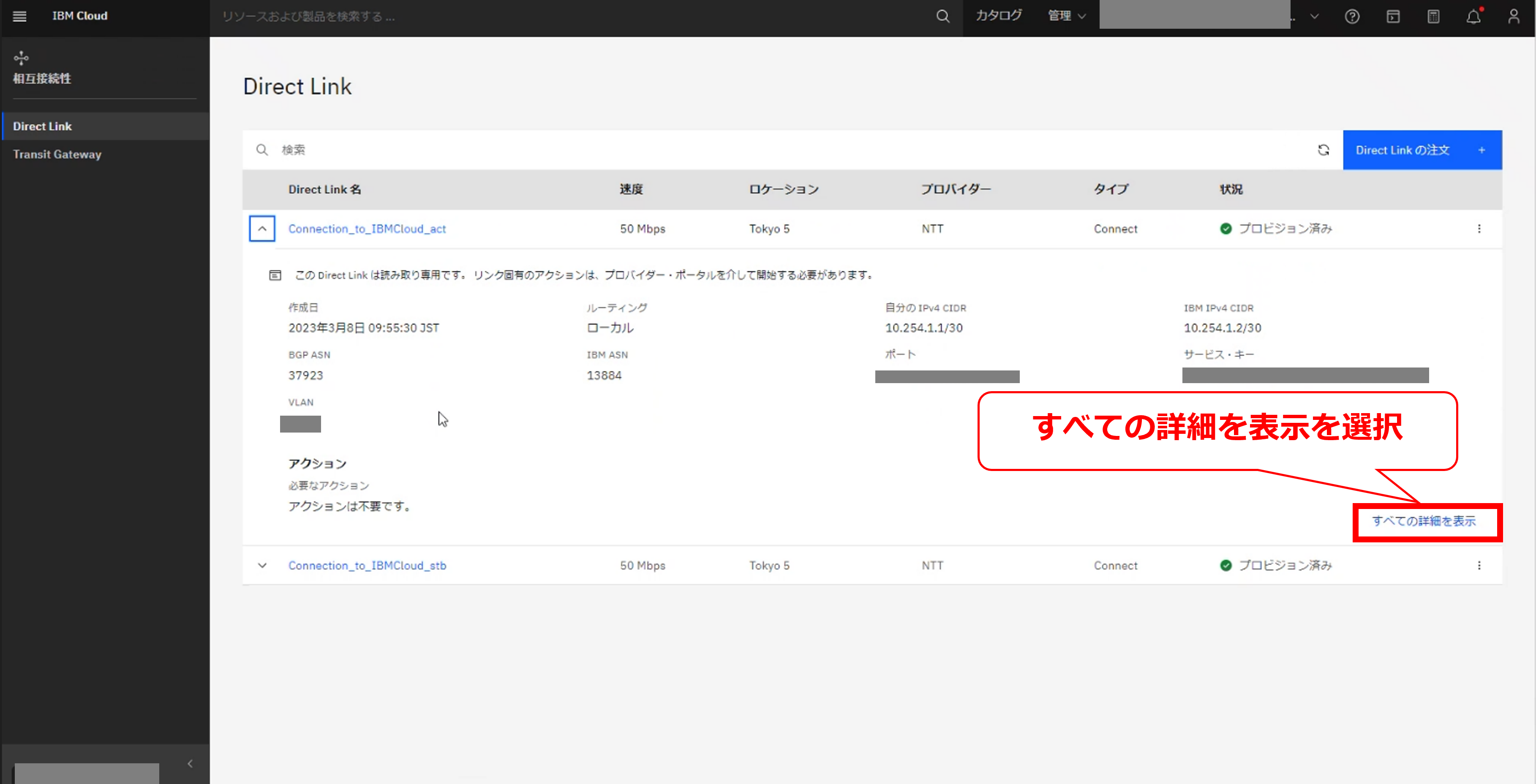 ・FICにてIBM Cloud Direct Link 2.0(TOK05)に接続するお客様(FICコンソールの操作、IBM Cloud コンソールの操作)