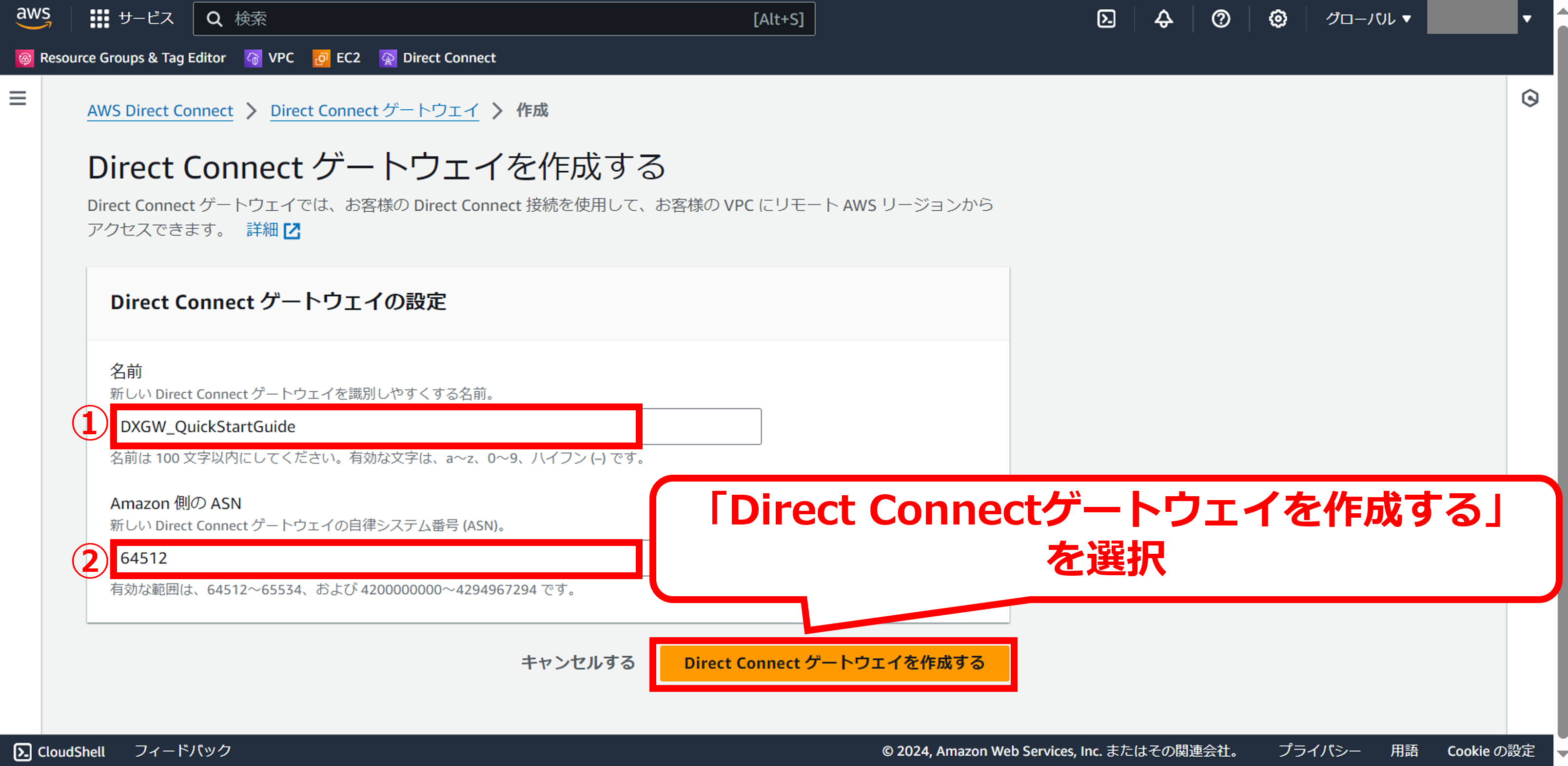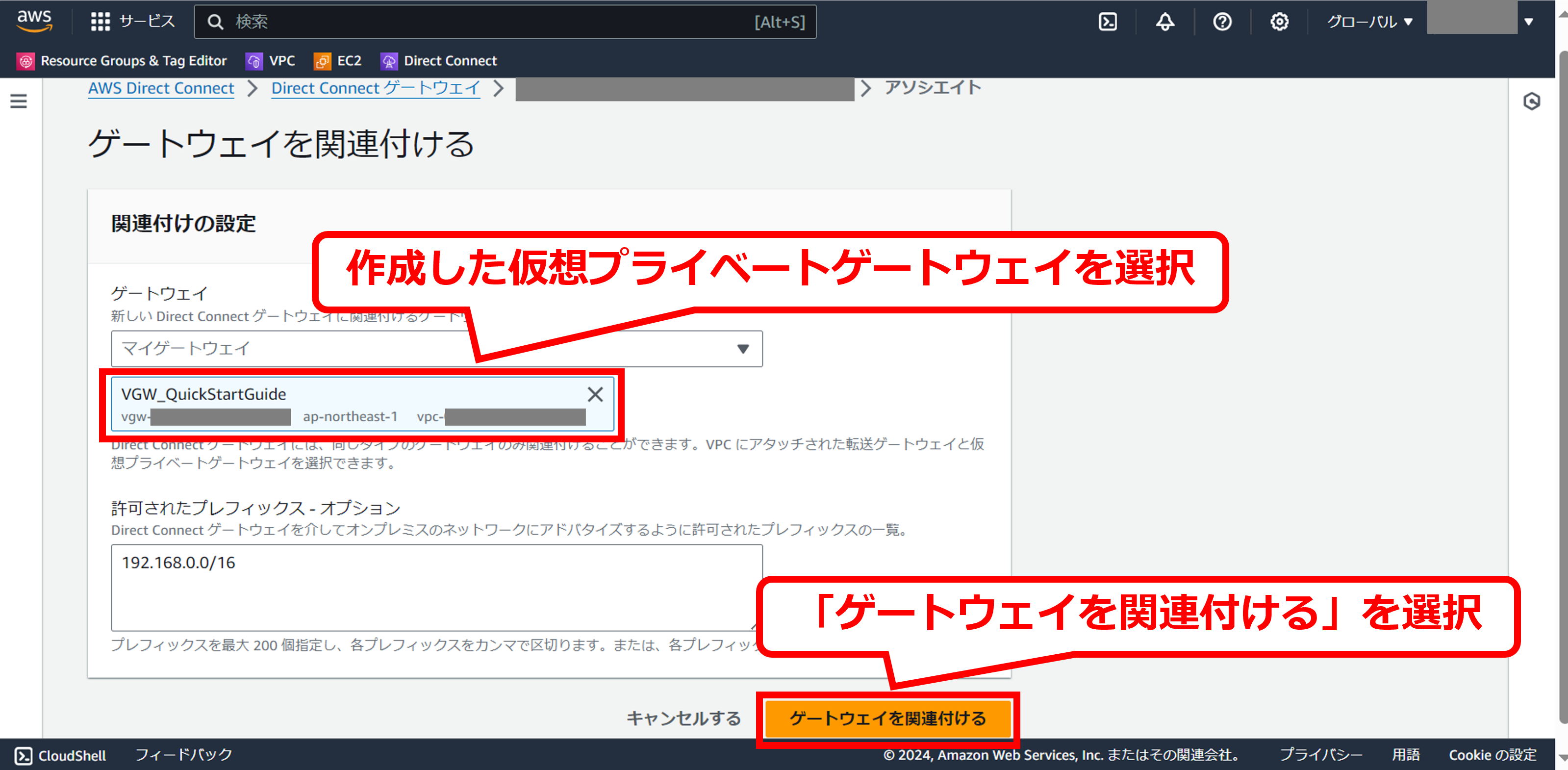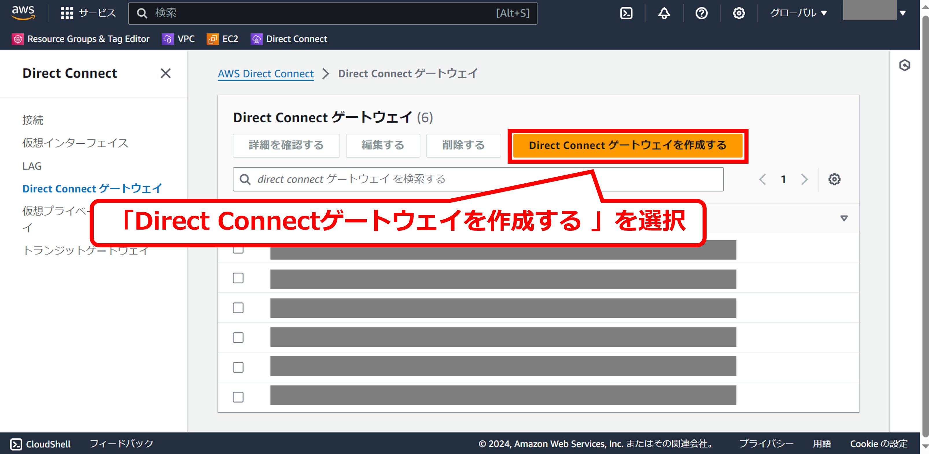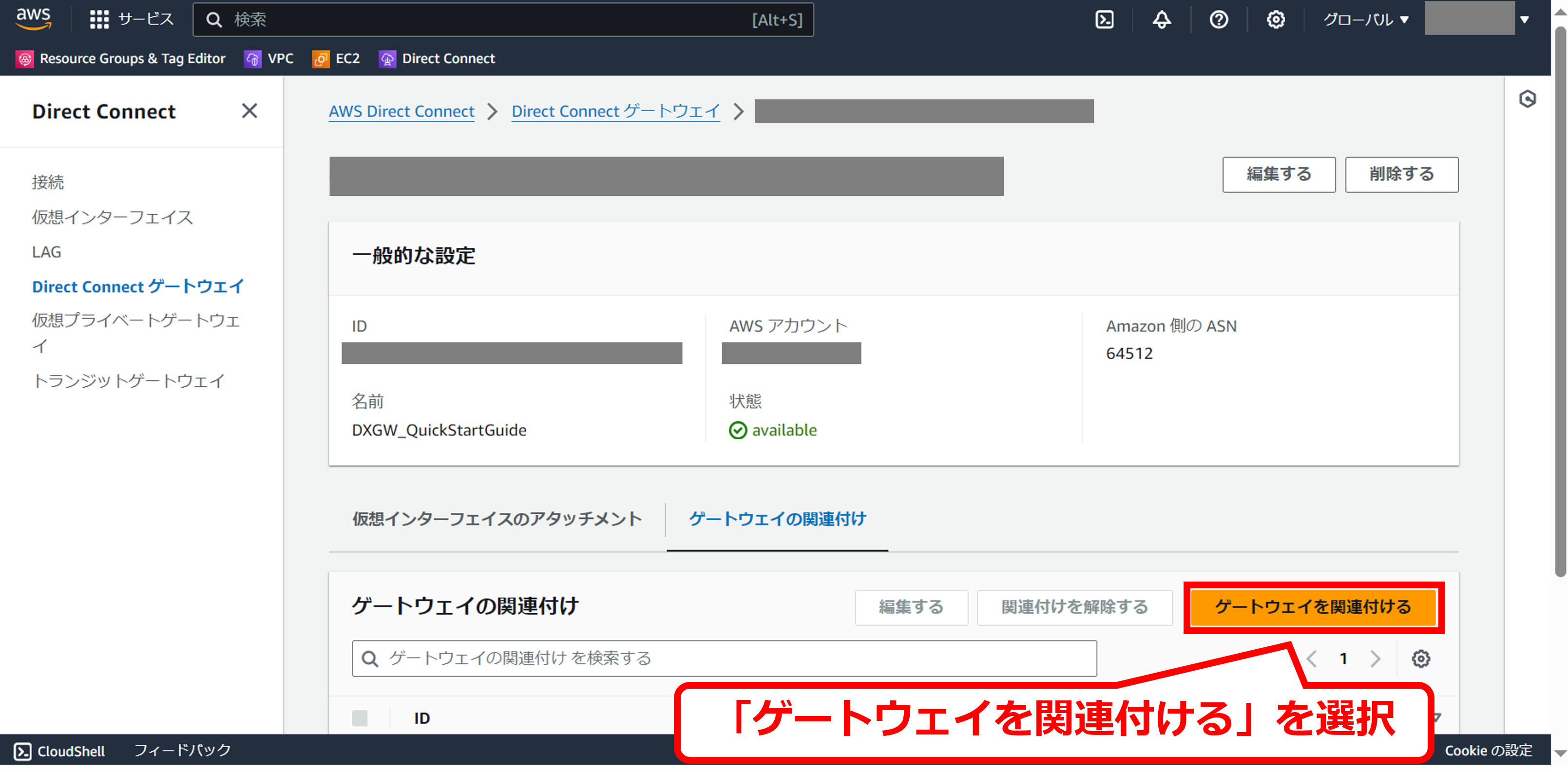 AWSコンソール作業(Direct Connectゲートウェイの作成とVGWとの関連付け) |