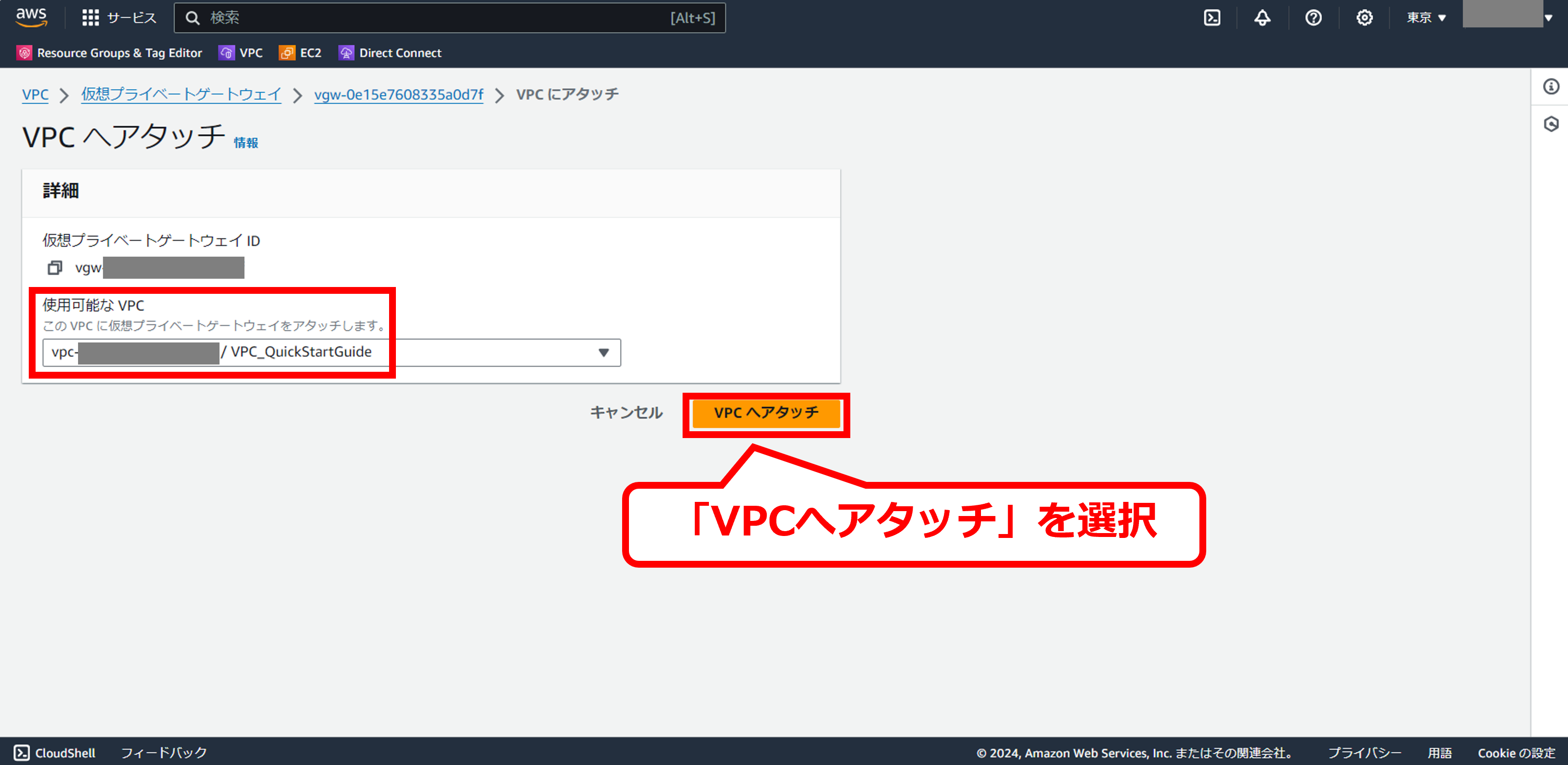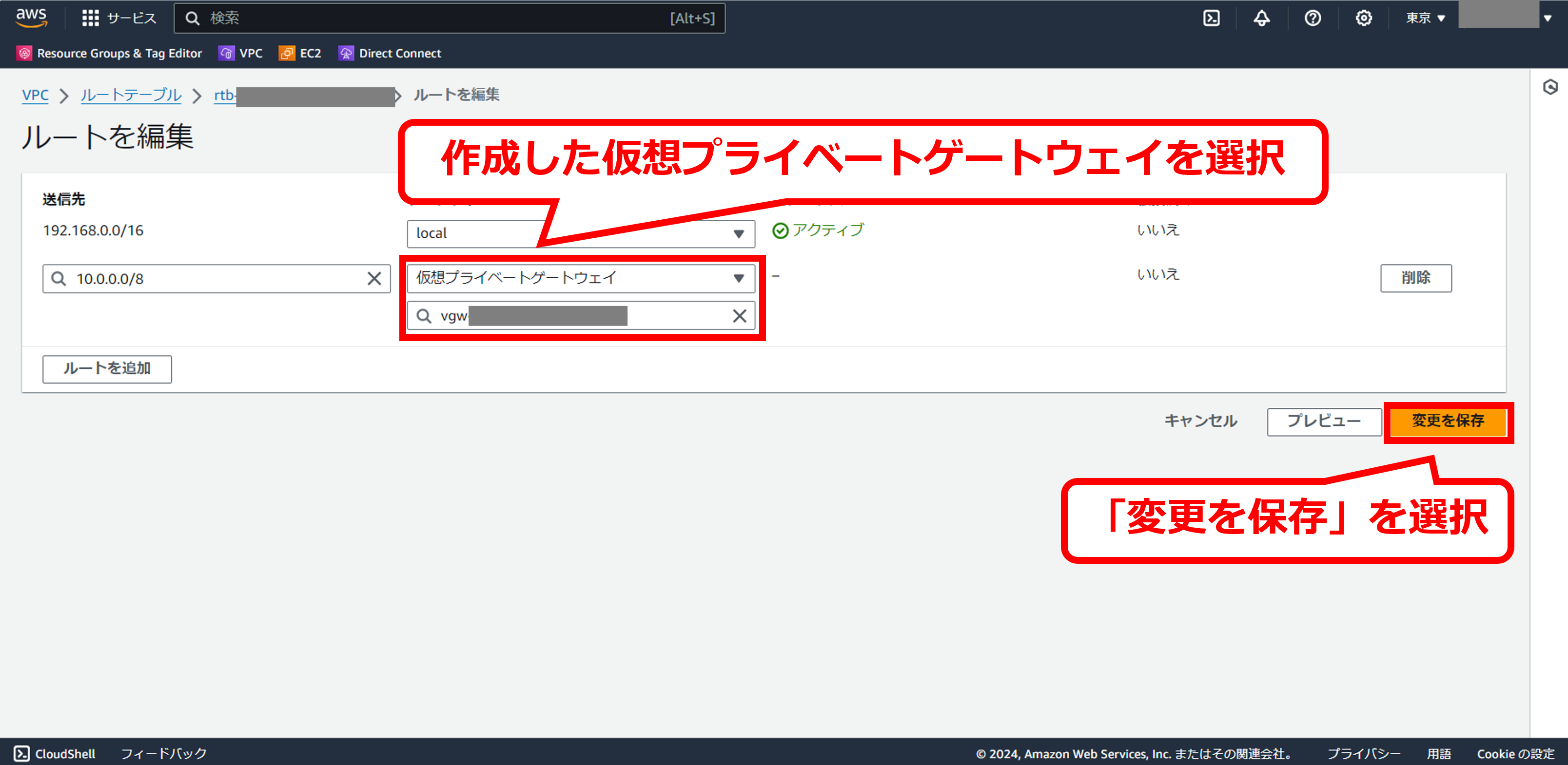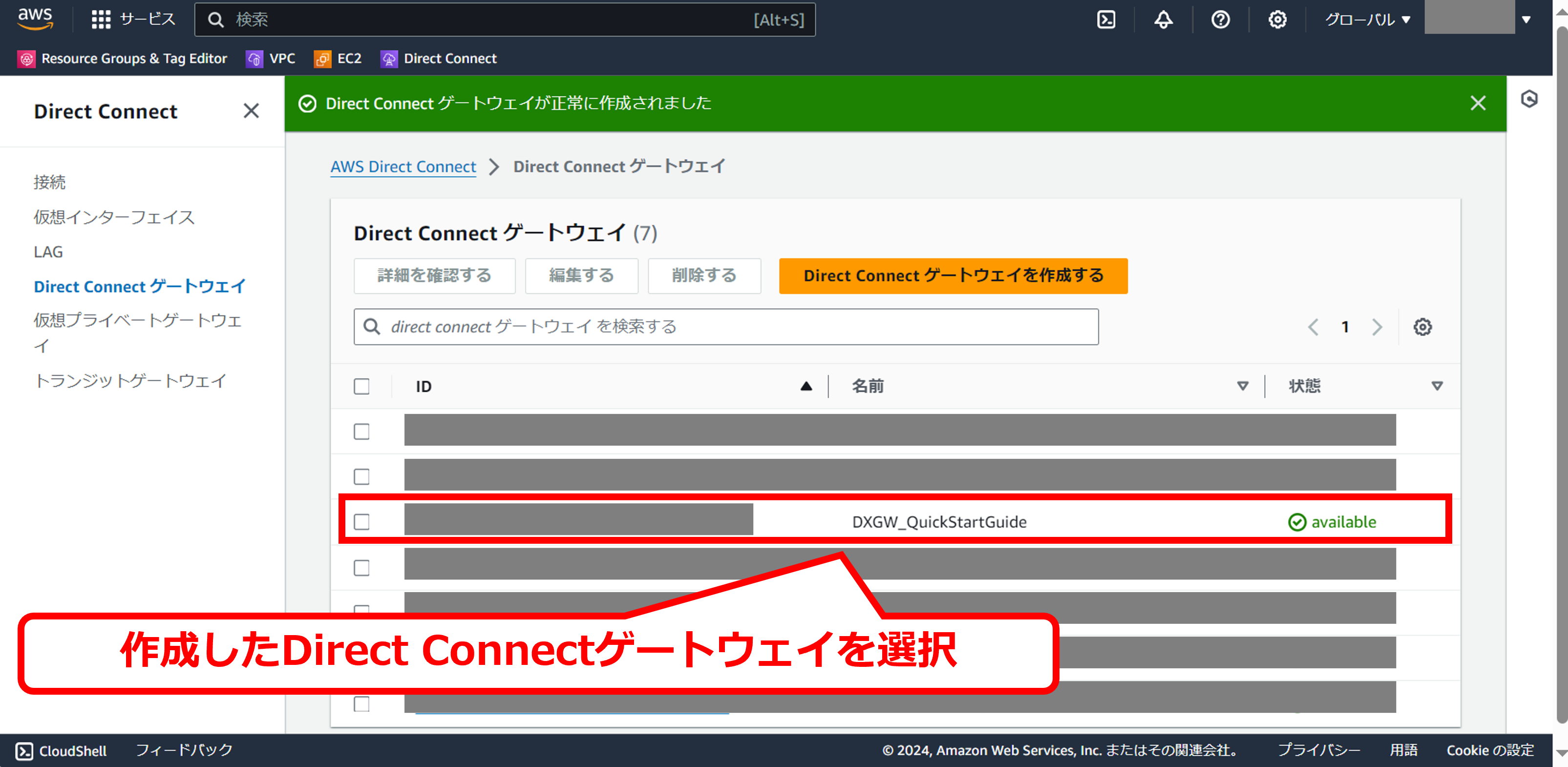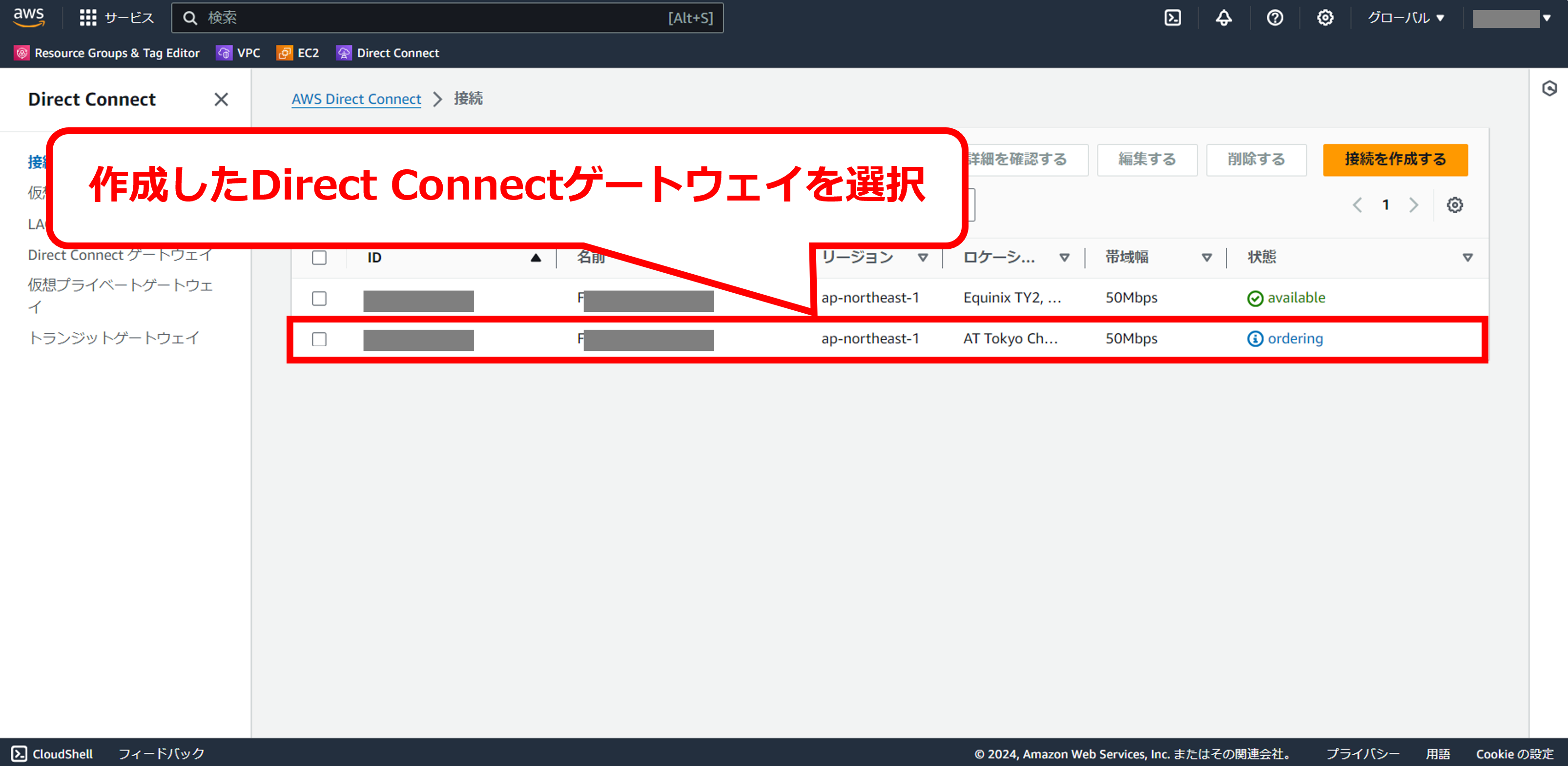 AWSコンソール作業(Direct Connectゲートウェイの作成とVGWとの関連付け) |