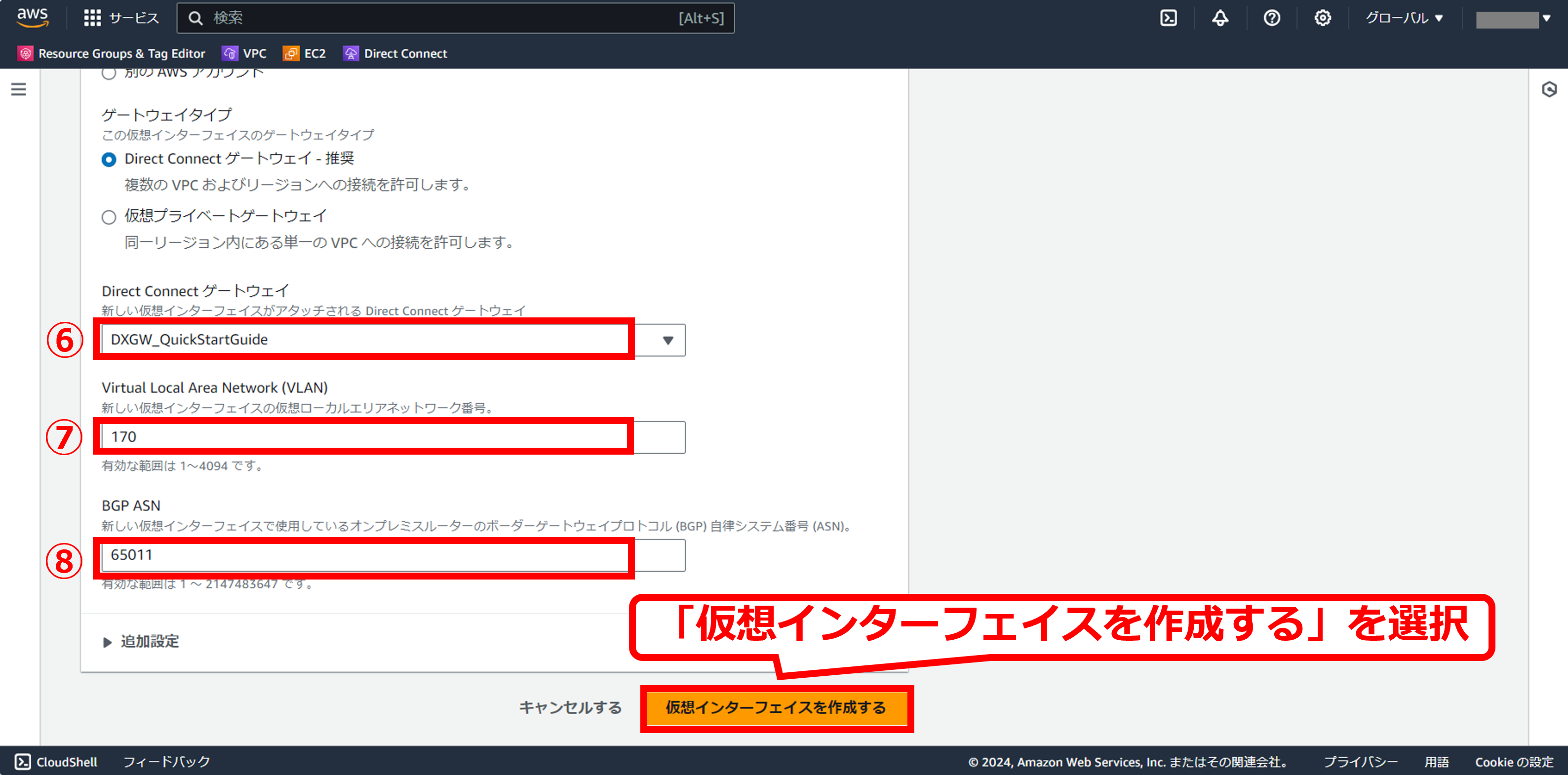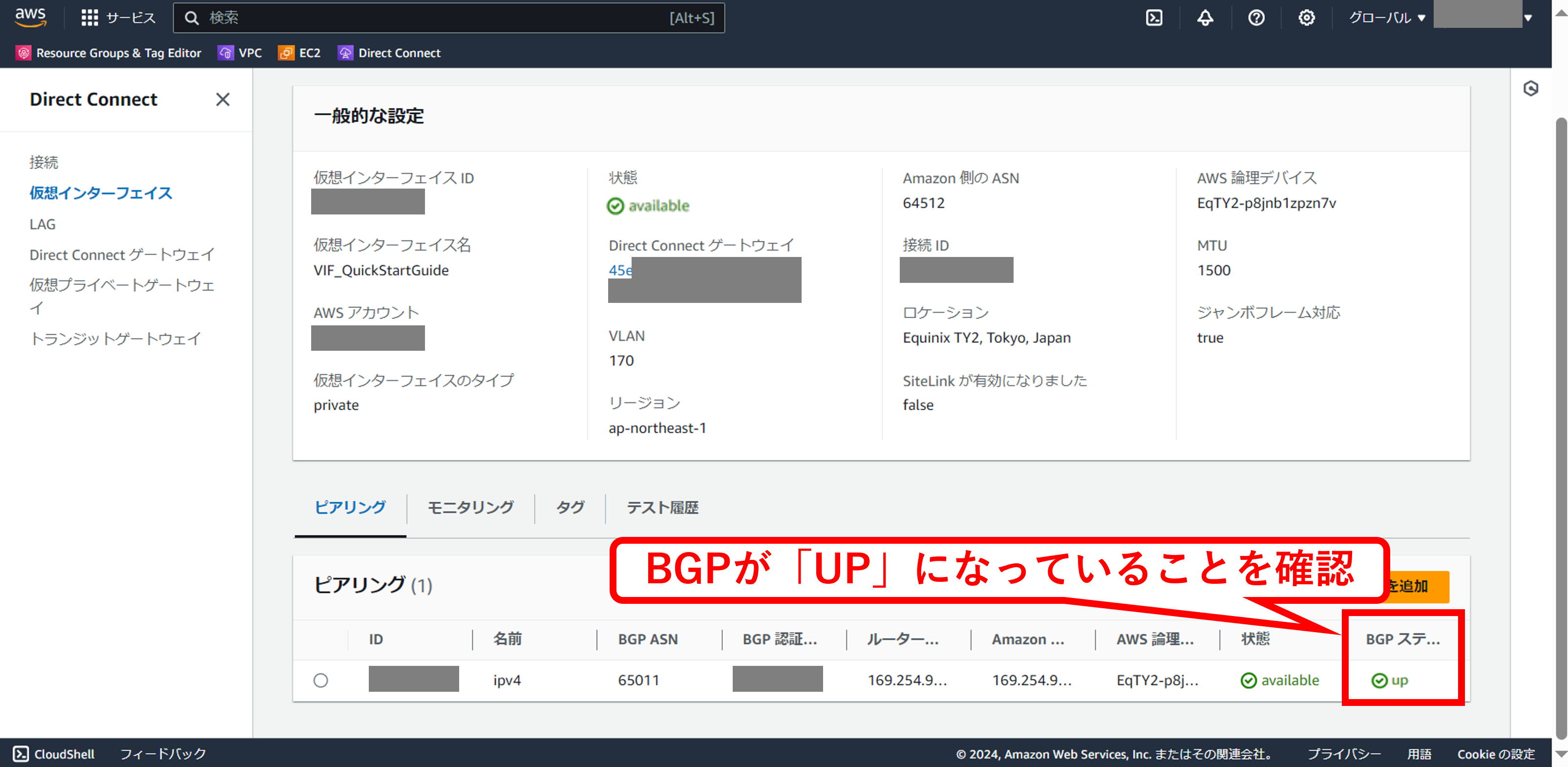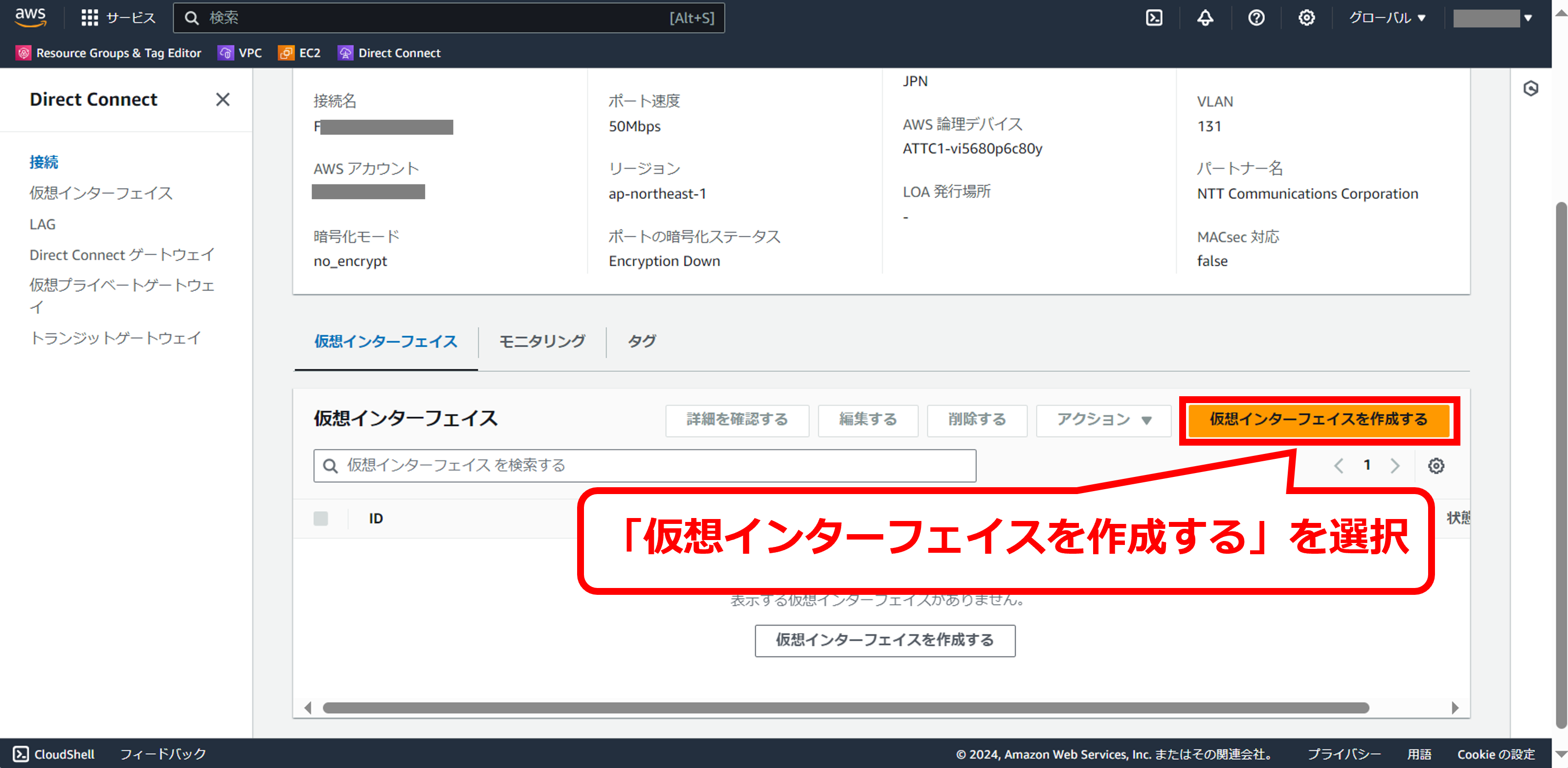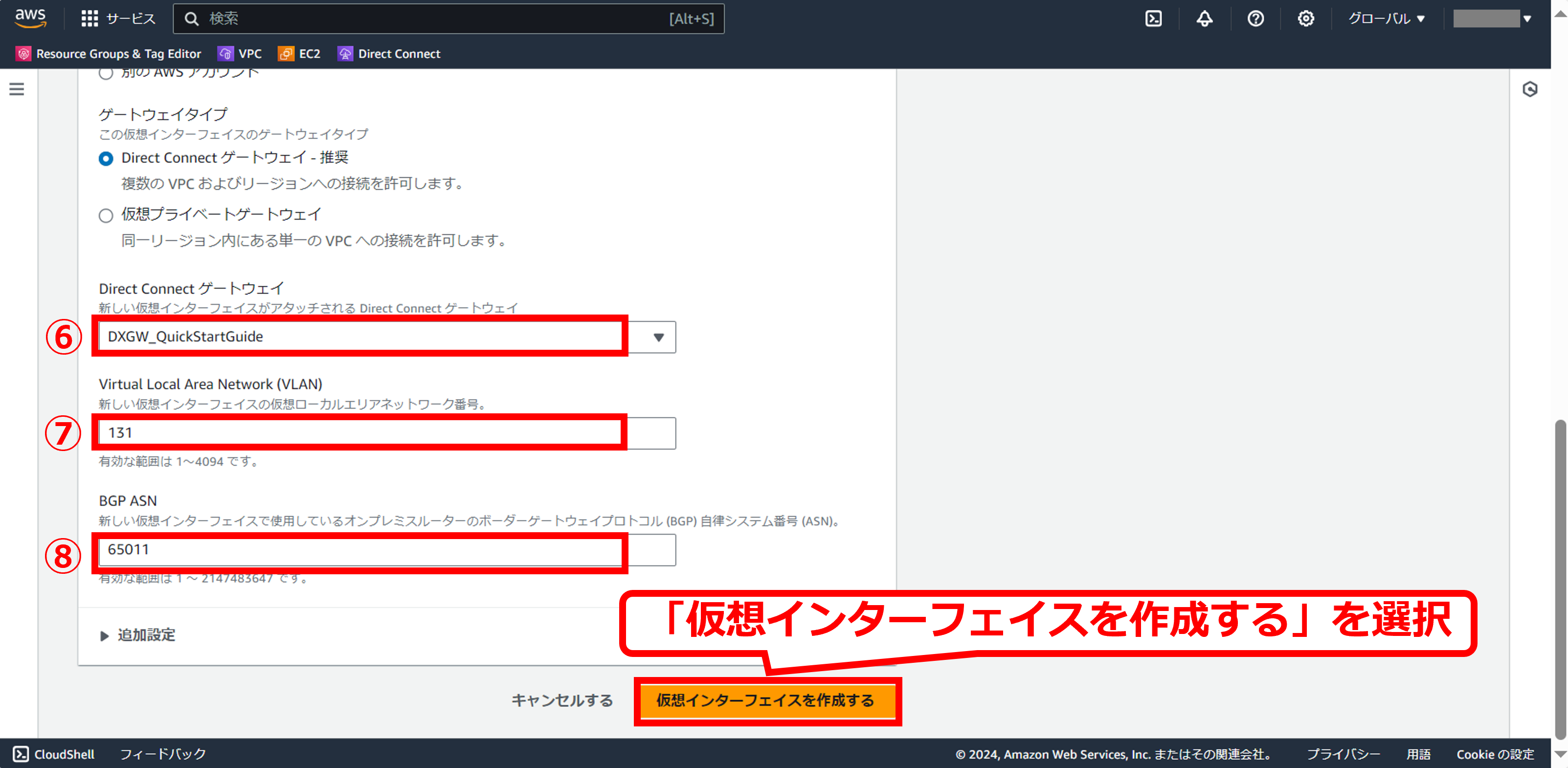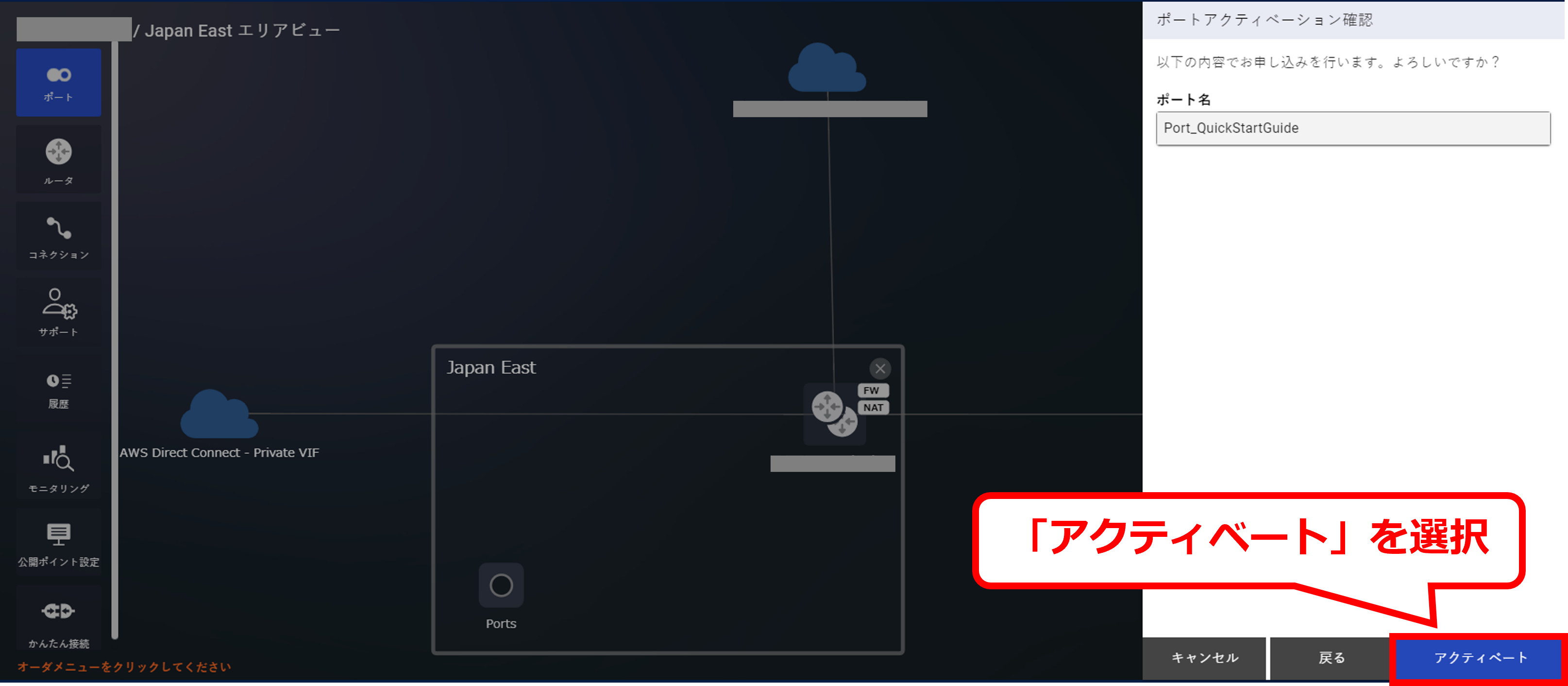 - 物理回線の敷設後、次項に示すアクティベート操作を行ってください。※AWS側の作業(手順:6.7~6.9)についてはポートのアクティベート前でも実施可能です。