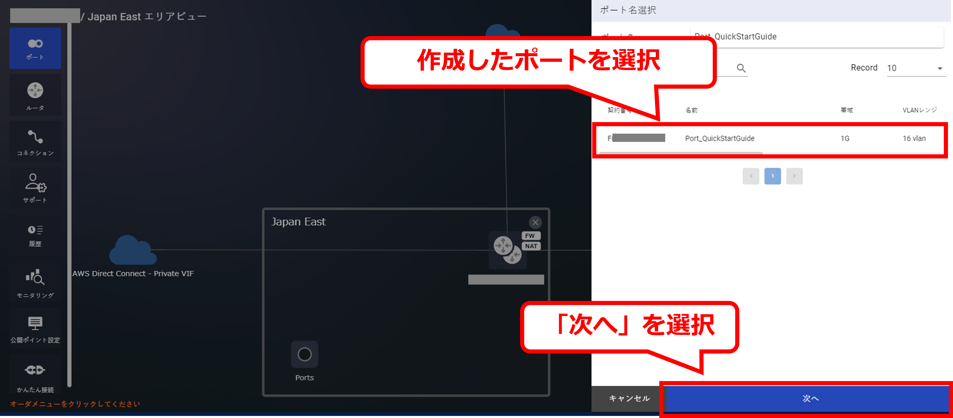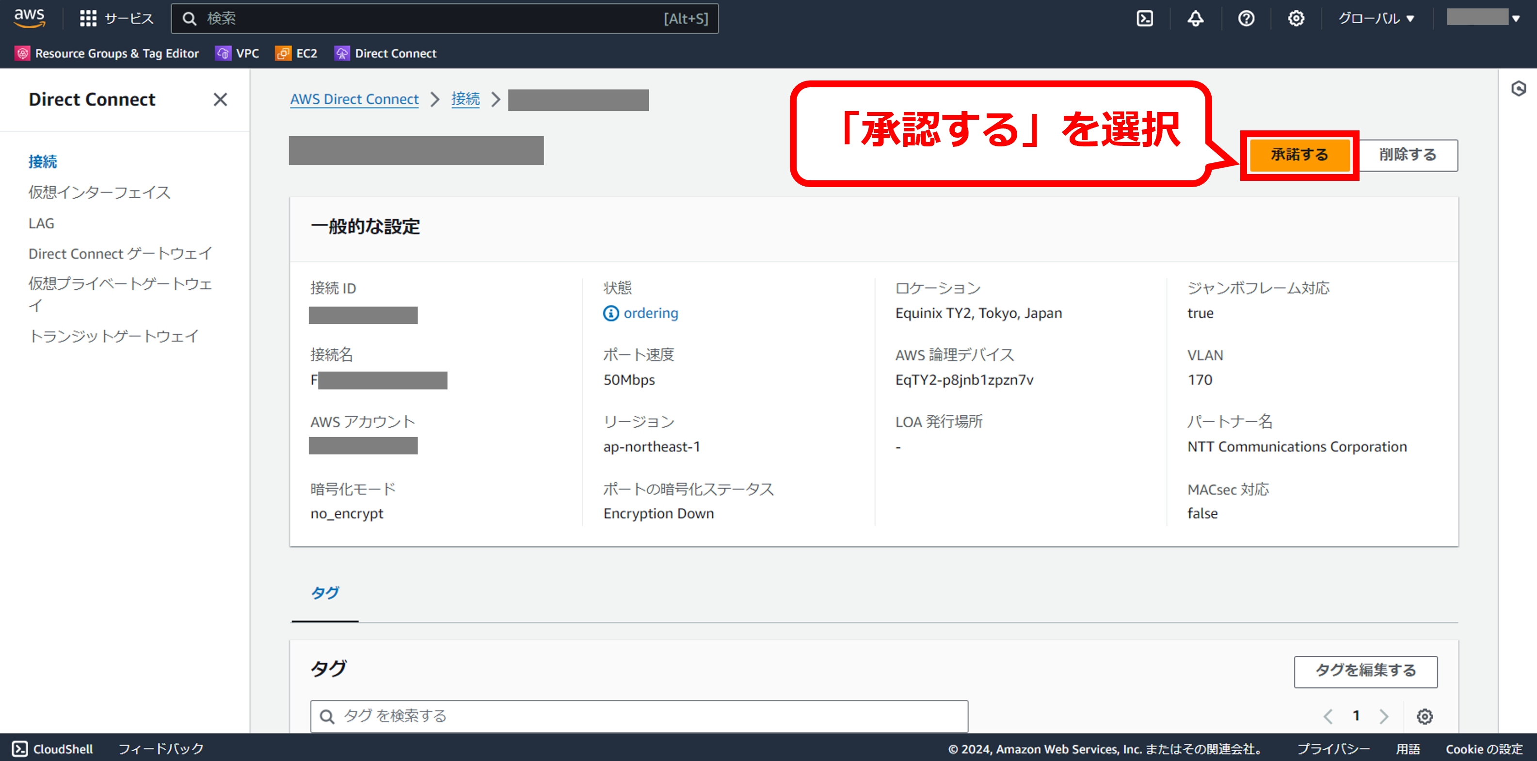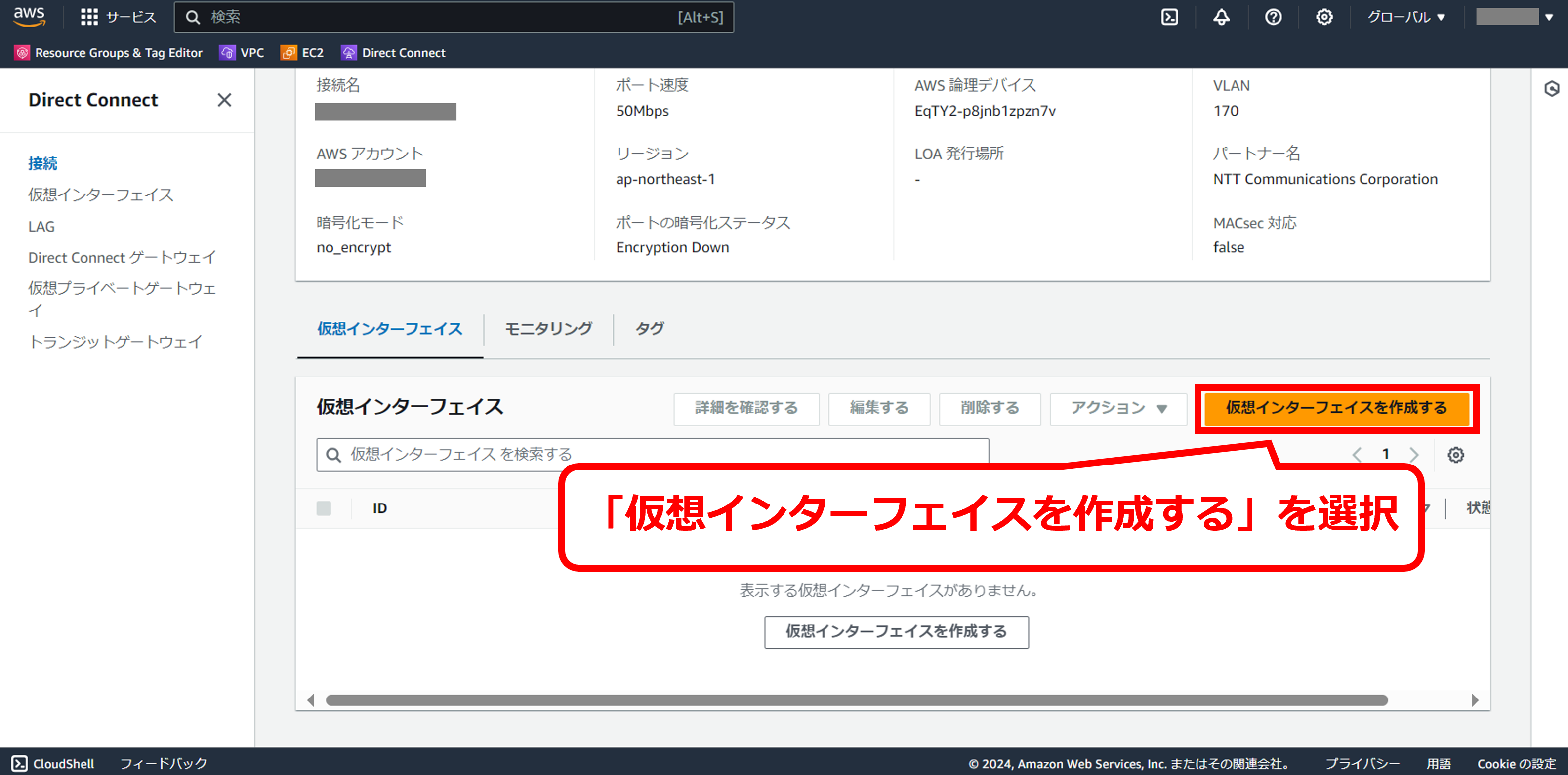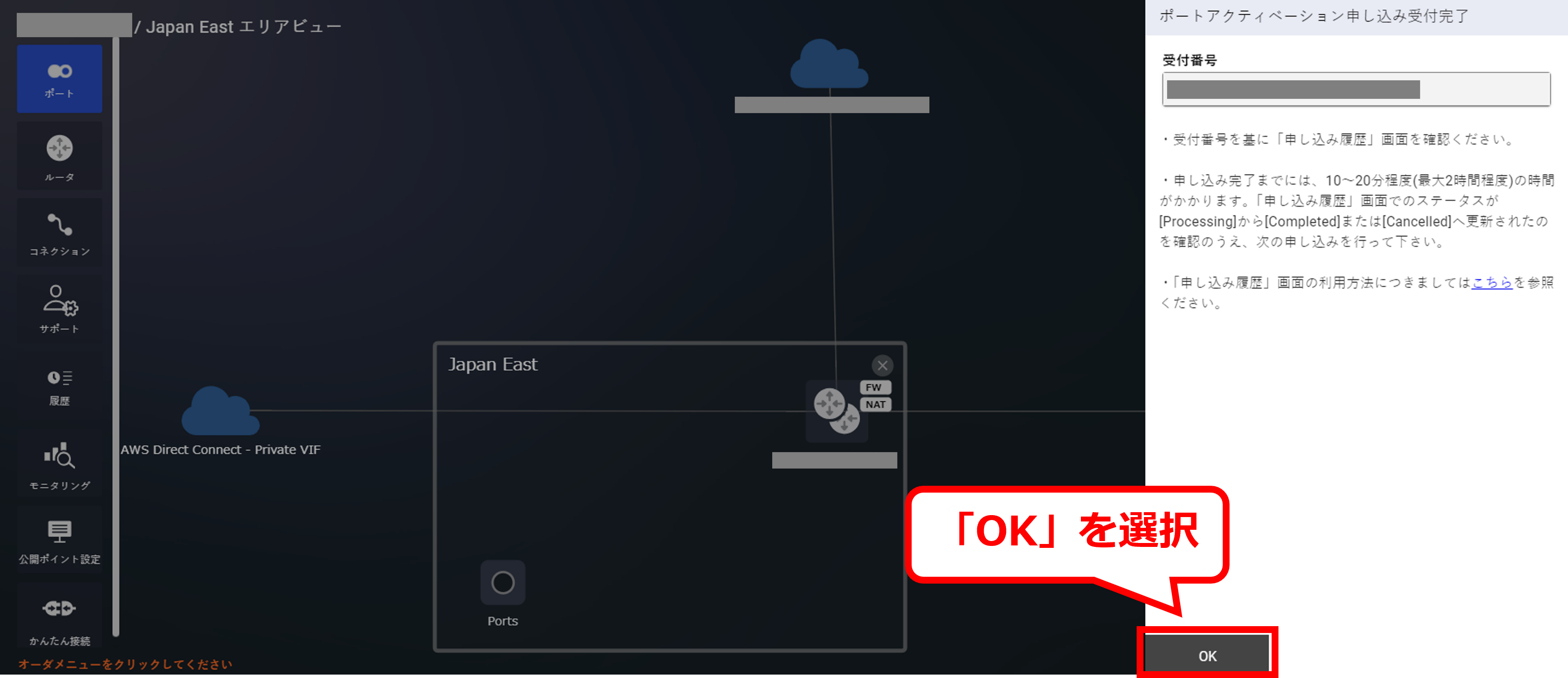 - 物理回線の敷設後、次項に示すアクティベート操作を行ってください。※AWS側の作業(手順:6.7~6.9)についてはポートのアクティベート前でも実施可能です。