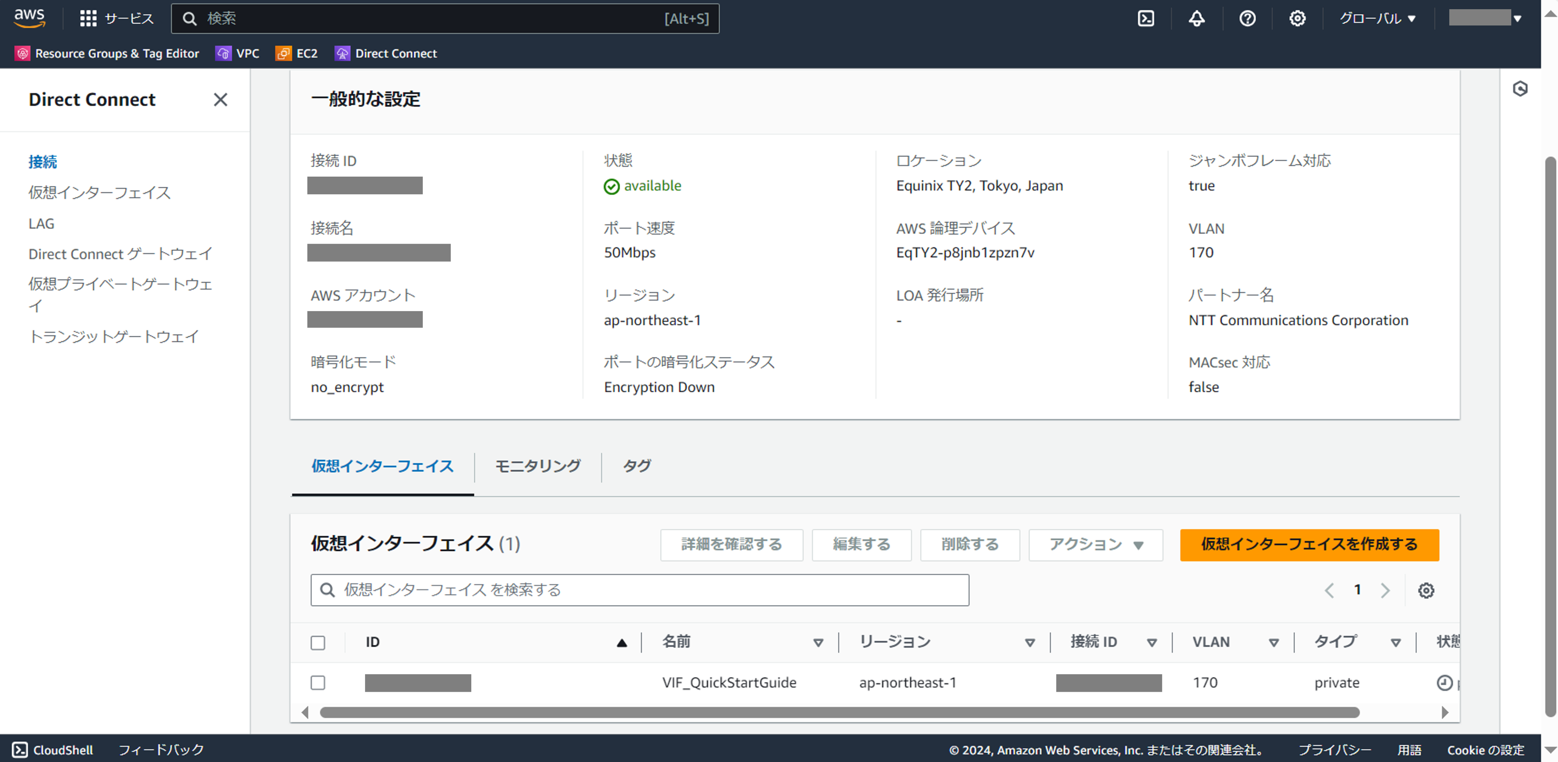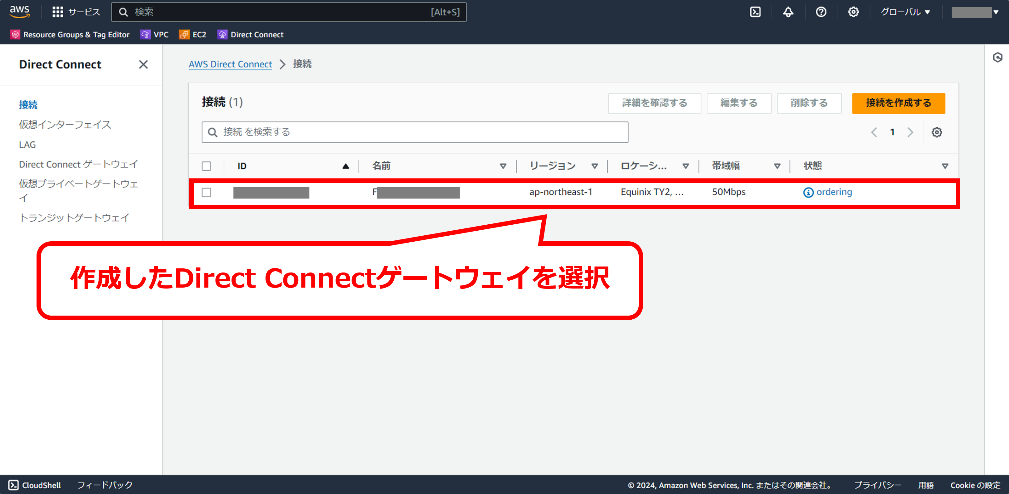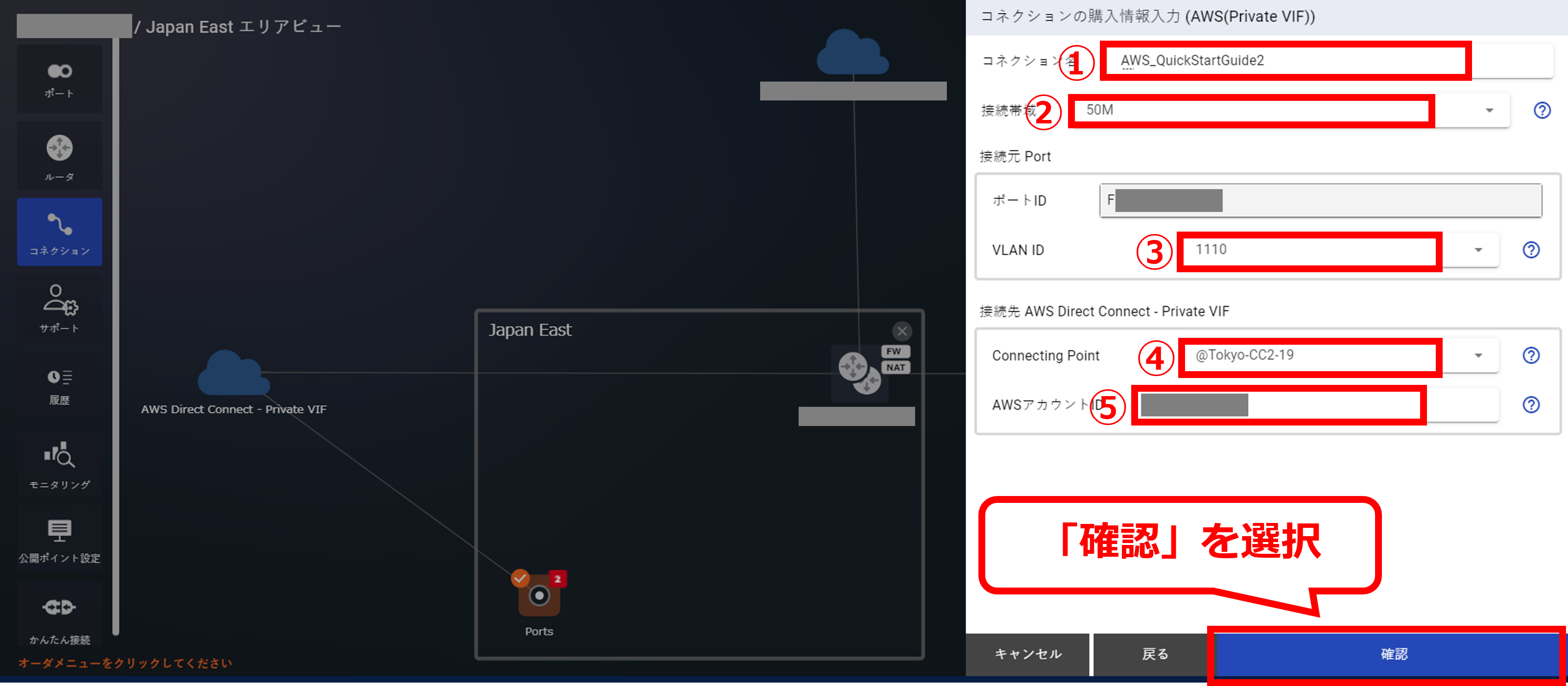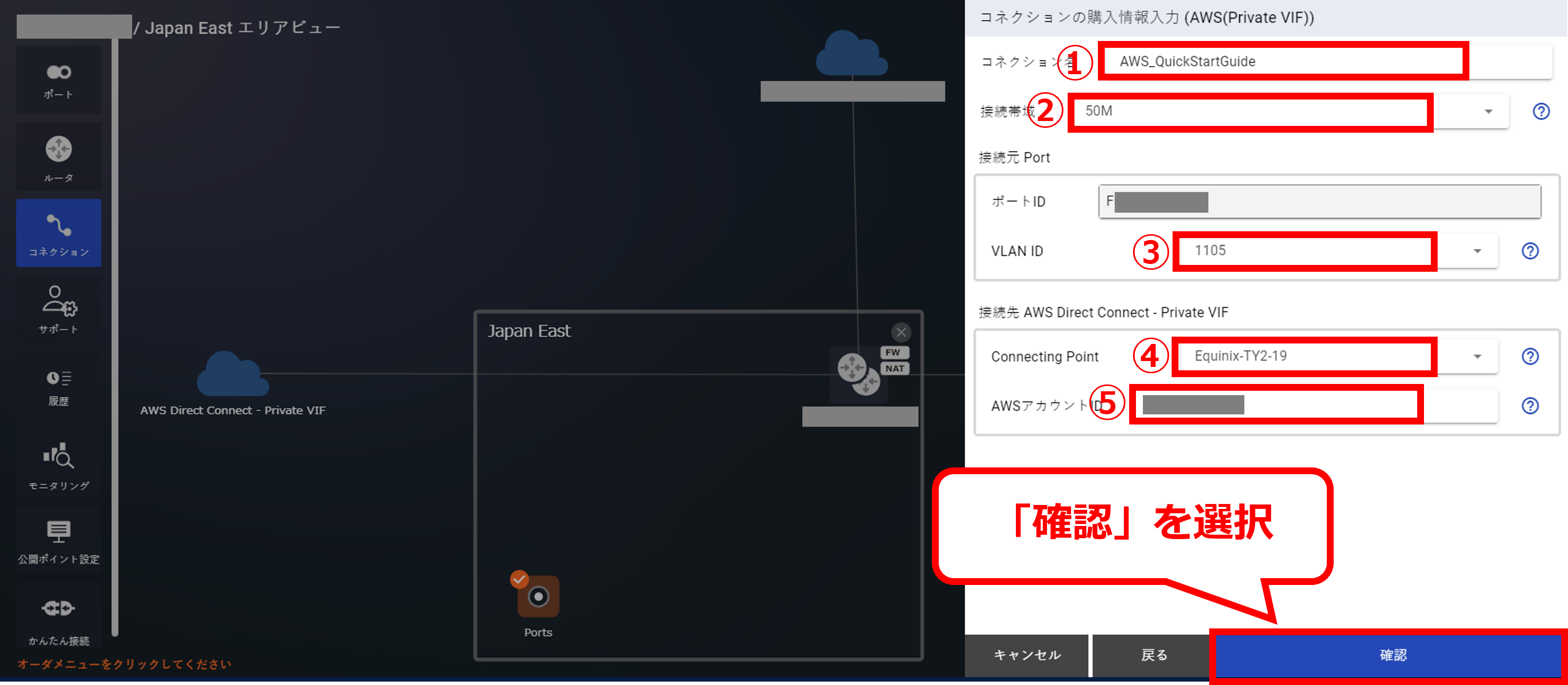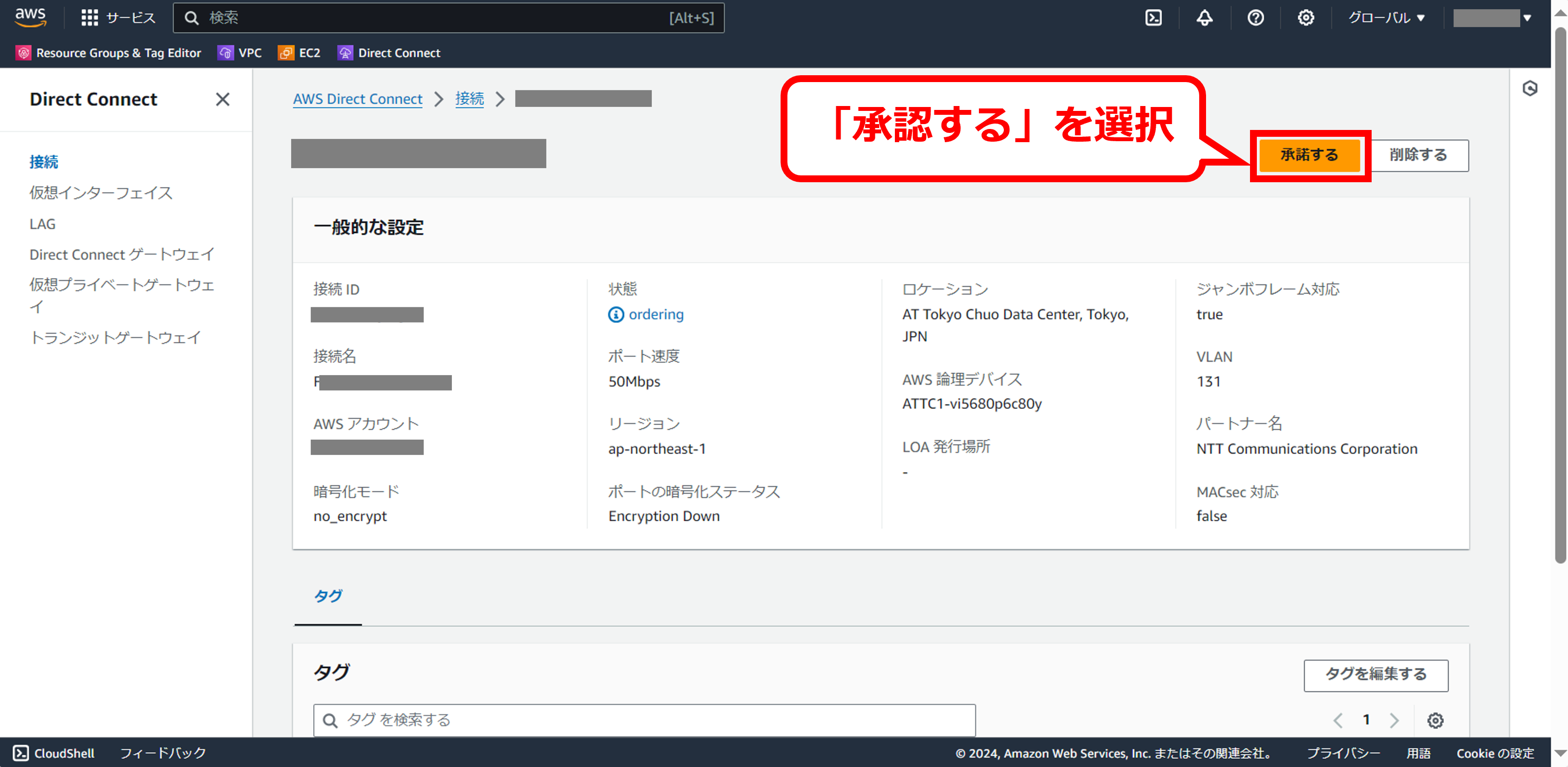 - 物理回線の敷設後、次項に示すアクティベート操作を行ってください。※AWS側の作業(手順:6.7~6.9)についてはポートのアクティベート前でも実施可能です。