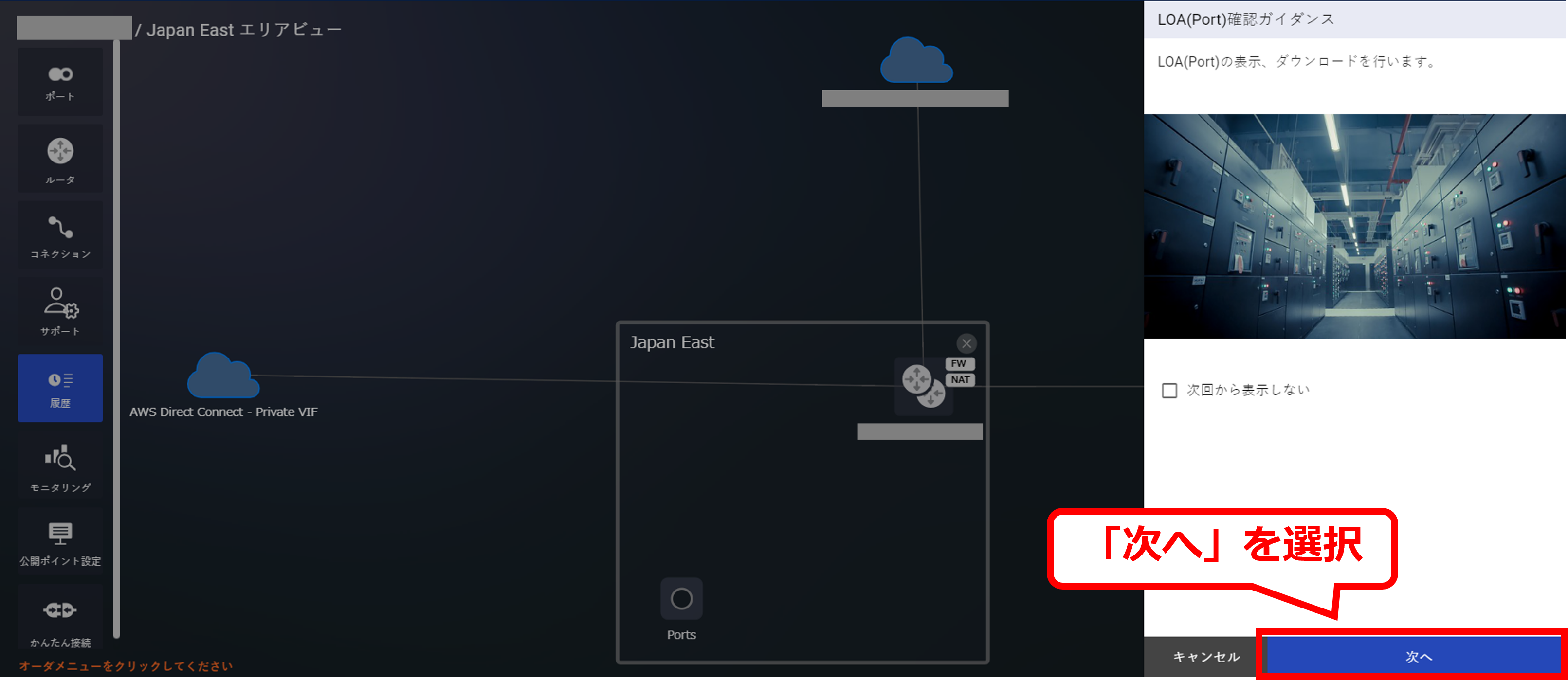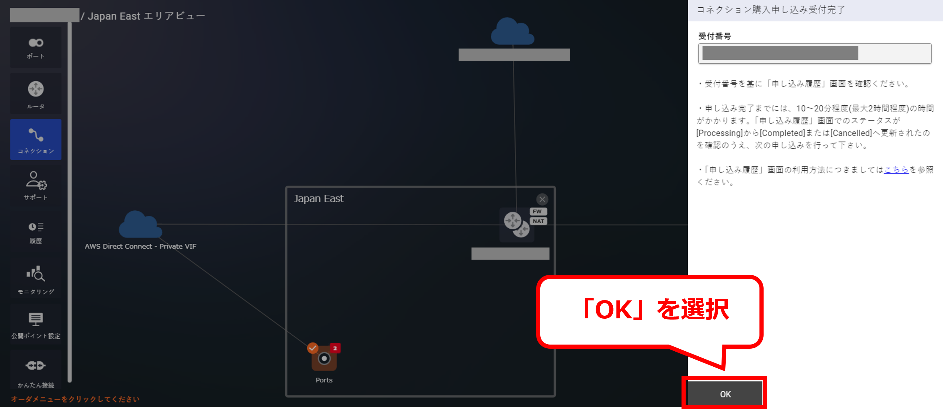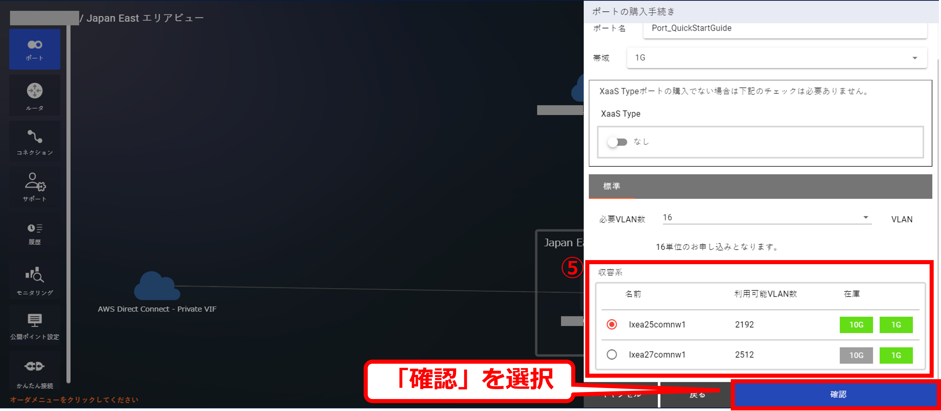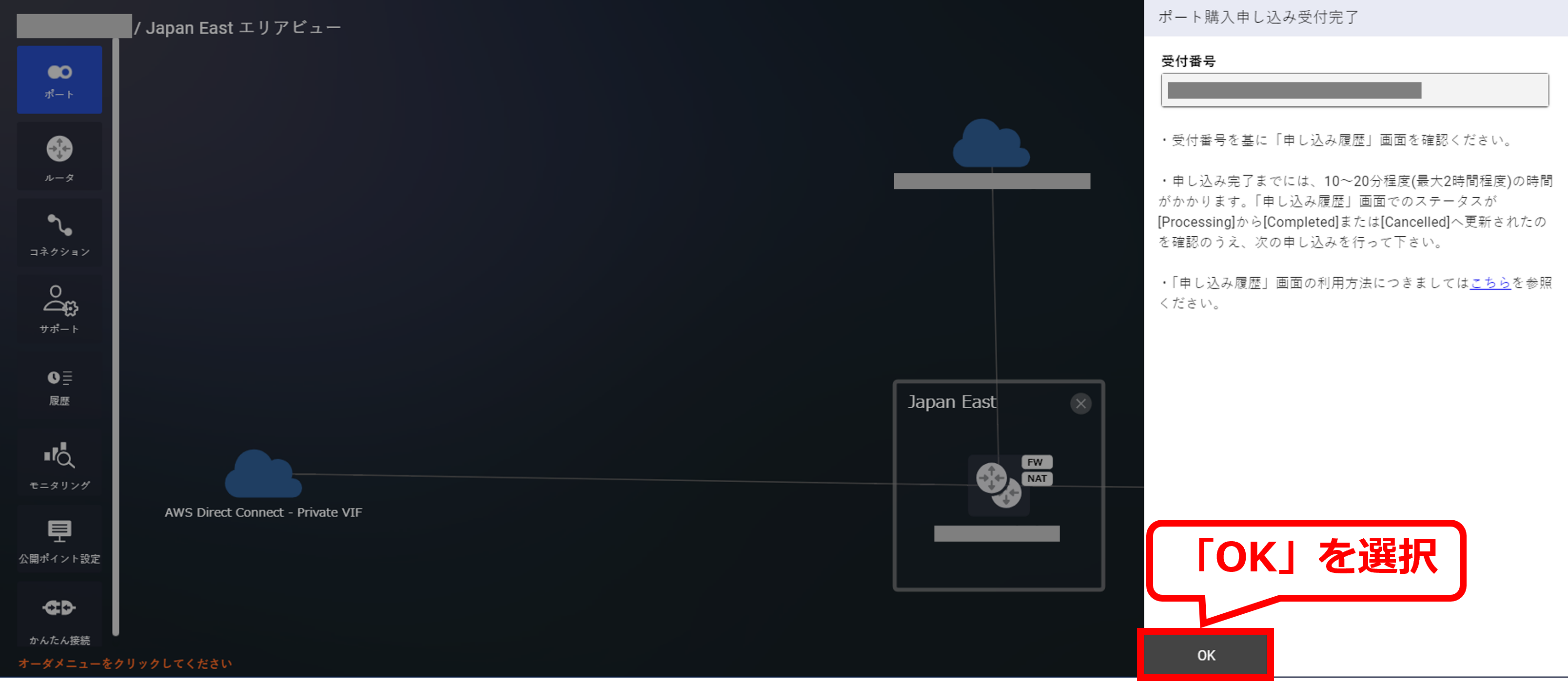 - 物理回線の敷設後、次項に示すアクティベート操作を行ってください。※AWS側の作業(手順:6.7~6.9)についてはポートのアクティベート前でも実施可能です。