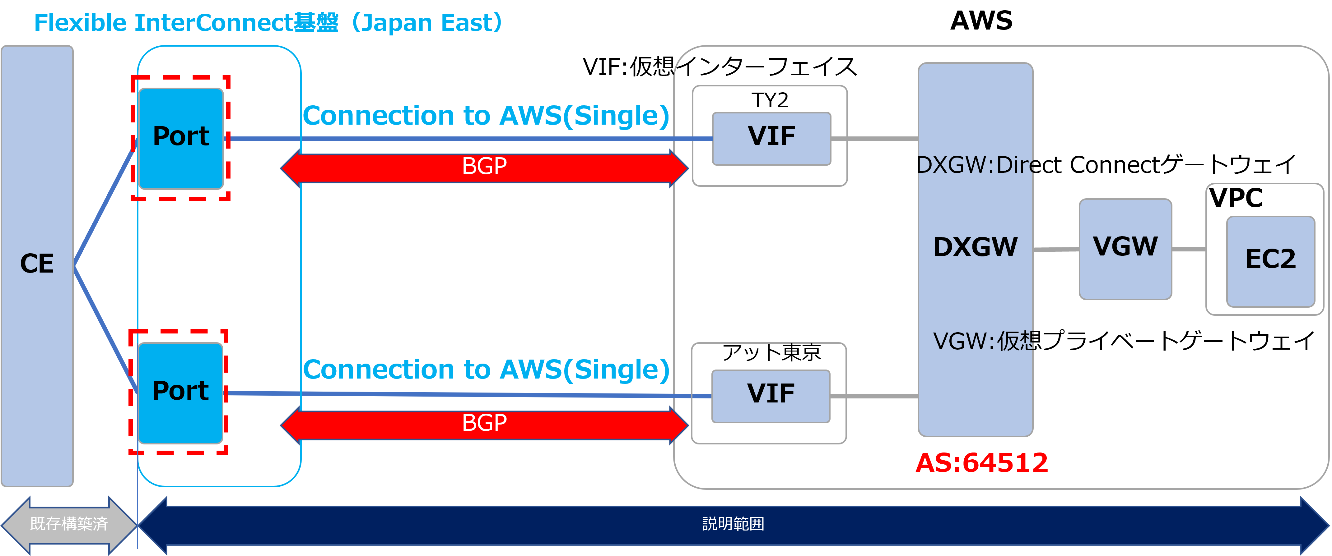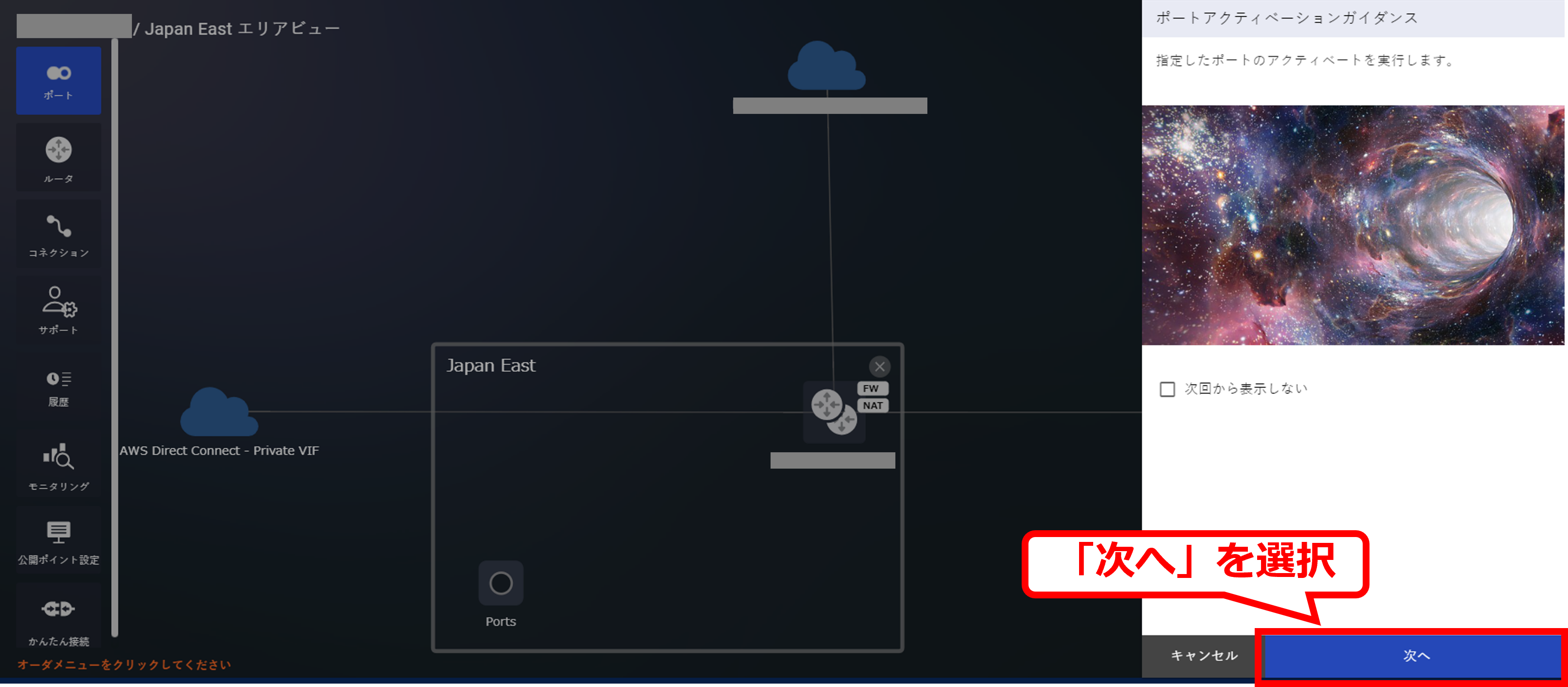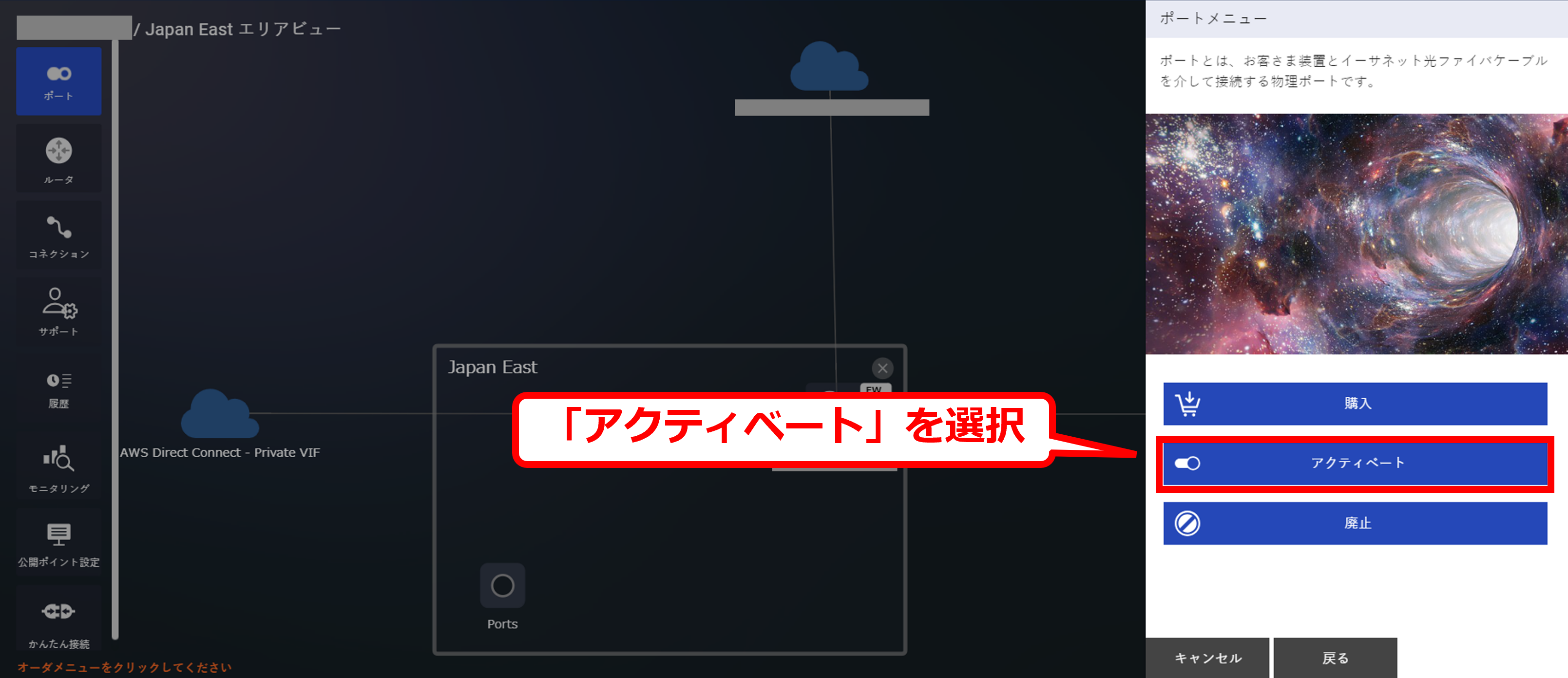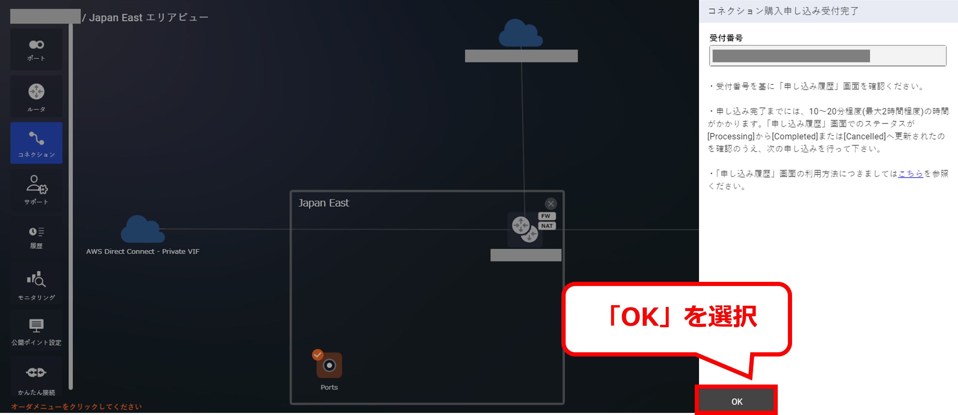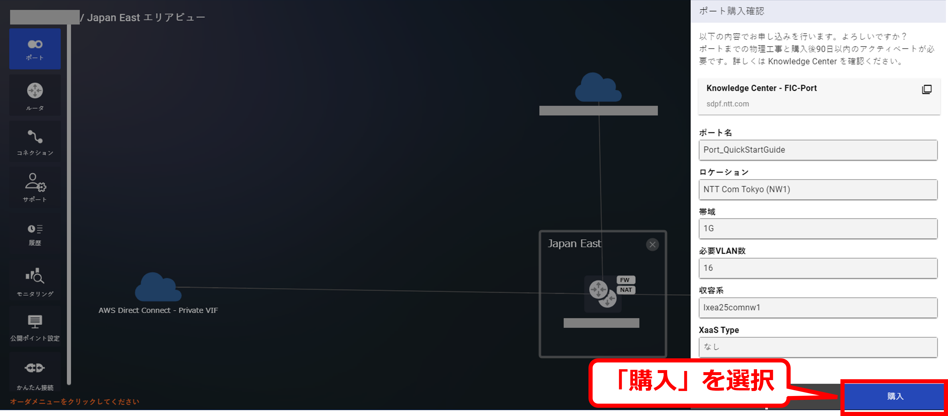 - 物理回線の敷設後、次項に示すアクティベート操作を行ってください。※AWS側の作業(手順:6.7~6.9)についてはポートのアクティベート前でも実施可能です。