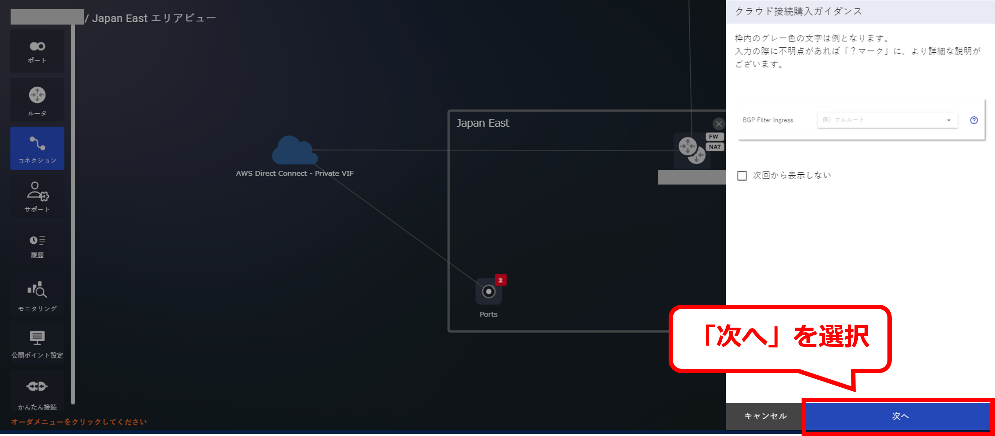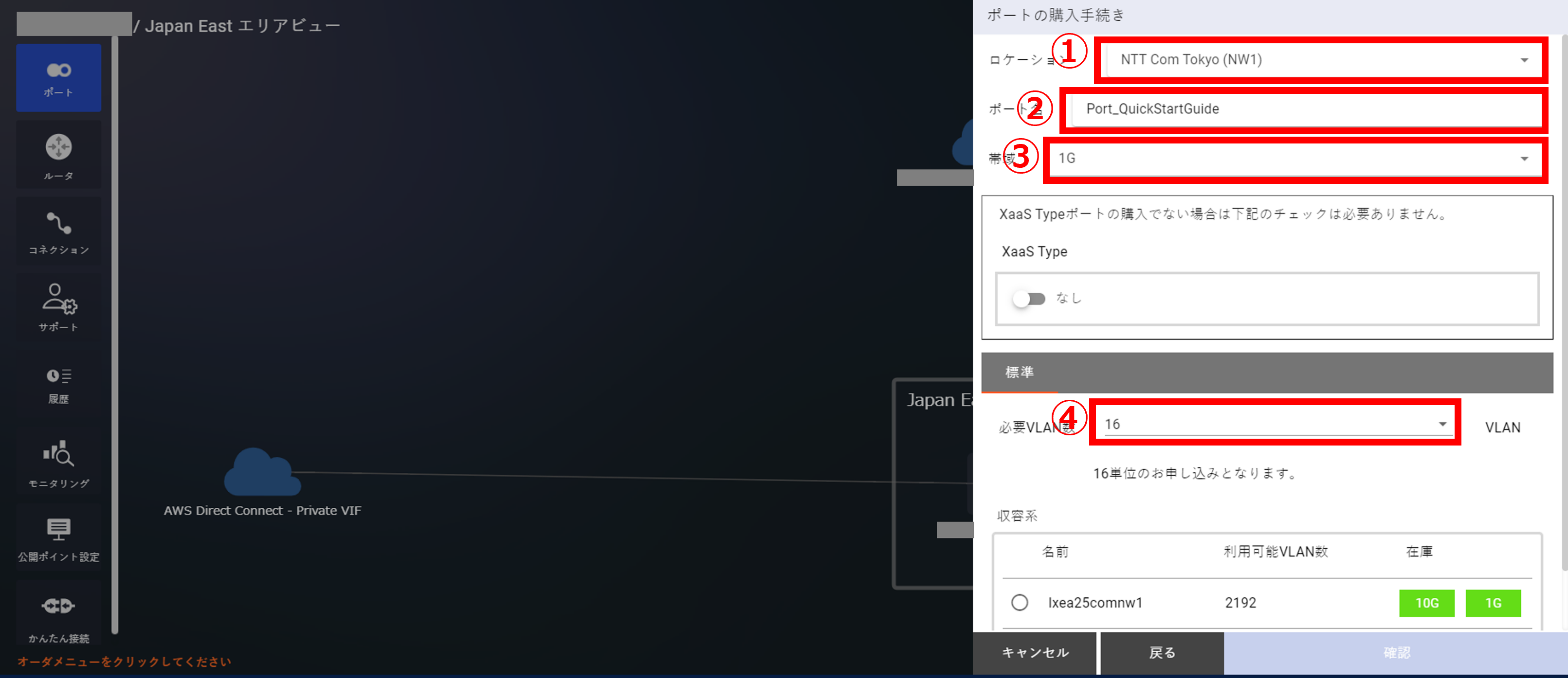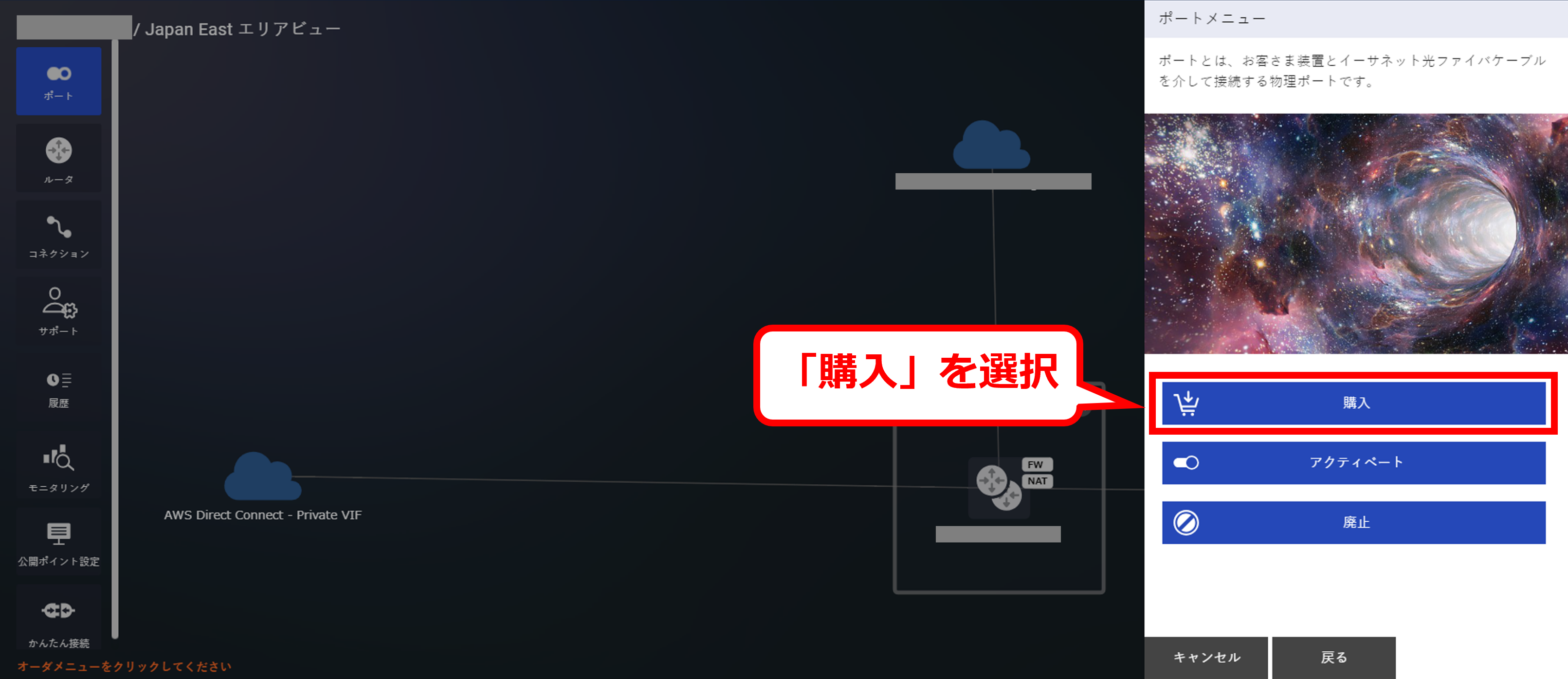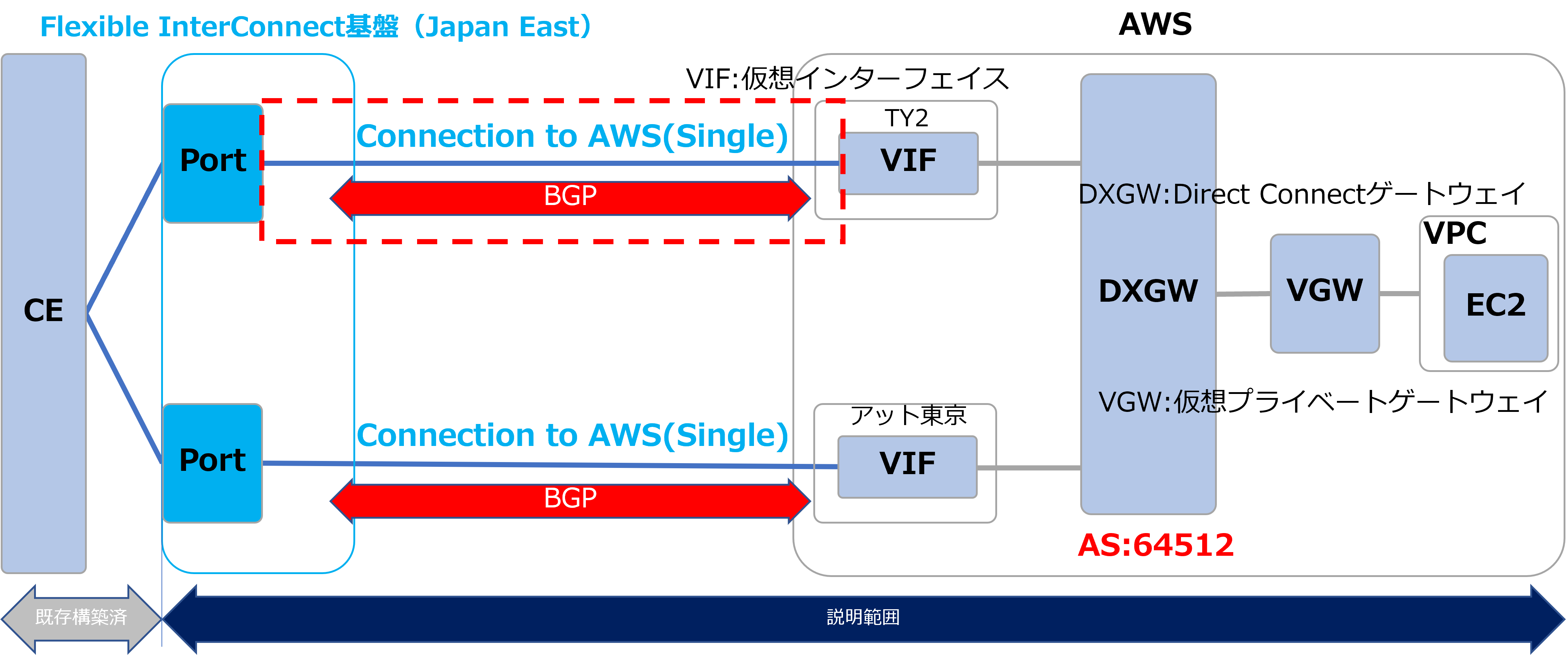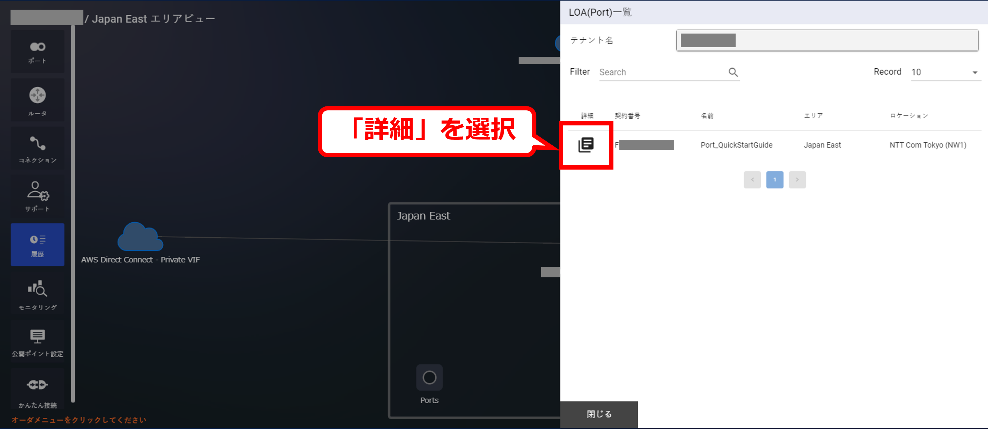 - 物理回線の敷設後、次項に示すアクティベート操作を行ってください。※AWS側の作業(手順:6.7~6.9)についてはポートのアクティベート前でも実施可能です。