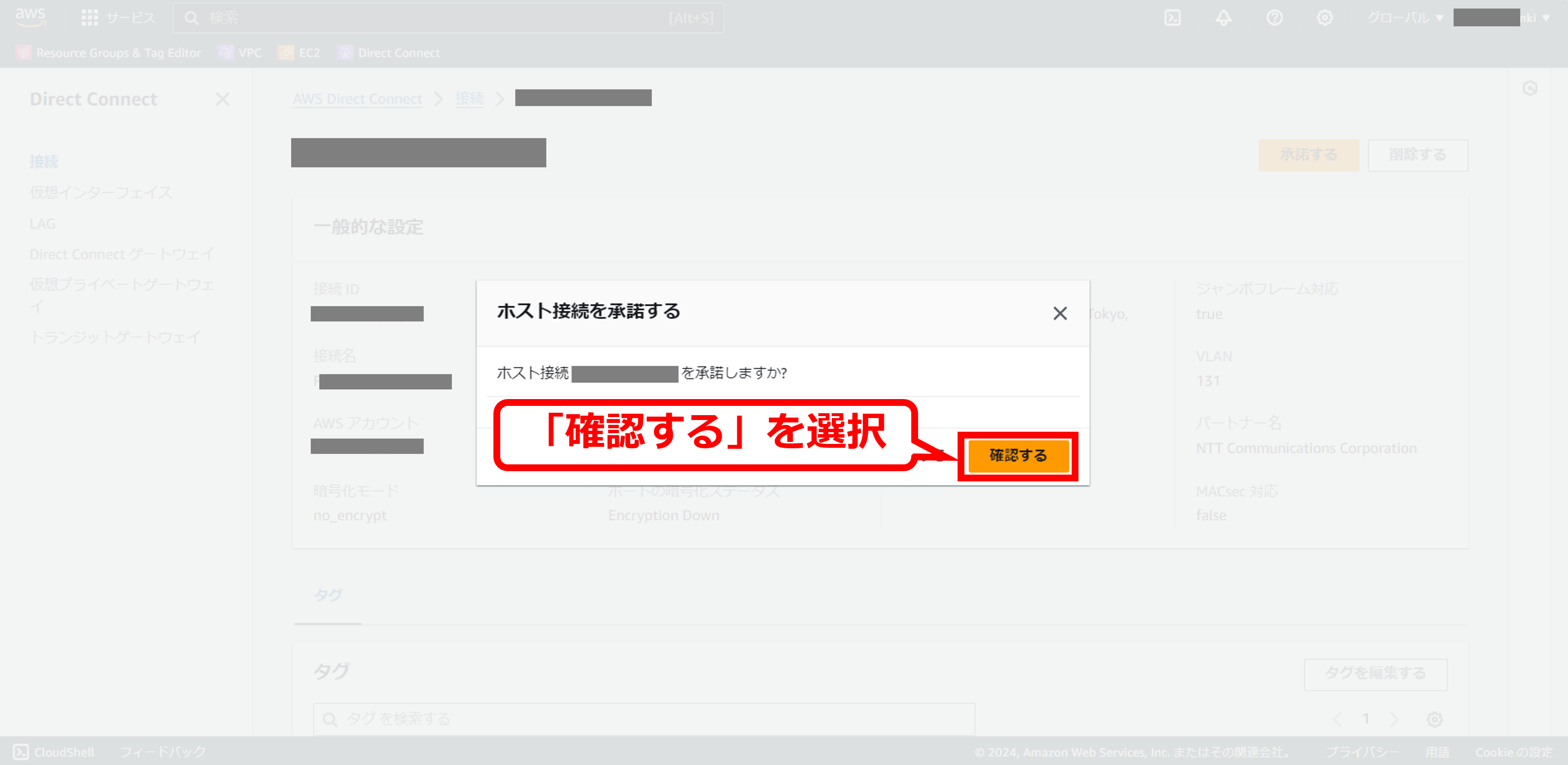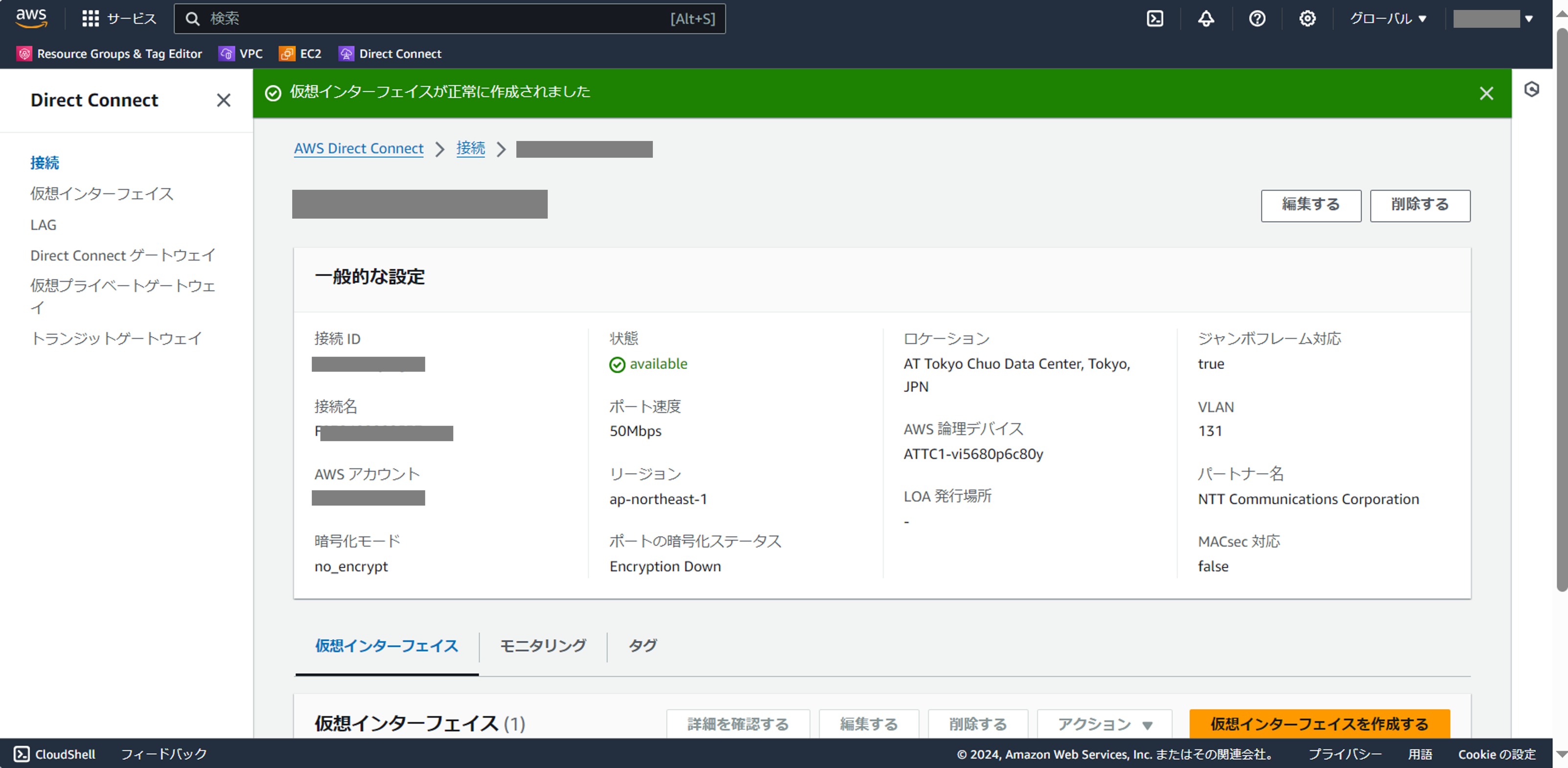 コネクションの承認作業、仮想インターフェイスの作成 |