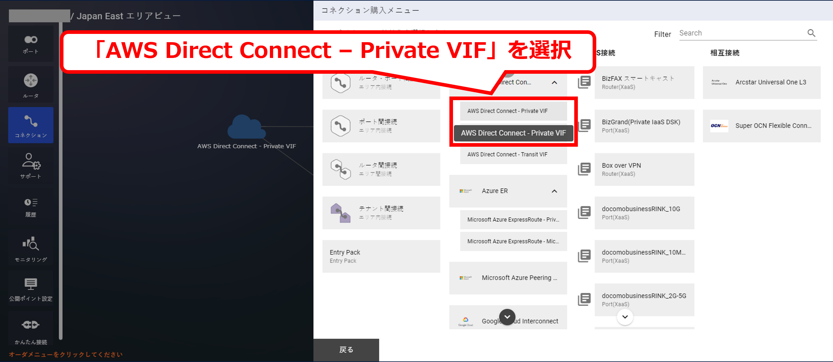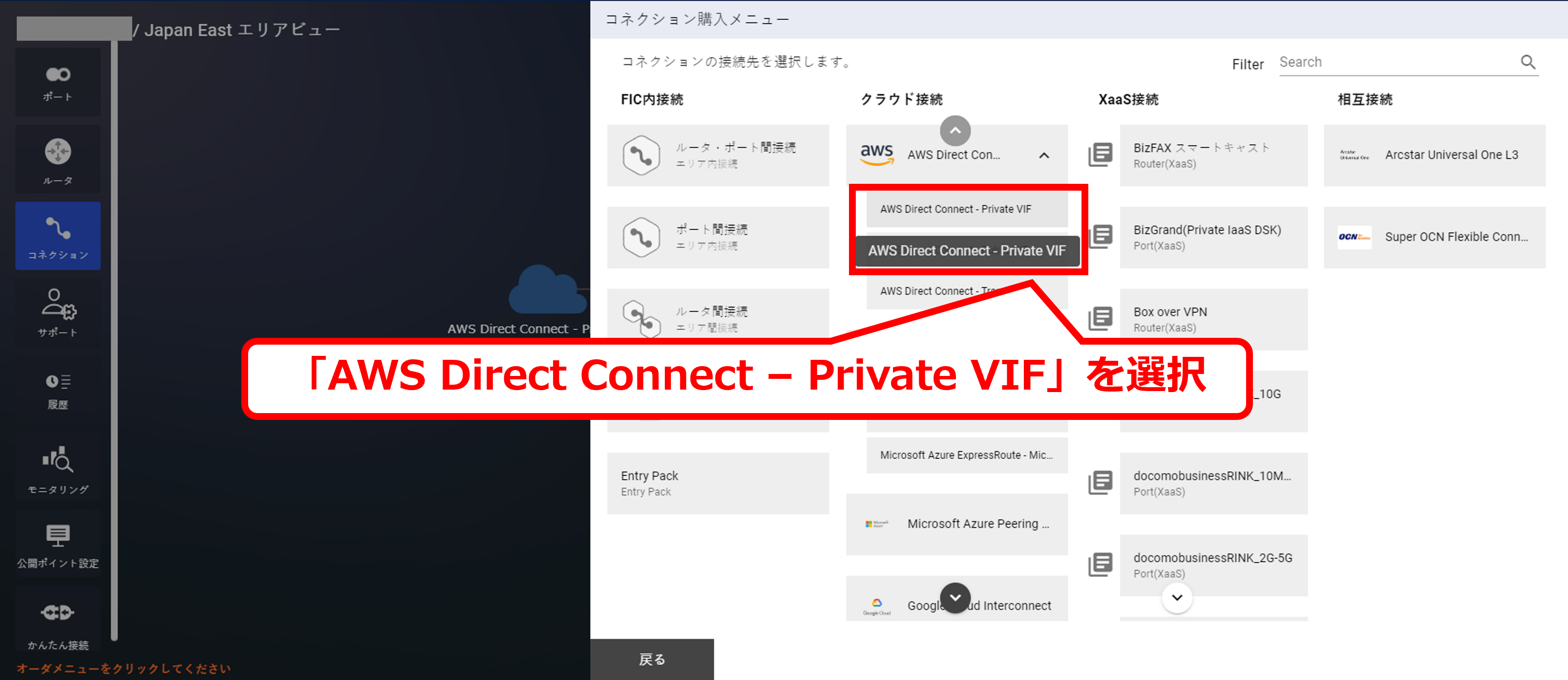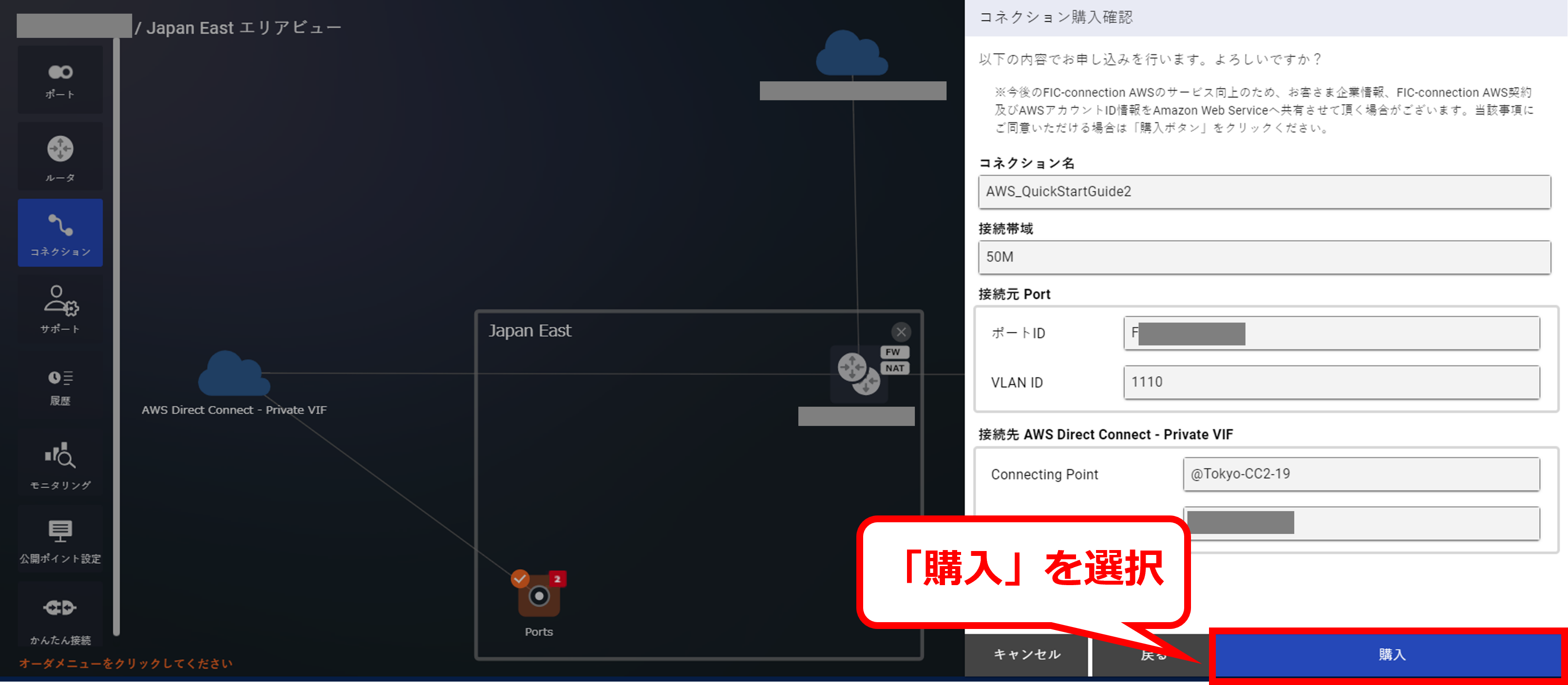 FIC-ConsoleでAWS(Private VIF)のコネクションを購入 |
