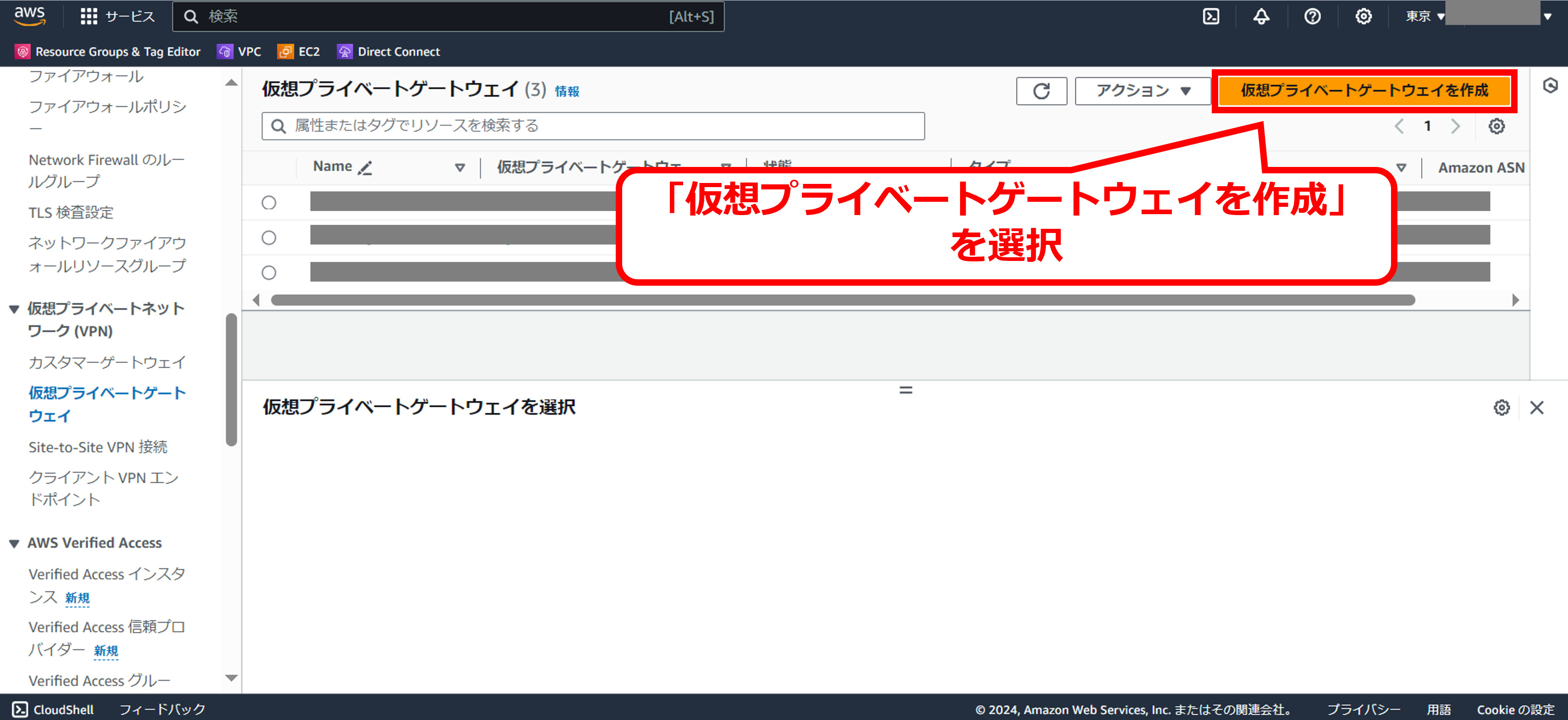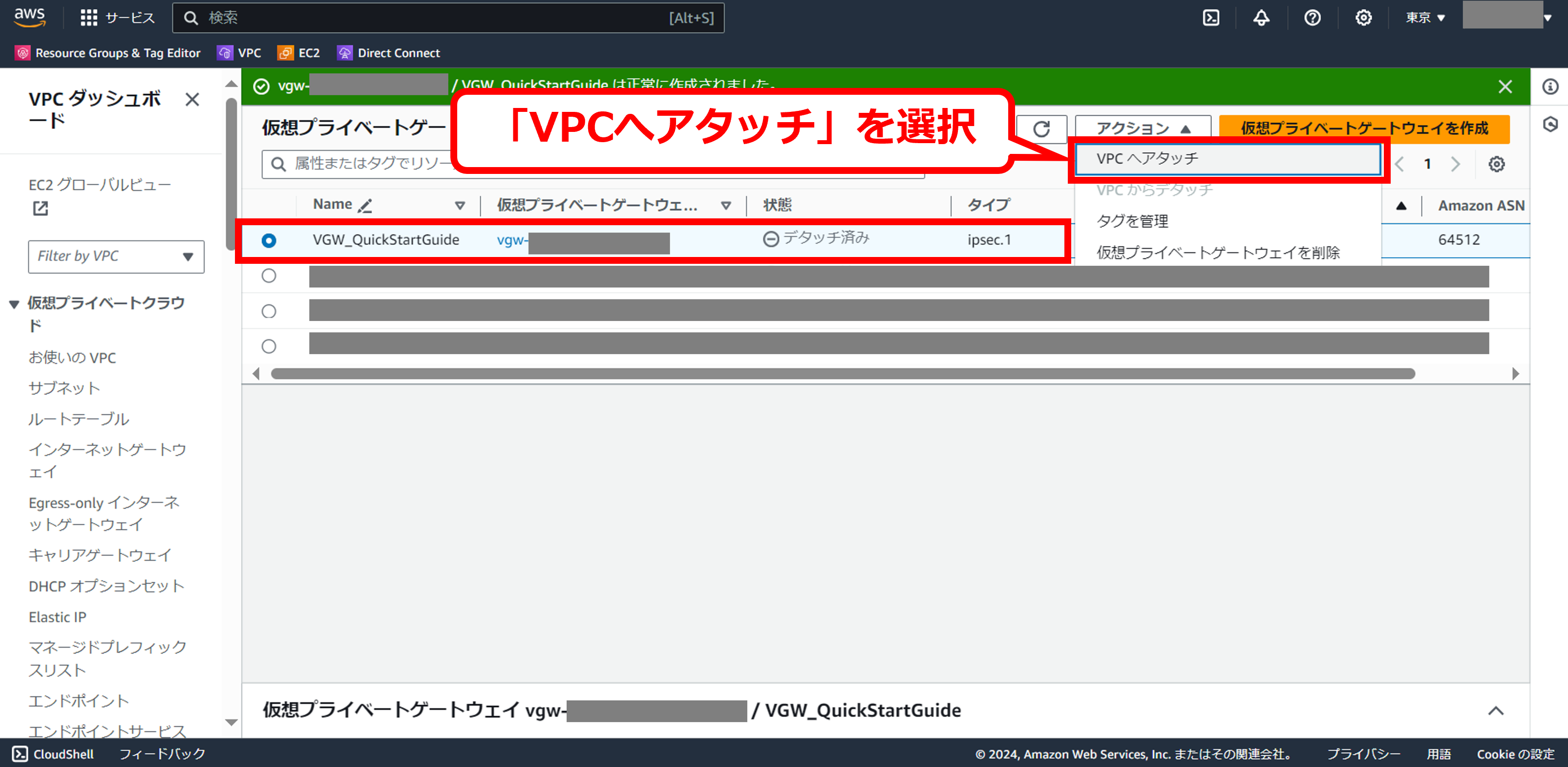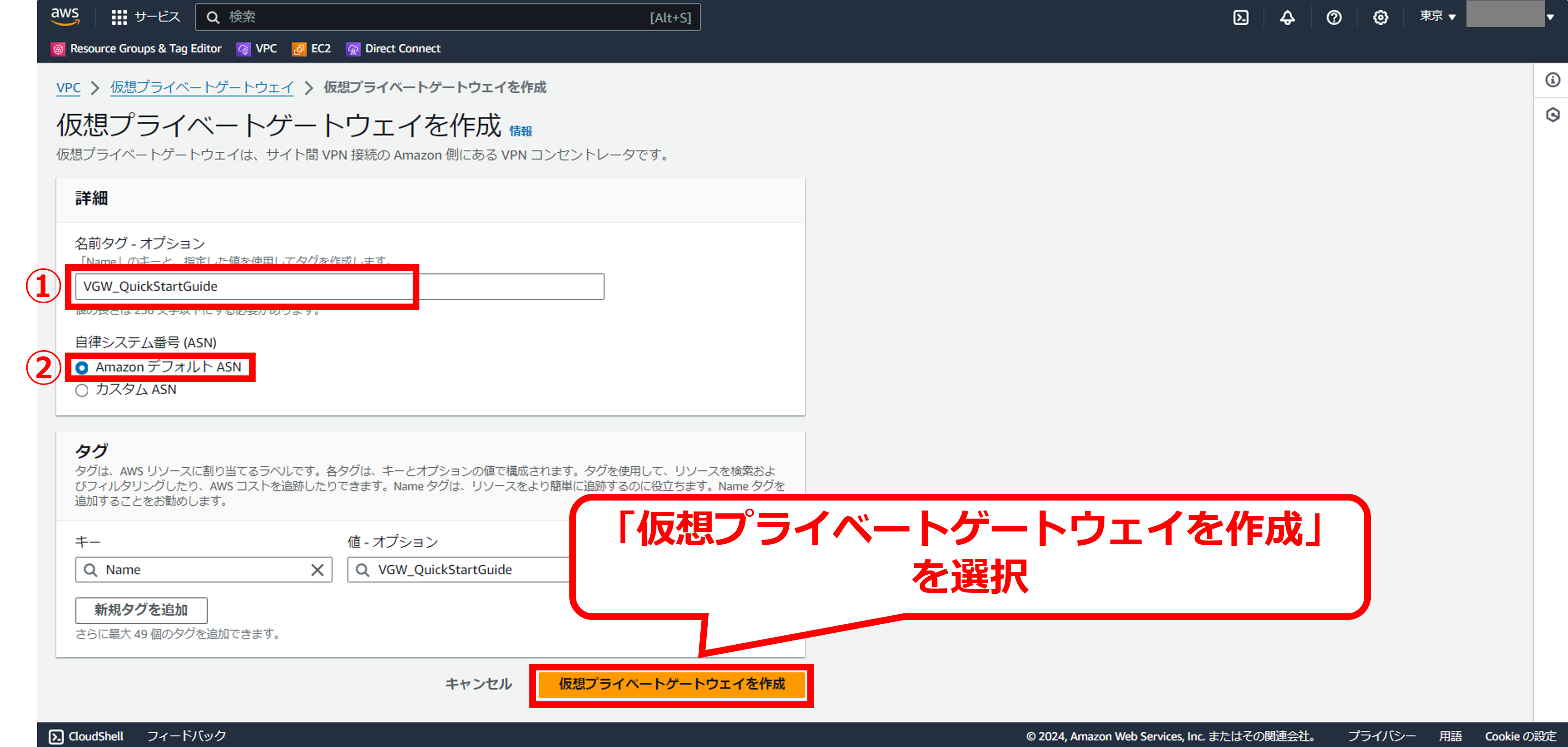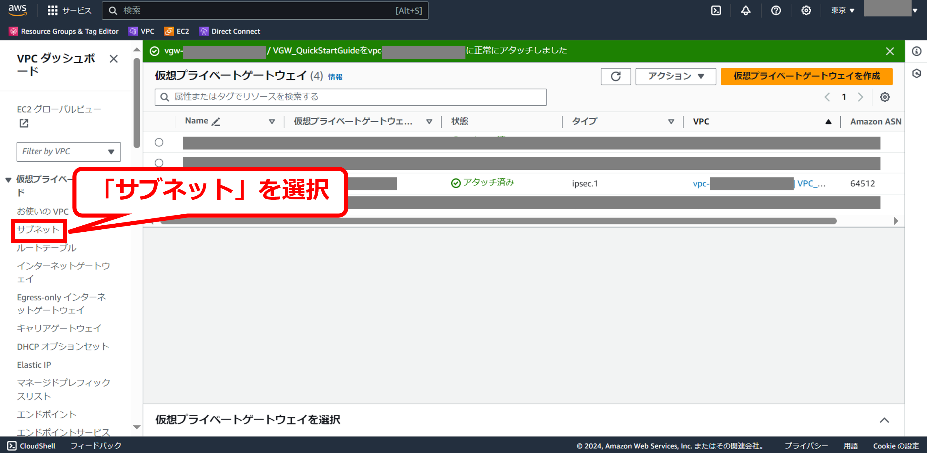 6.7. AWSコンソール作業(VPC、仮想プライベートゲートウェイ等の作成)¶