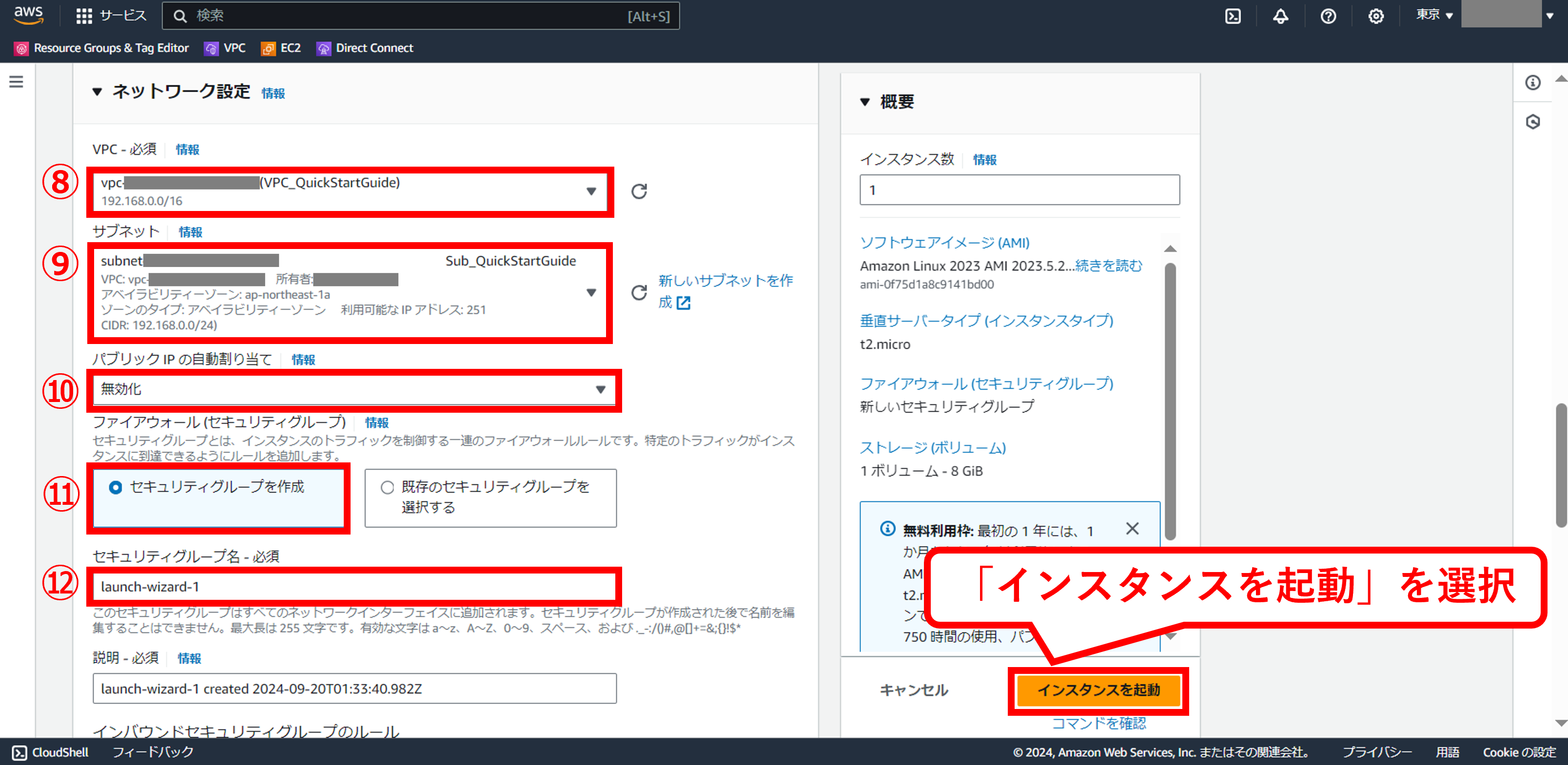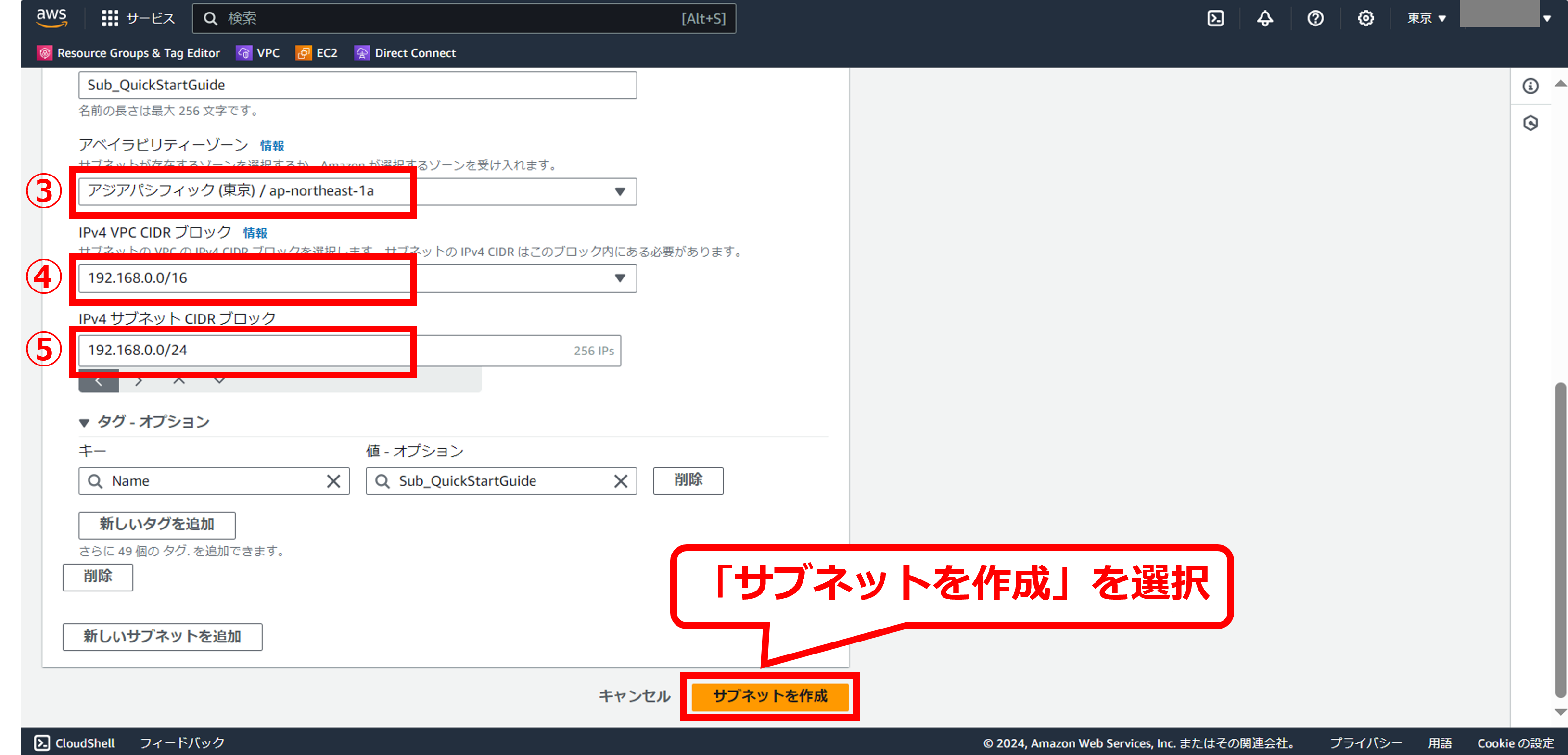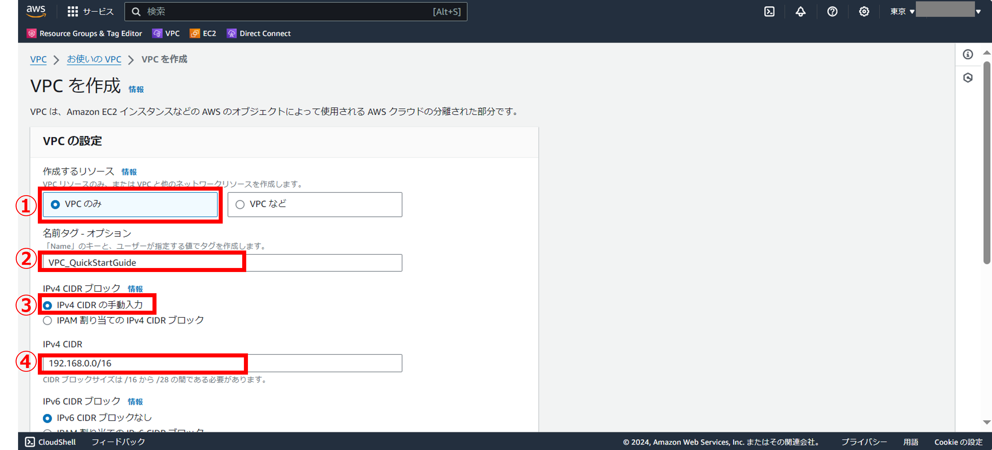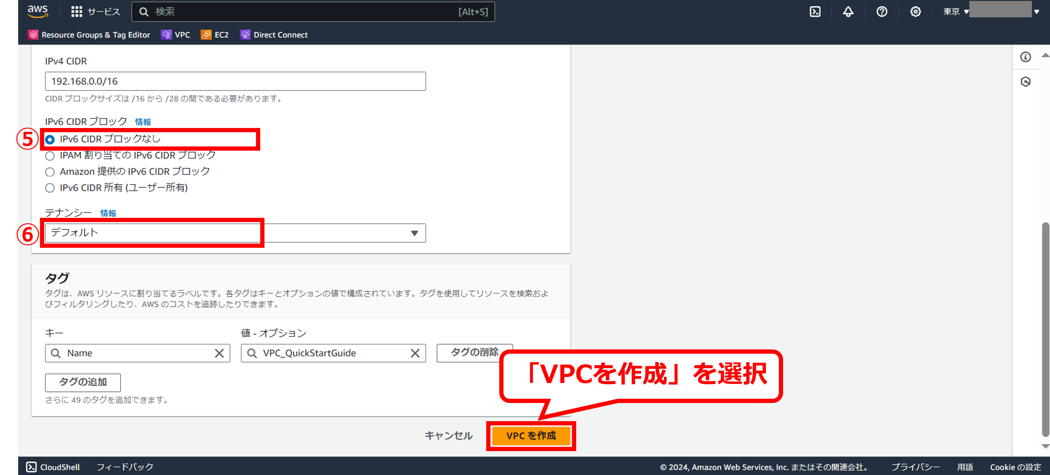 本手順では「IPv6 CIDR ブロックなし」を選択 |
