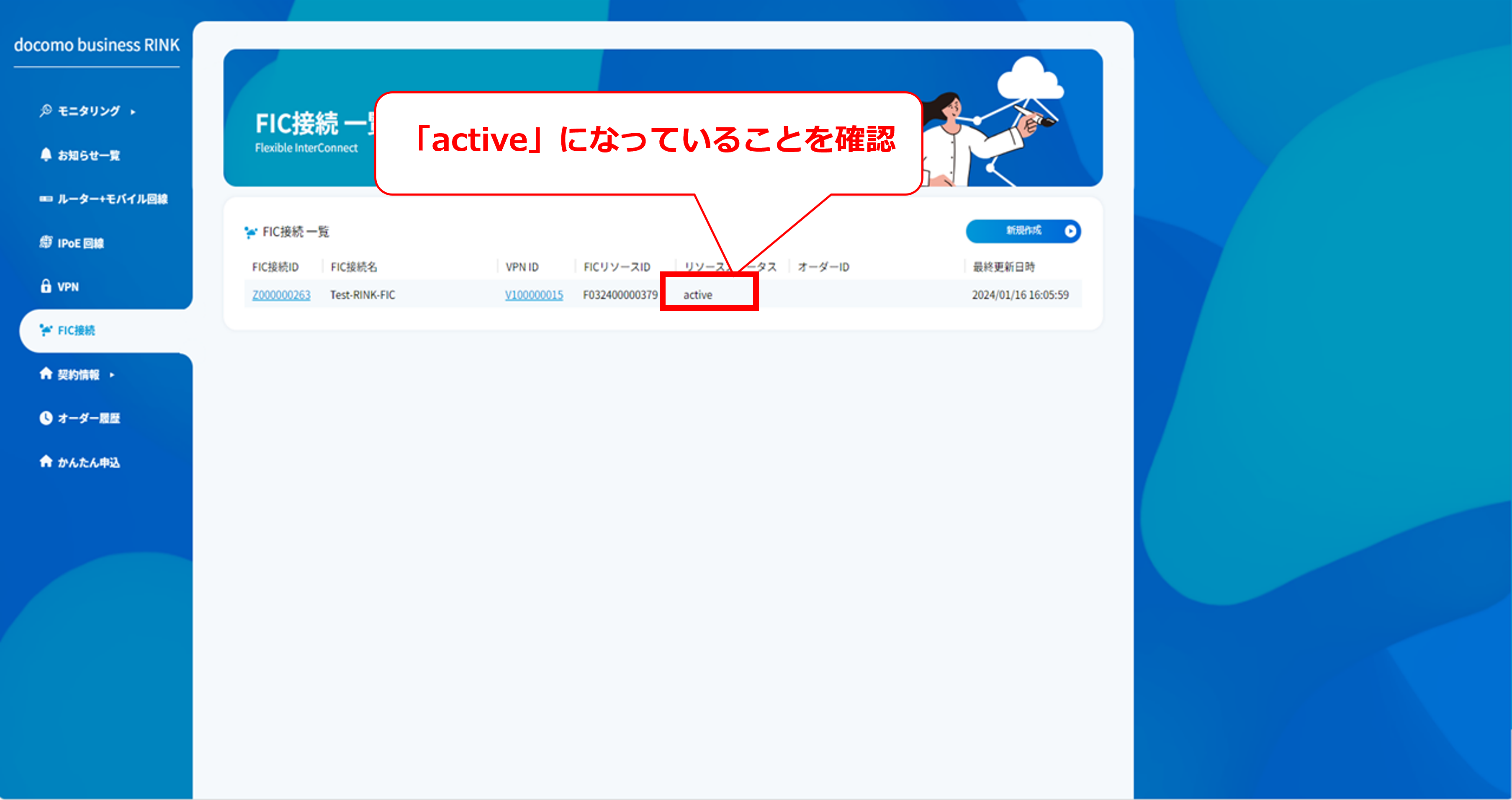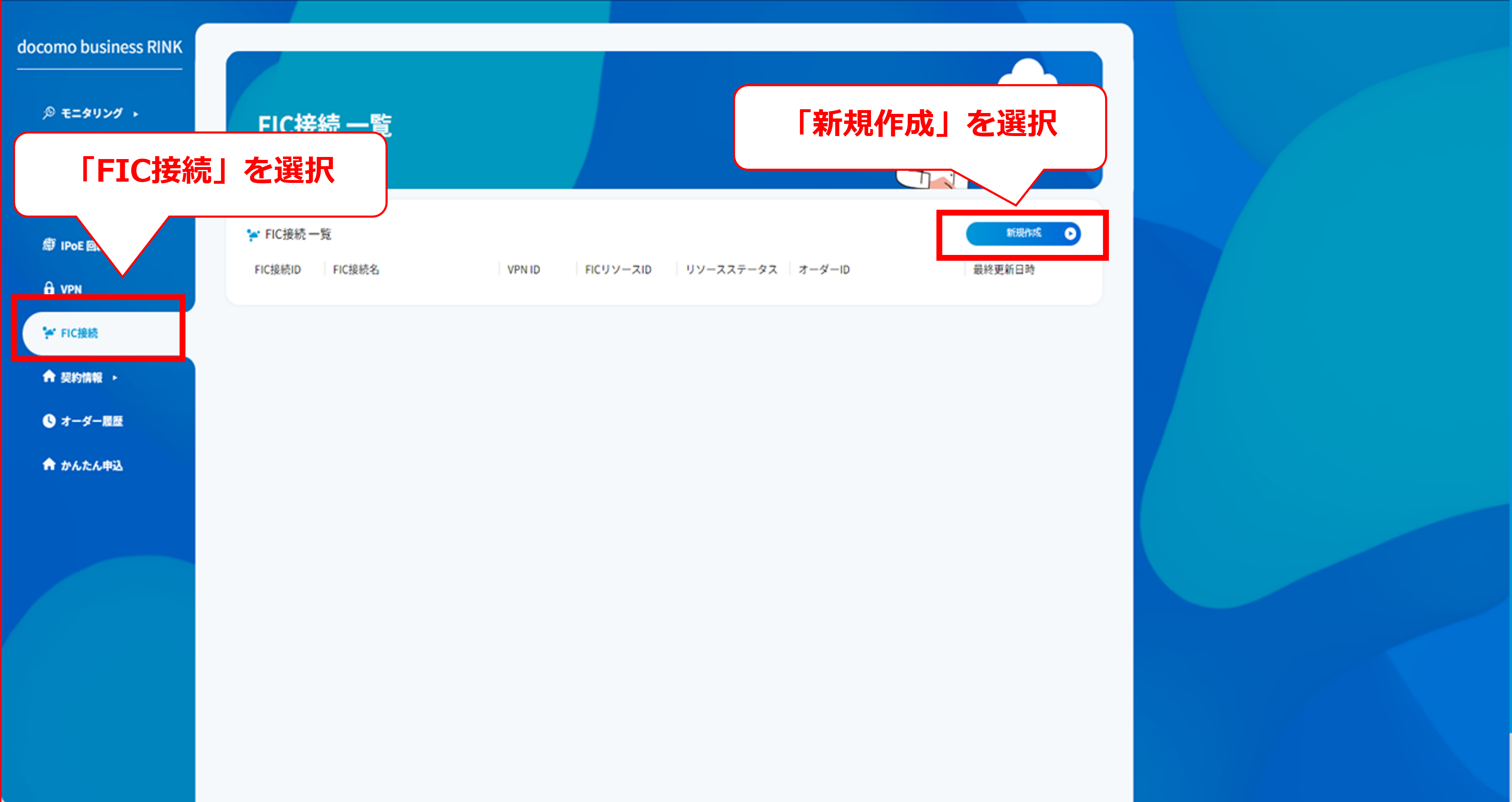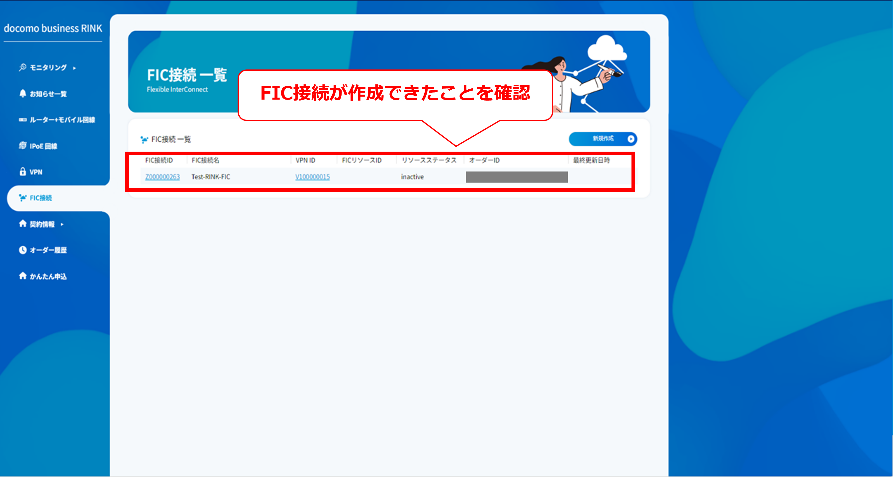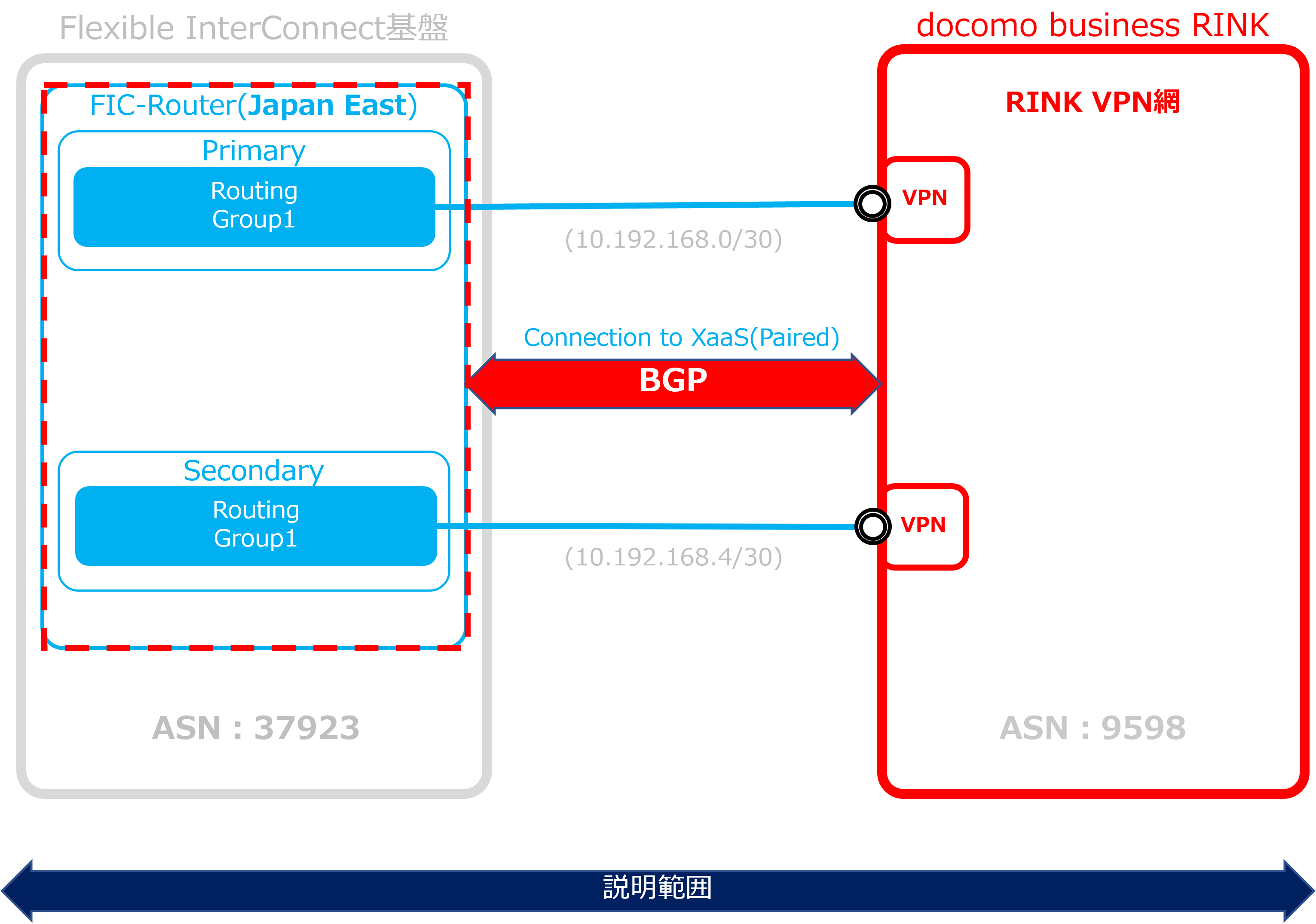 - docomo business RINK セキュアドWANとの接続で利用するFIC-Connectionは、FIC-Connection(XaaS) L3接続 [FIC-Router to FIC-Port (XaaS)]となります。