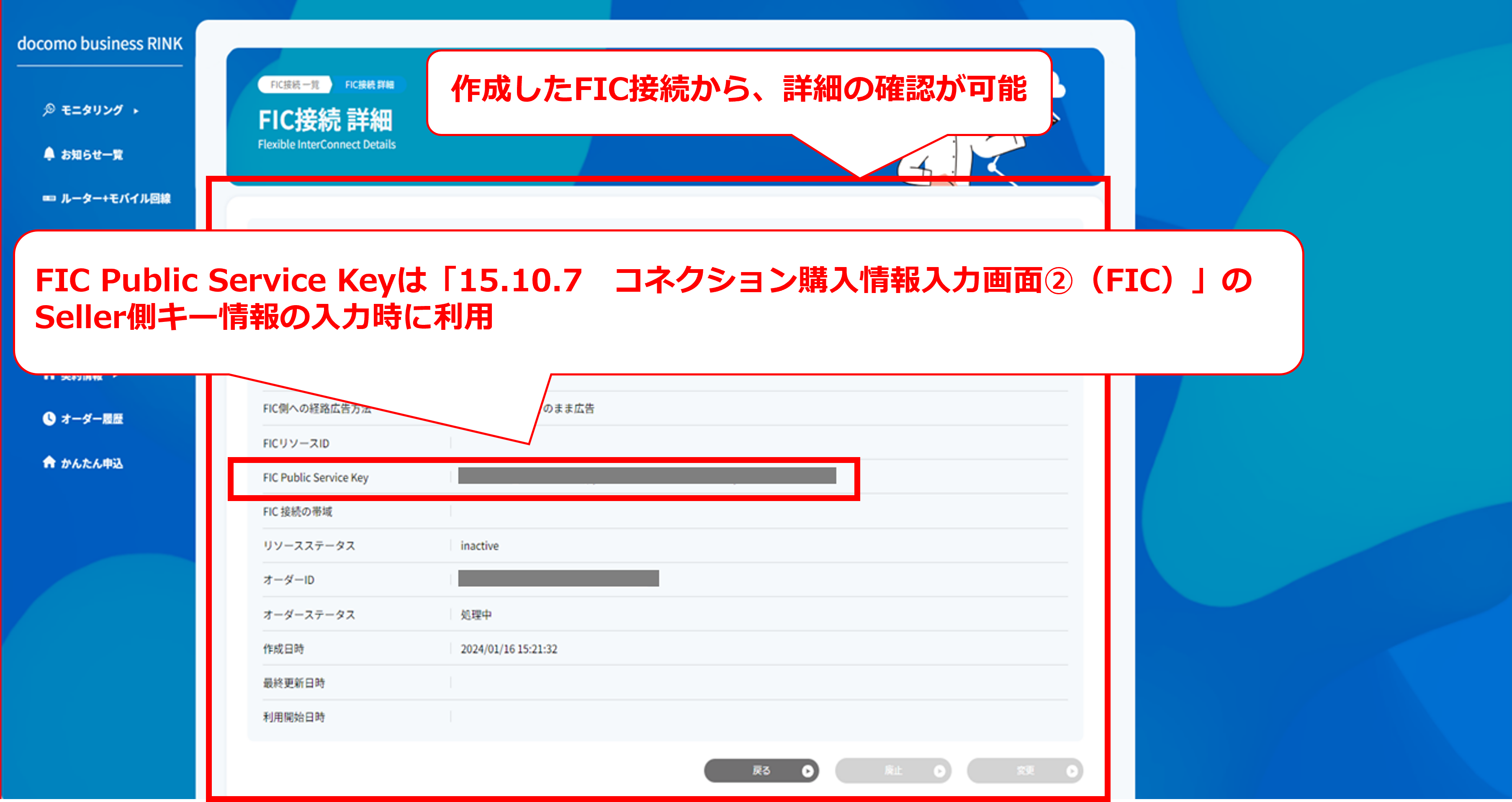 手順「1.8.5 FIC接続の新規作成後の画面②」で確認出来る「FIC Public Service Key」を入力 |