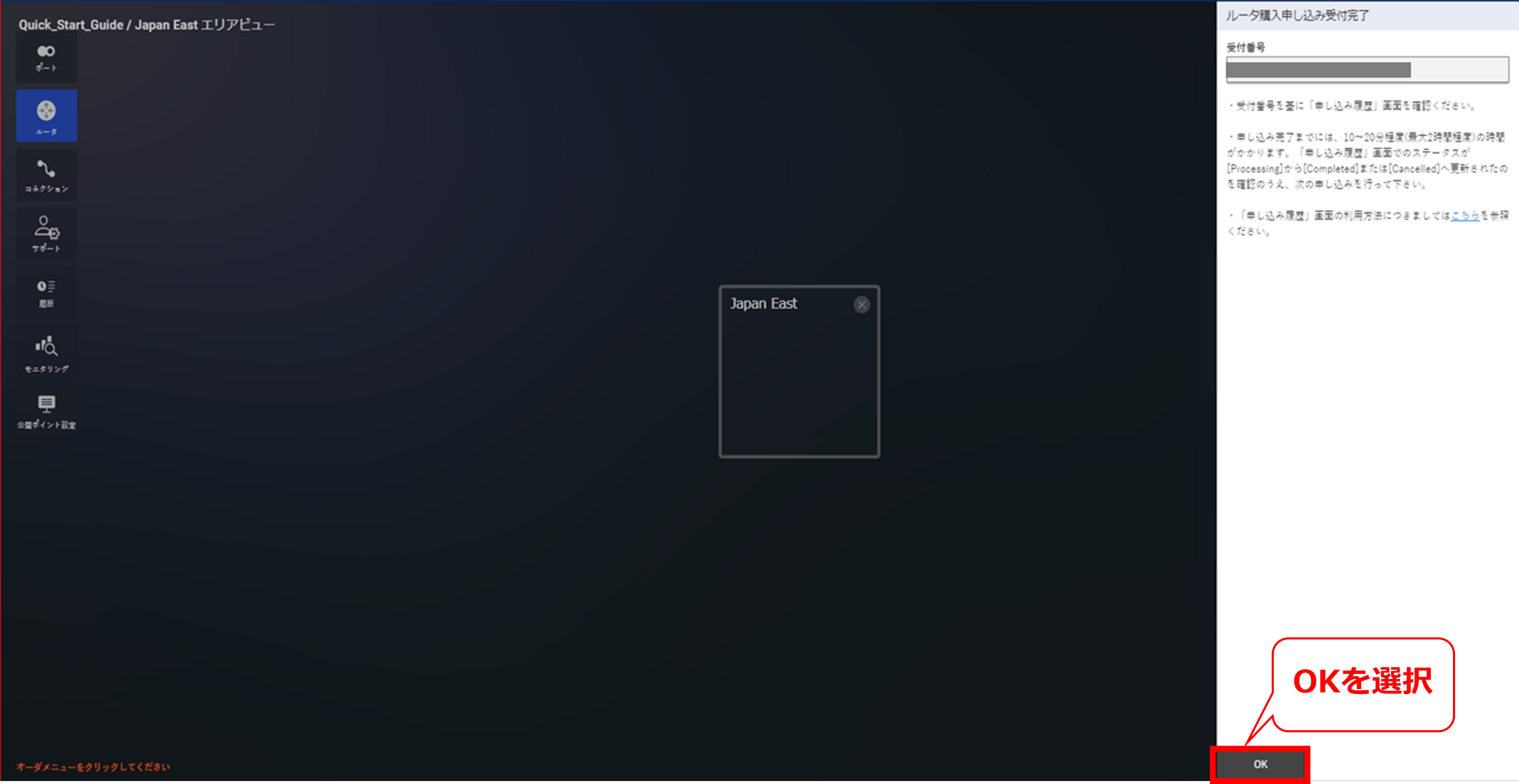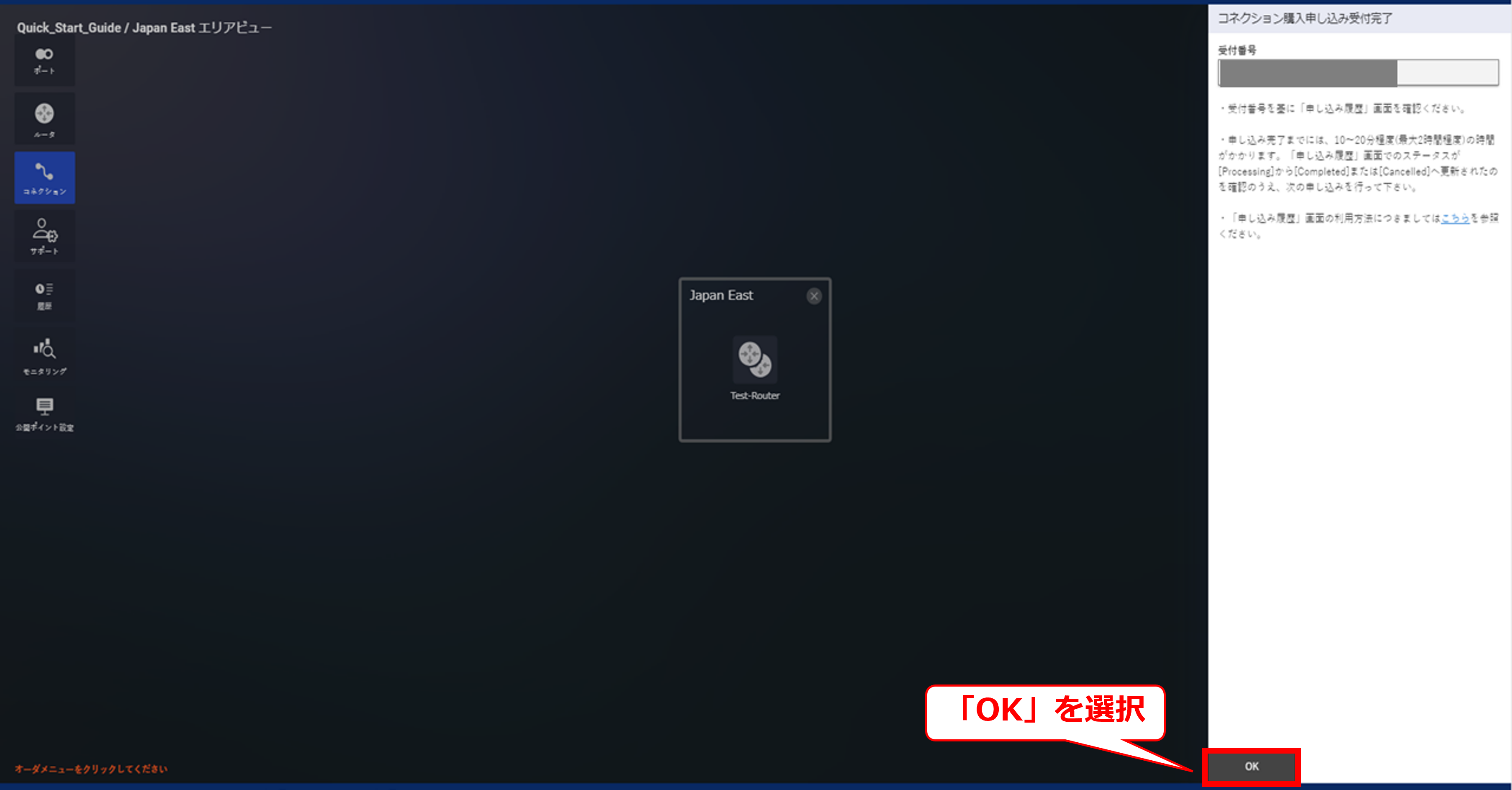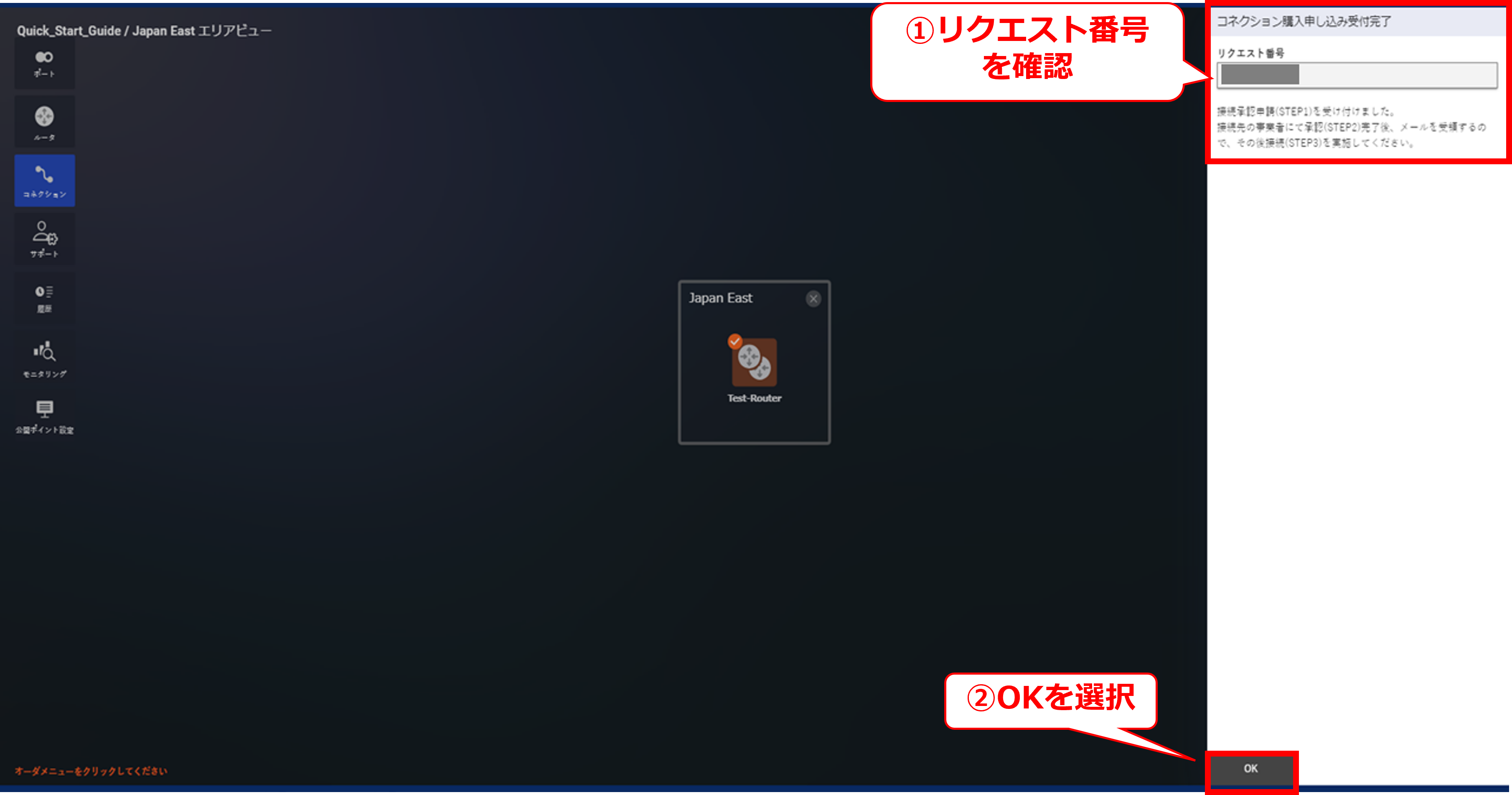 1.10.9 「コネクション購入申し込み受付完了」画面でリクエスト番号が発行されることを確認後、「OK」を選択(FIC)