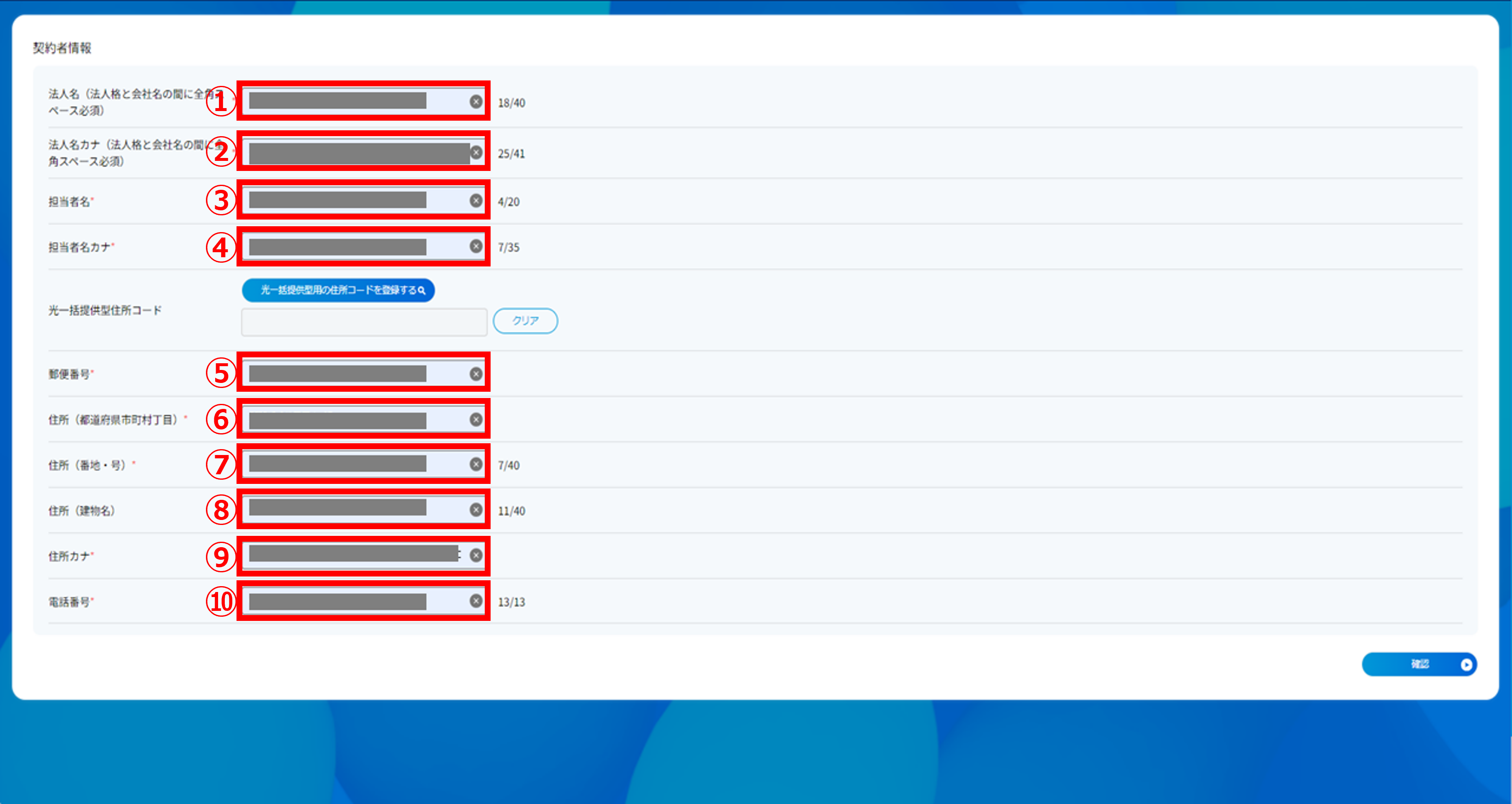 契約の法人さまの住所カナ(番号まで)を入力 |
