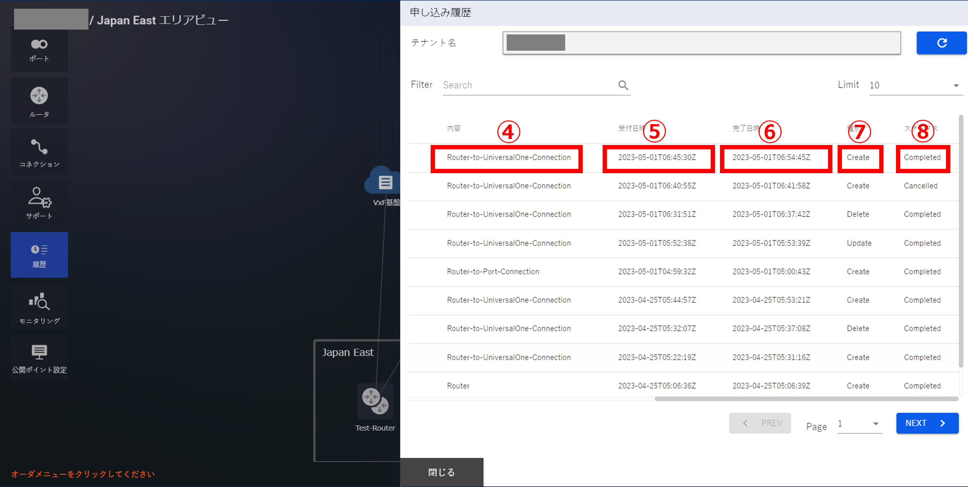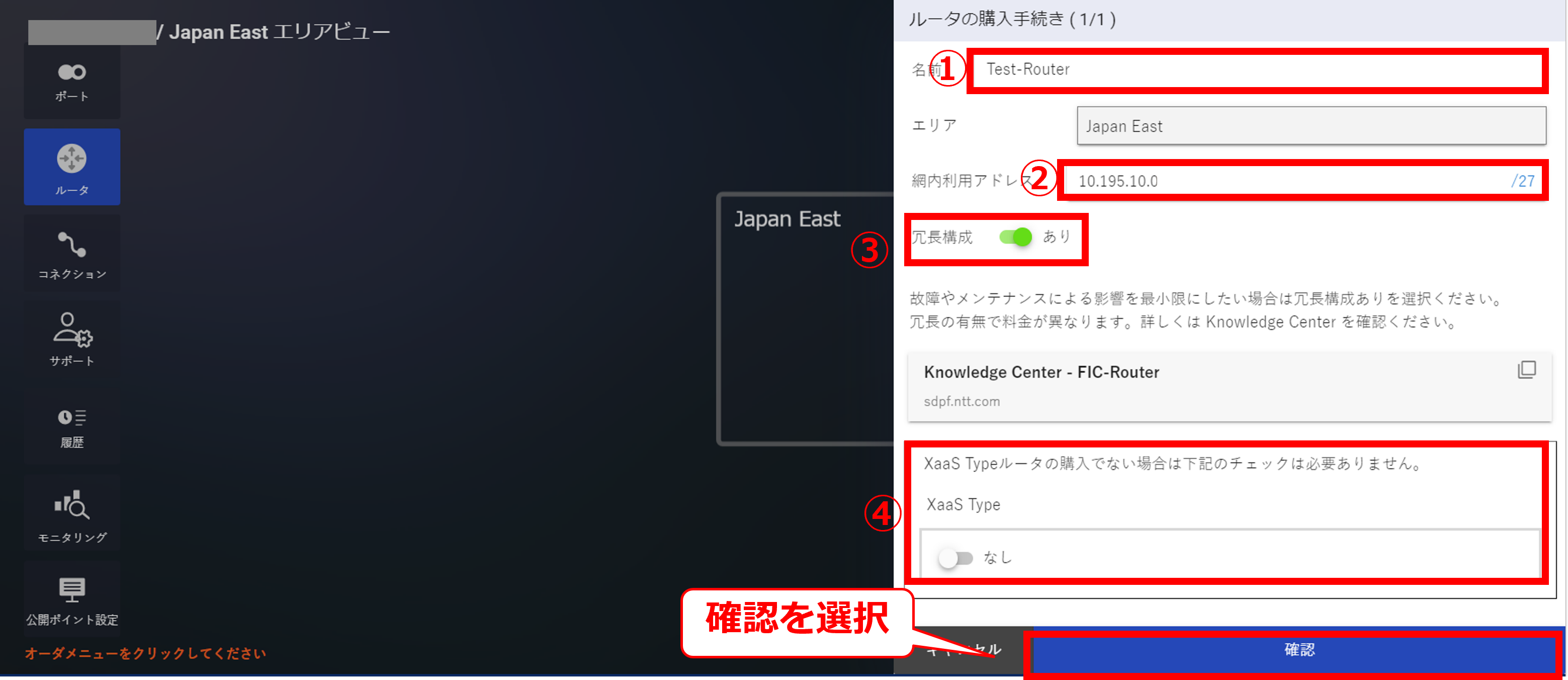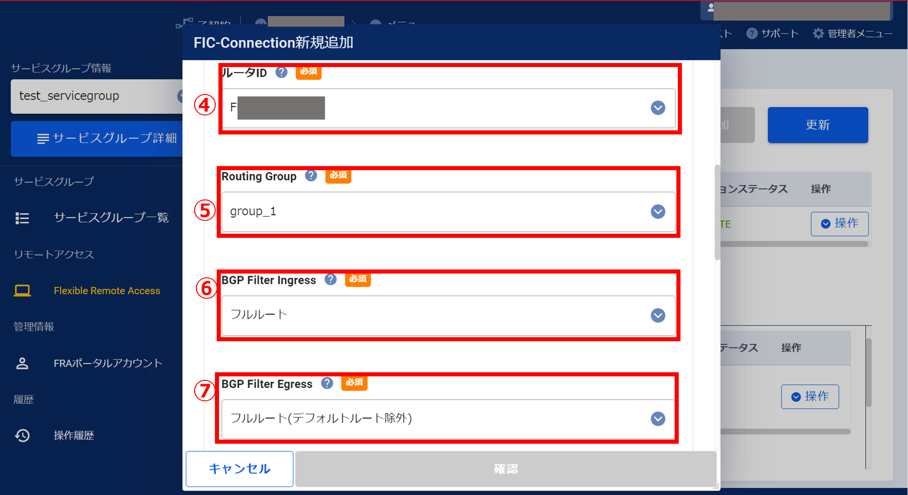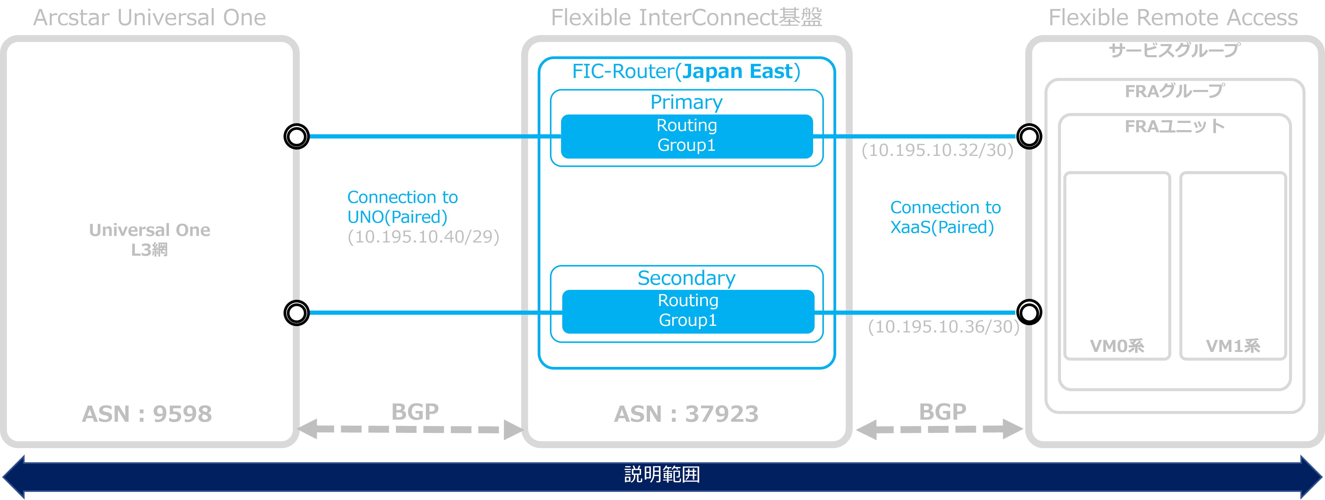 - FRAにFICを接続する場合、FRAグループが所属するテナントと同一テナントのFICからのみ本FRAに接続することが可能です。東日本エリアのFRAに接続するFIC-Routerは、提供エリア:Japan East、冗長有無:Pairedにてお申し込みいただく必要がございます。西日本エリアのFRAに接続するFIC-Routerは、提供エリア:Japan West、冗長有無:Pairedにてお申し込みいただく必要がございます。
