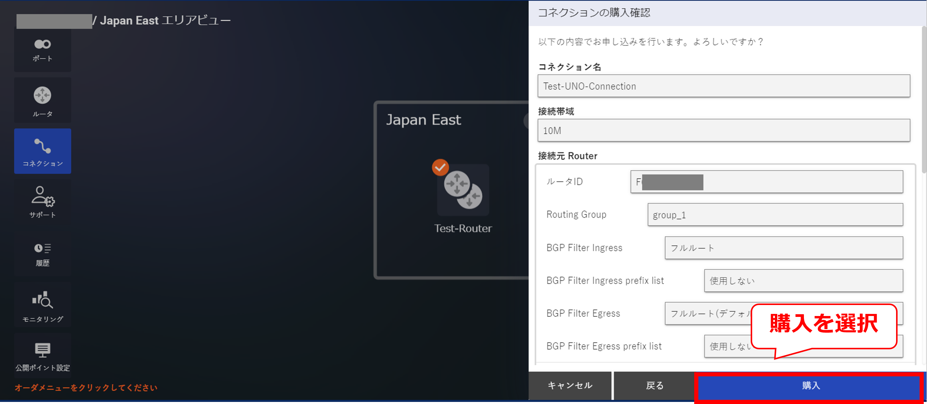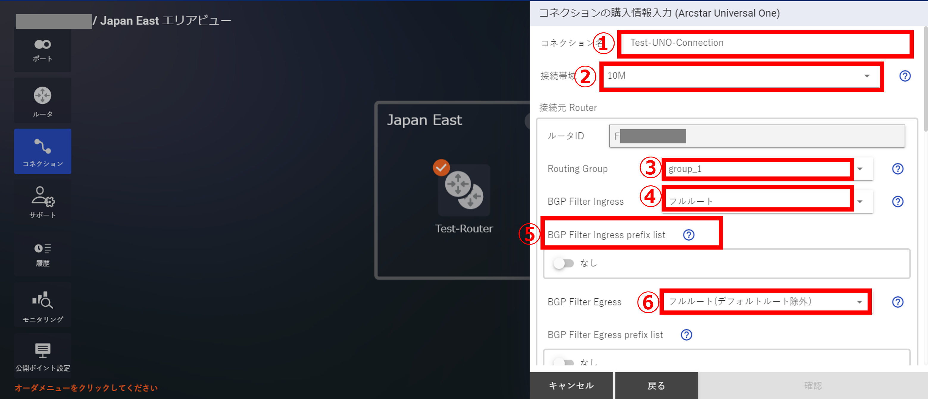 「BGP Filter Ingress」設定にて、「フルルート」を選択すると、